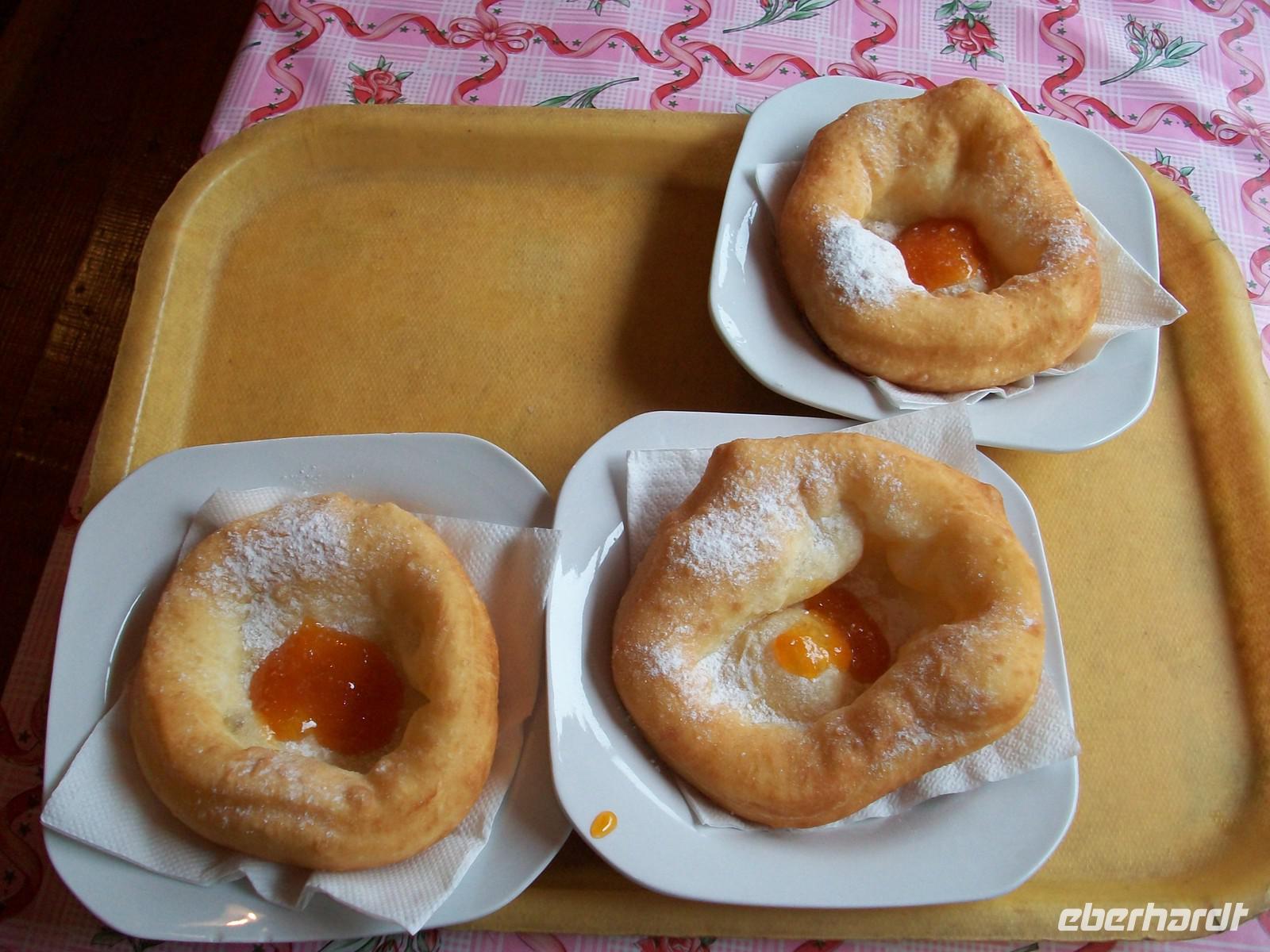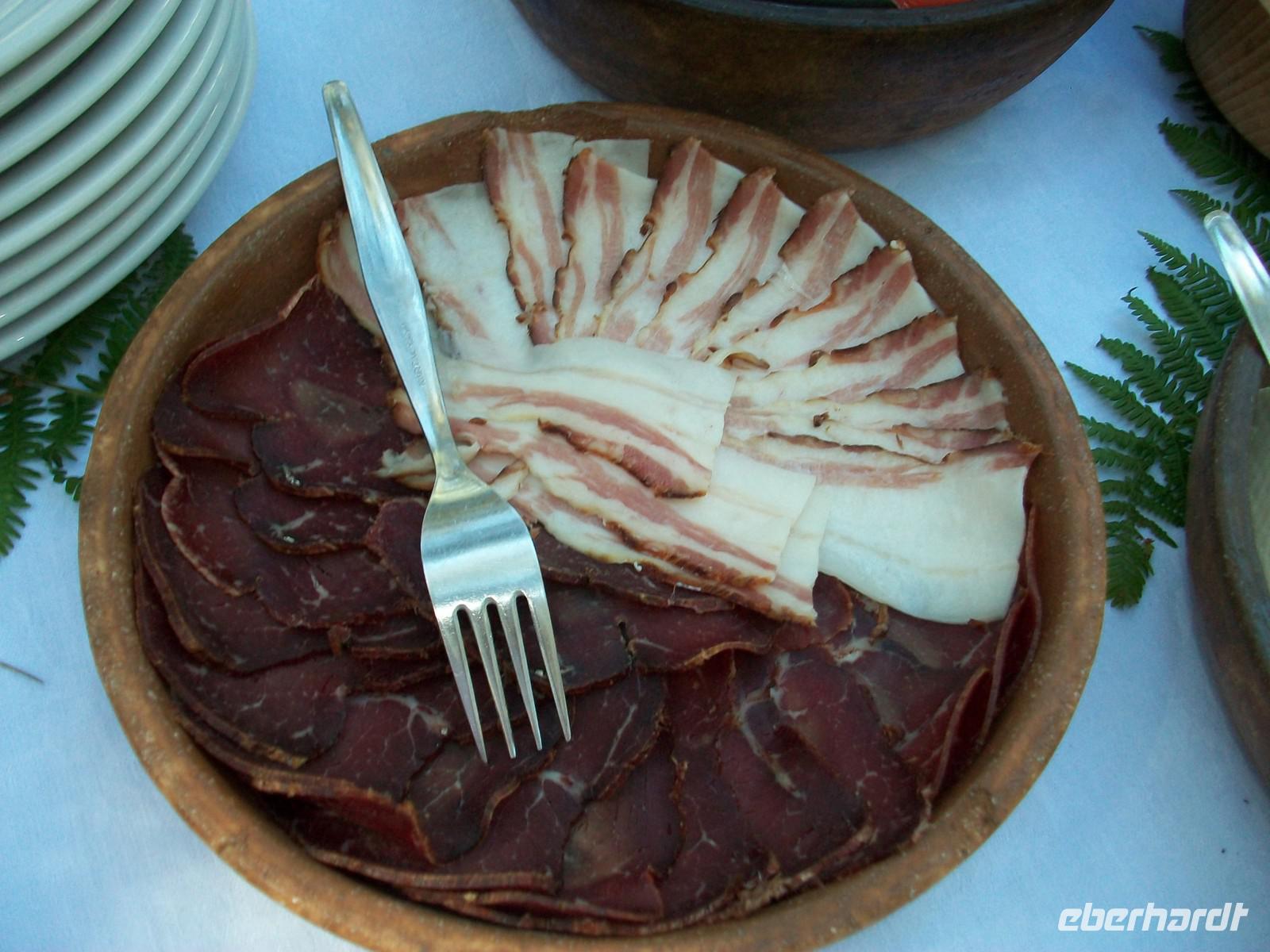 Urplötzlich hört die Straße auf und wir stehen vor dem Restaurant in dem es die Schinkenprobe geben wird. Schnell sind wir durch den Regen ins Restaurant gelangt, hier ist alles dunkel. Wir erfahren von den Wirtsleuten dass seit gestern Abend 160 Mal der Blitz eingeschlagen und dabei die gesamte Stromanlage außer Betrieb gesetzt hat. Aber, der Mittagsimbiss kann dennoch stattfinden und hier in rund 1 600 Metern lassen wir uns nun auf diese besonderen Bedingungen ein. Im etwas dunklen Raum schmeckt uns der leckere Njeguši- Schinken, zum Aufwärmen gibt es einen Schnaps und unsere gemütliche Runde hat viel Spaß an den außergewöhnlichen Bedingungen. Dabei heult der Sturm ums Haus und treibt die Wolken an den Fenstern vorbei. Leider ist an einen Aufstieg zum Mausoleum heute überhaupt nicht zu denken; wir genehmigen uns noch einen Kaffee, dazu gibt es Krapfen und einheimischen Honig, dann beginnt die Abfahrt.