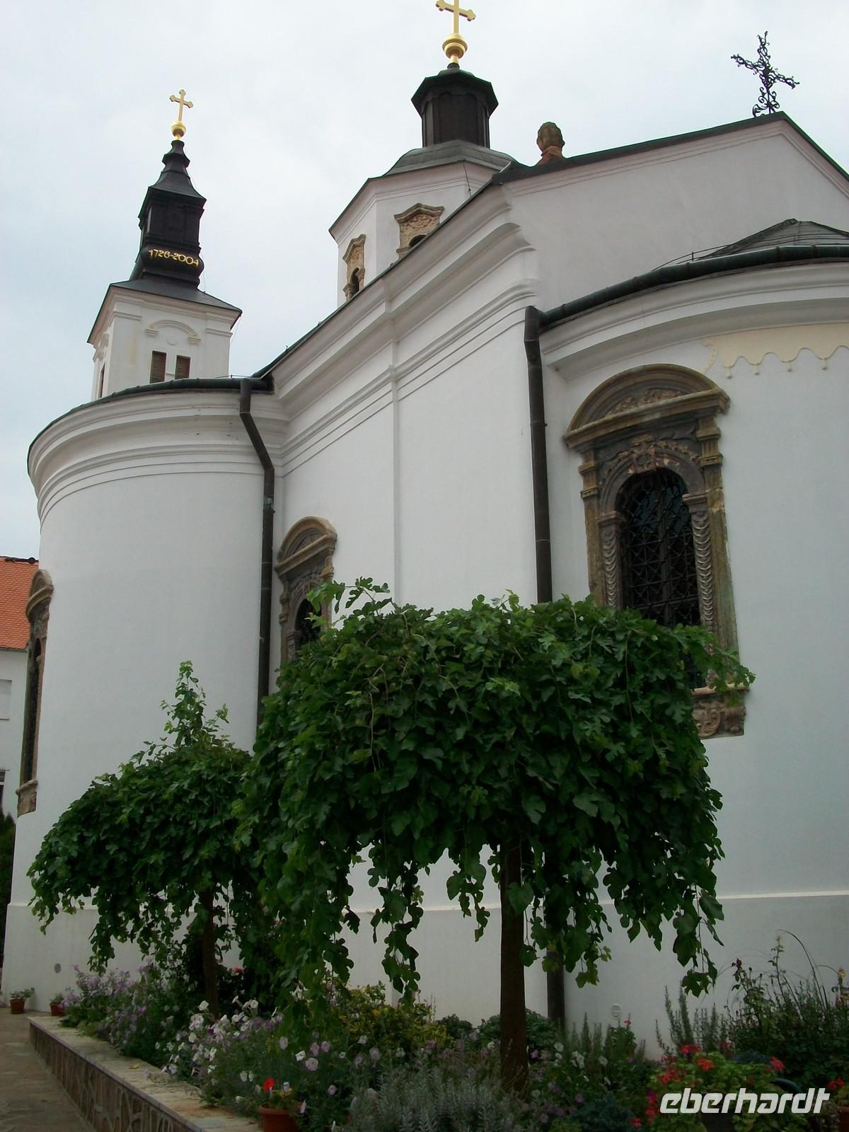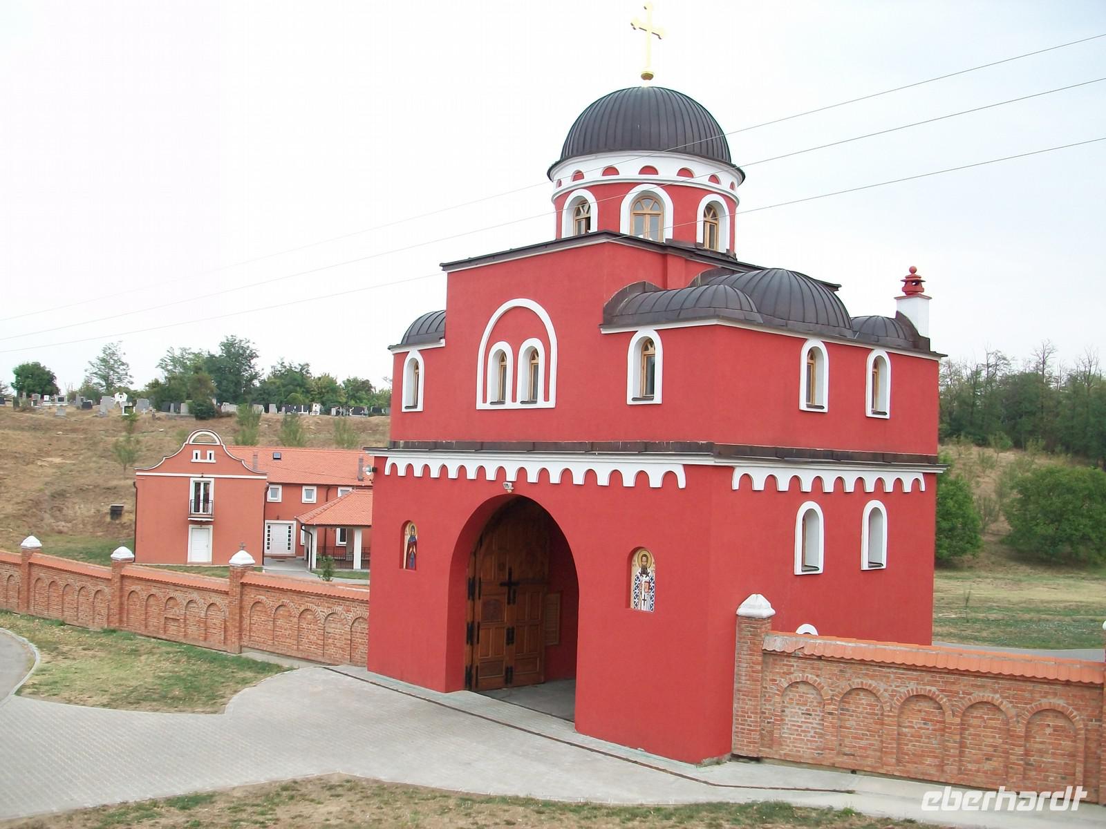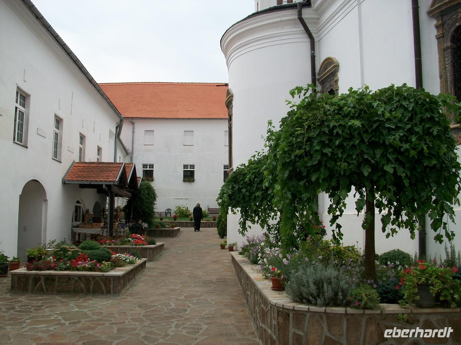Nach dem bäuerlichen Leben sind wir nun auf dem Weg die Religion dieser Gegend kennen zu lernen. Es sind nur wenige Kilometer von Maradik zum Kloster Krušedol, die Fahrt verläuft recht abenteuerlich auf einer schmalen Straße. Bald ist das rote Gebäude zu sehen welches den Eingang zum Kloster markiert. Wir sind kurz nach zehn hier angelangt und mit Bogdanka bald unterwegs ins Hauptgebäude zu gelangen. Im Innenhof ist alles sehr gepflegt, es sind auch einige Mönche in ihren typischen langen Kutten zu sehen die gegenüber den Touristen keinerlei Berührungsängste zeigen. Gepflegt sind hier im Innenhof die Grünanlagen und bald tauchen wir ein in die Klosterkirche. Hier drinnen ist alles mit schönen Wandmalereien versehen, sie sind uns aus den verschiedensten Zeitepochen erhalten geblieben und Bogdanka führt uns nun ein in die Geheimnisse einer uns fremden Religion- der serbischen Orthodoxie. Es sind für uns doch fremde Riten und an diesem feierlichen Ort wird alles lebendig was uns die vergangenen Jahrhunderte überliefert haben.