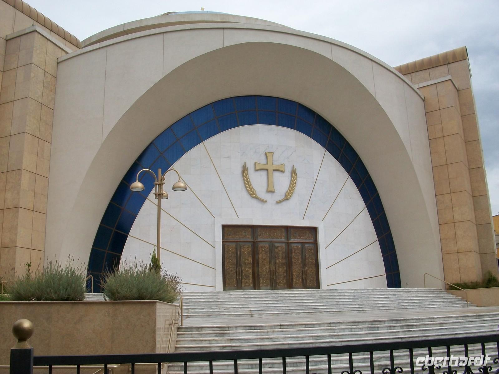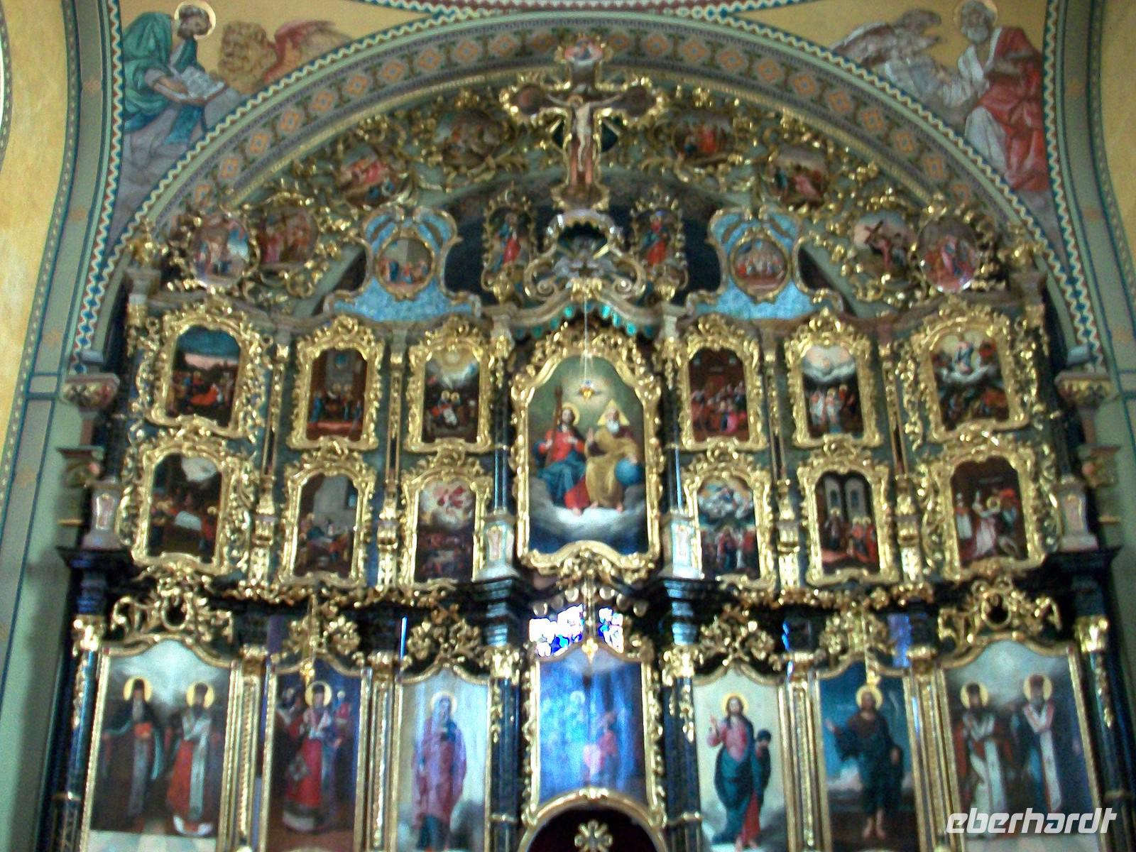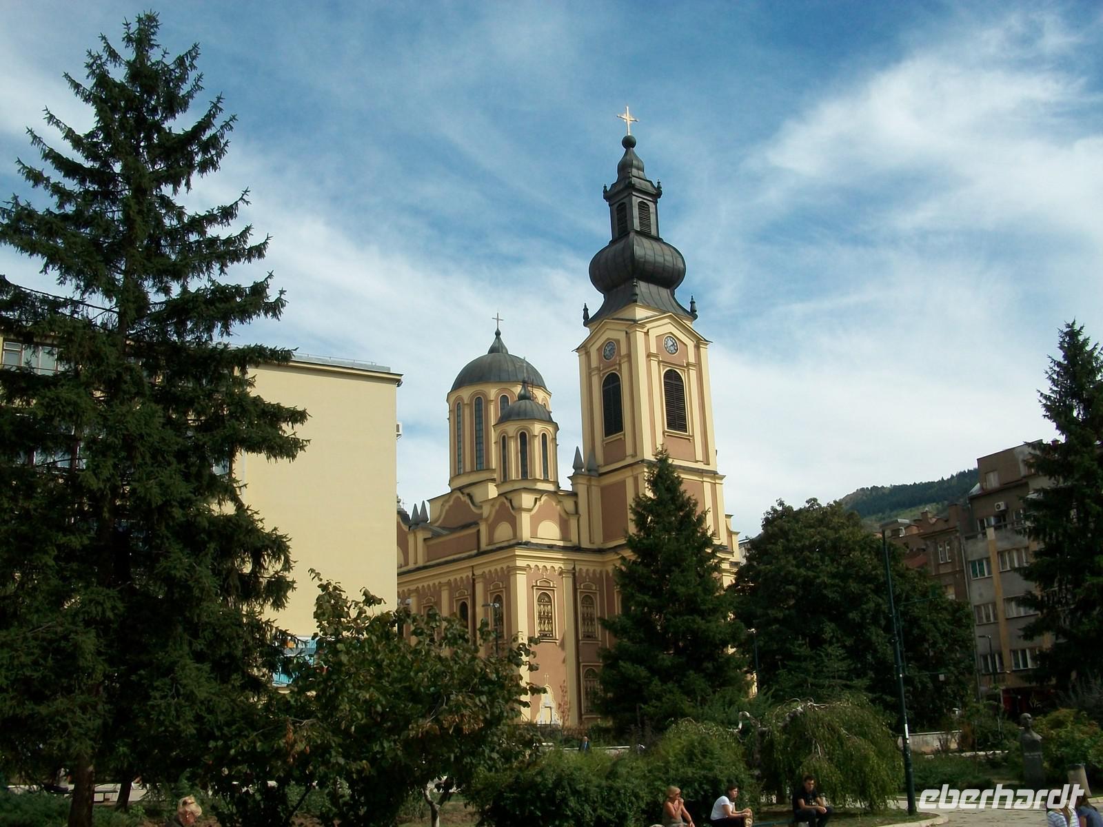 Wie beginnen am Ewigen Feuer, es brennt an einer etwas unruhigen Straßenecke und erinnert an die Opfer des 2.Weltkrieges. Dann sind wir im Habsburger Teil unterwegs, wir sehen die Häuser der Gründerzeit die uns doch auch irgendwie an Wien erinnern. Ein barockes Gepräge hat auch die serbisch- orthodoxe Kirche in die wir nun eintreten. Hier ist alles frisch renoviert und erstrahlt in feierlichen Glanz. Besonders schön ist die Ikonenwand gearbeitet die erst vor wenigen Tagen enthüllt wurde. Belma macht uns hier mit der Orthodoxie vertraut und führt uns danach um einige Straßenecken zur Katholischen Kathedrale. Auch dieser Bau hat eine sehr schöne Innenausstattung mit einer kleinen Friedentaube die der Papst Johannes Paul 2. als Geschenk mitgebracht hat.