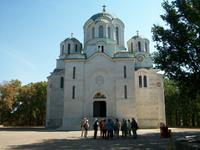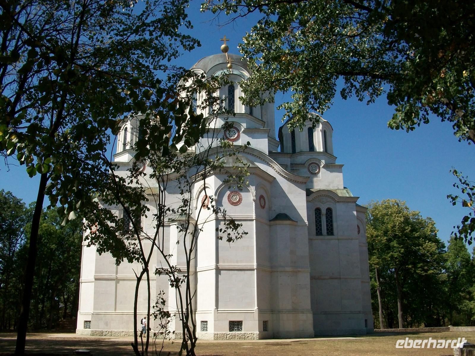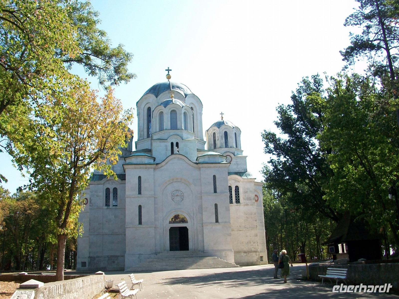 Kurz nach zehn ist von Ferne schon der Hügel von Oplenac zu sehen, die Spitze krönt die Kuppel der orthodoxen Kirche die nun unser erstes Ziel ist. Wir steigen unterhalb des Hügels aus uns haben einen Weg bergauf zu bewältigen. Die Bäume stehen hier nicht allzu dicht, die Strahlen der Sonne werfen schräge Bahnen durch das Geäst und in der Frische des Vormittags langen wir bald oben an. Am höchsten Punkt des Berges ist die monumentale Kirche erbaut die in ihrer Krypta die Gräber der serbischen Königsfamilie beherbergt. Dieser Ort ist serbisches Nationalheiligtum und als wir den Innenraum der Kirche betreten, macht sich eine große Feierlichkeit bemerkbar. Der gesamte Raum ist mit phantastischen Mosaiken besetzt, wir können nur staunend auf diese wundervolle Arbeit blicken.