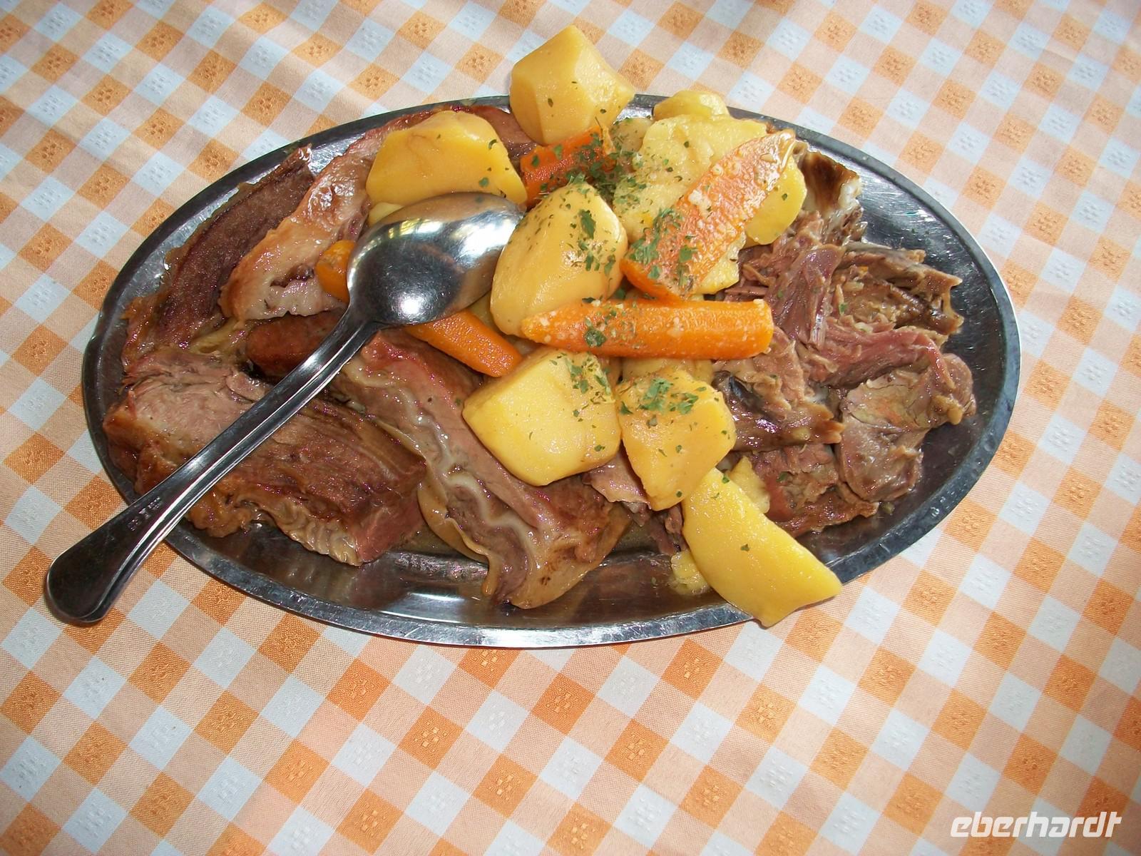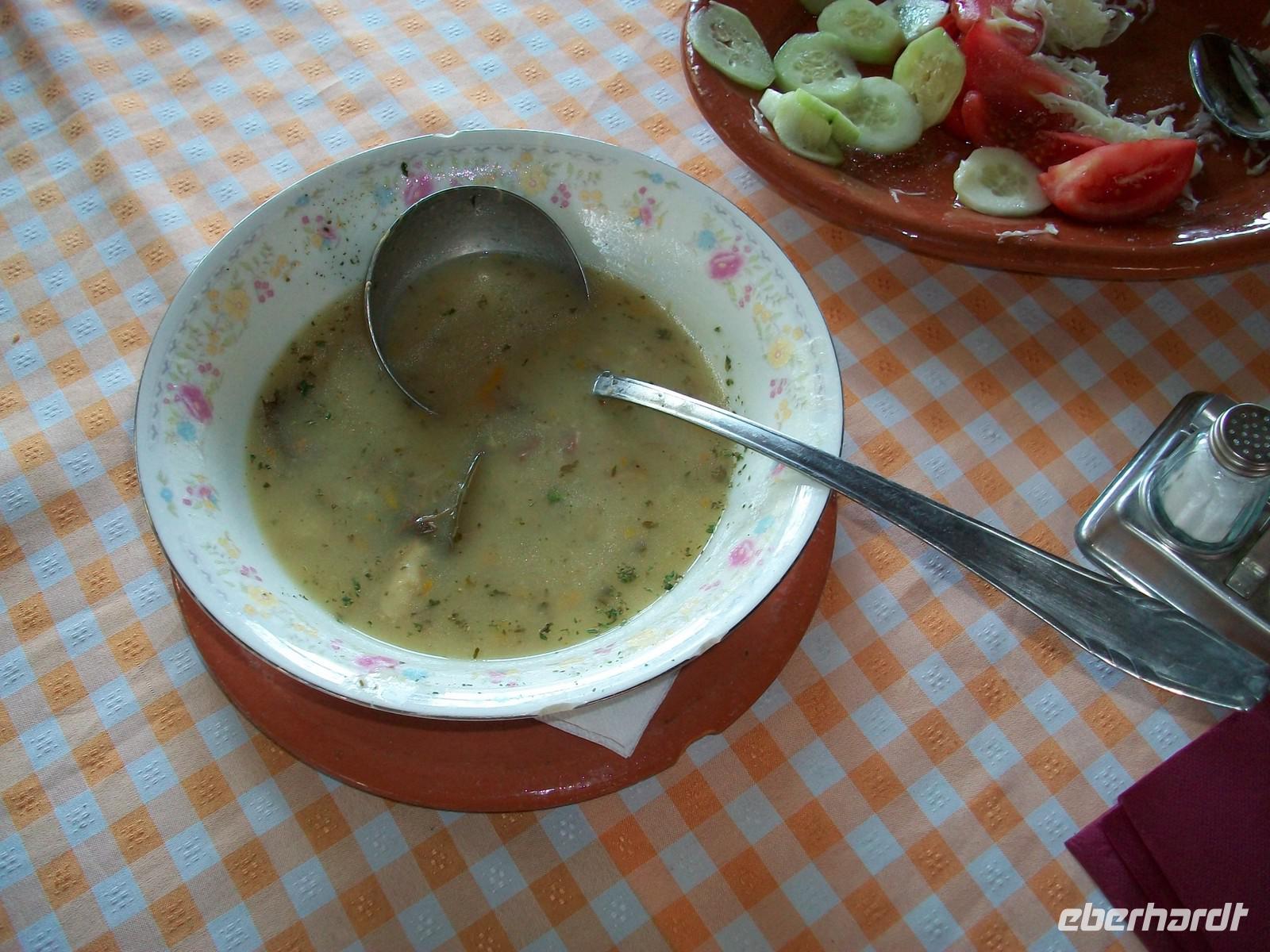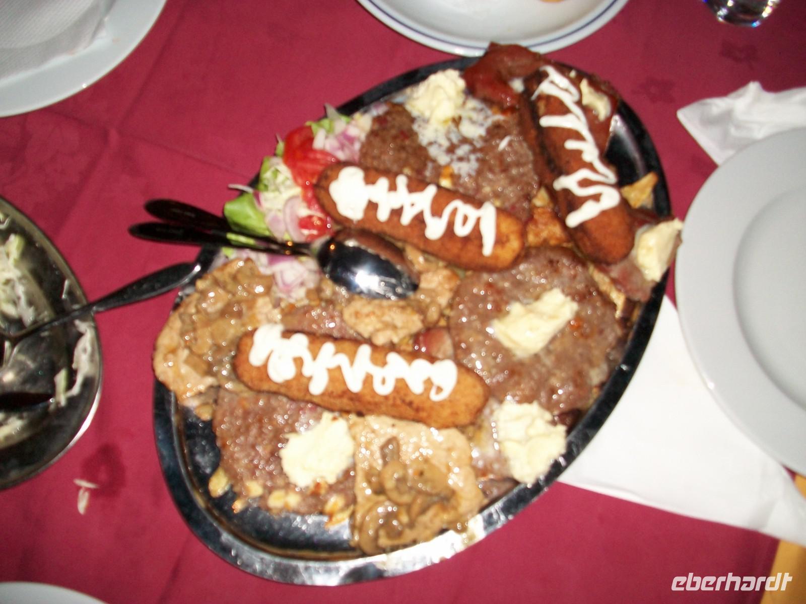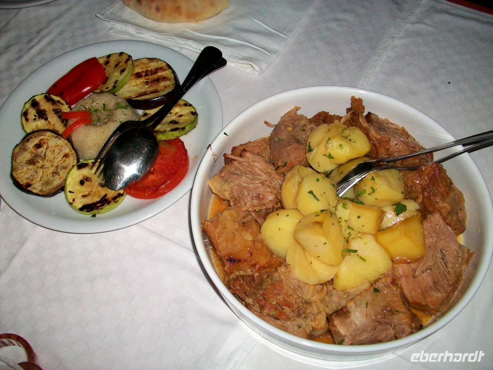 Zur Mittagszeit fahren wir auf abenteuerlichen Wegen zu einem typisch balkanischen Restaurant, fernab der Hektik genießen wie in schöner Natur unser Mahl. Zuerst gibt es eine leckere Suppe, dann einen sehr üppigen Vorspeisenteller und als Hauptgang kommen große Schüsseln auf den Tisch mit Rind- und Lammbraten, dazu Kartoffeln und Gemüse.