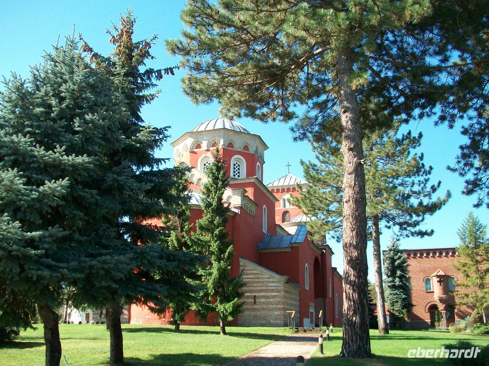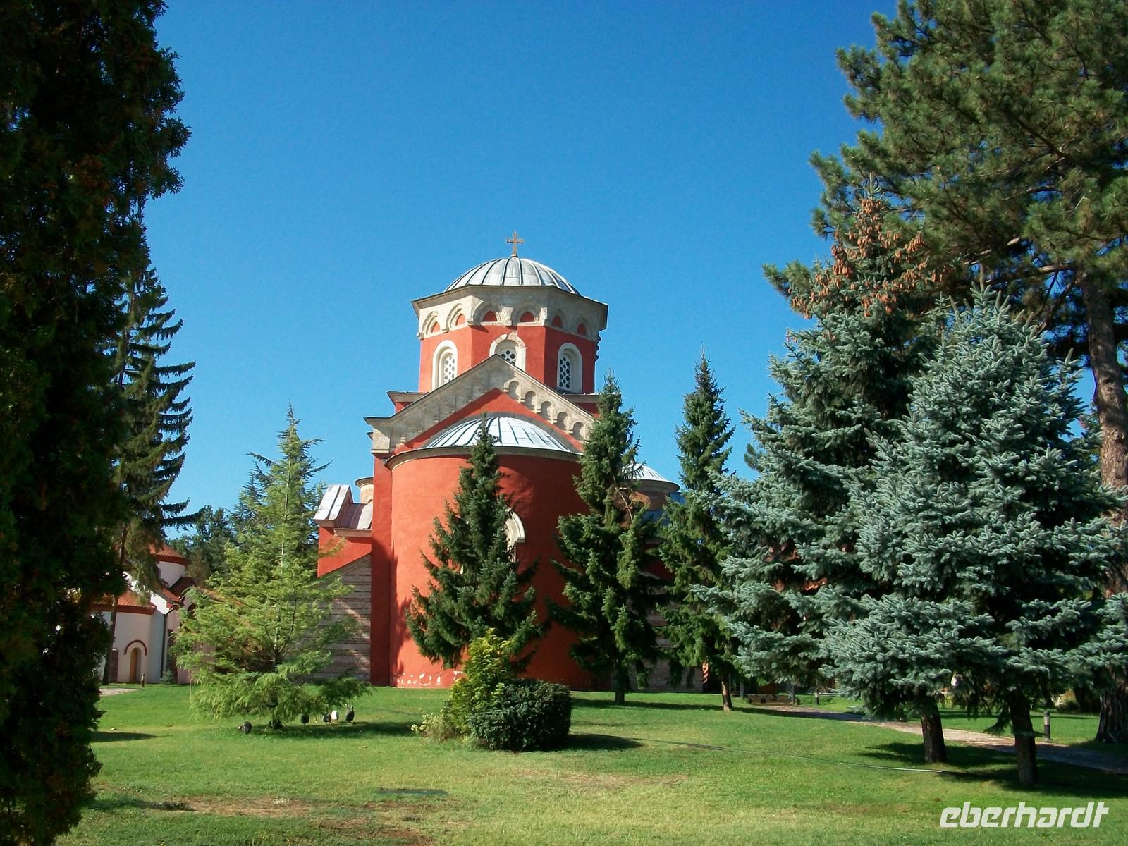 Nach dem wir gegen halb neun aufgebrochen sind führt zuerst unsere Tour zum bekannten Kloster Žica. Schon von Weiten leuchtet es uns mit seiner roten Farbe entgegen; der Weg führt uns über den Busparkplatz direkt zum Eingang. Von hier aus konnte man früher von einem Turm aus das Kloster verteidigen, denn die Türkengefahr bestand immer.
