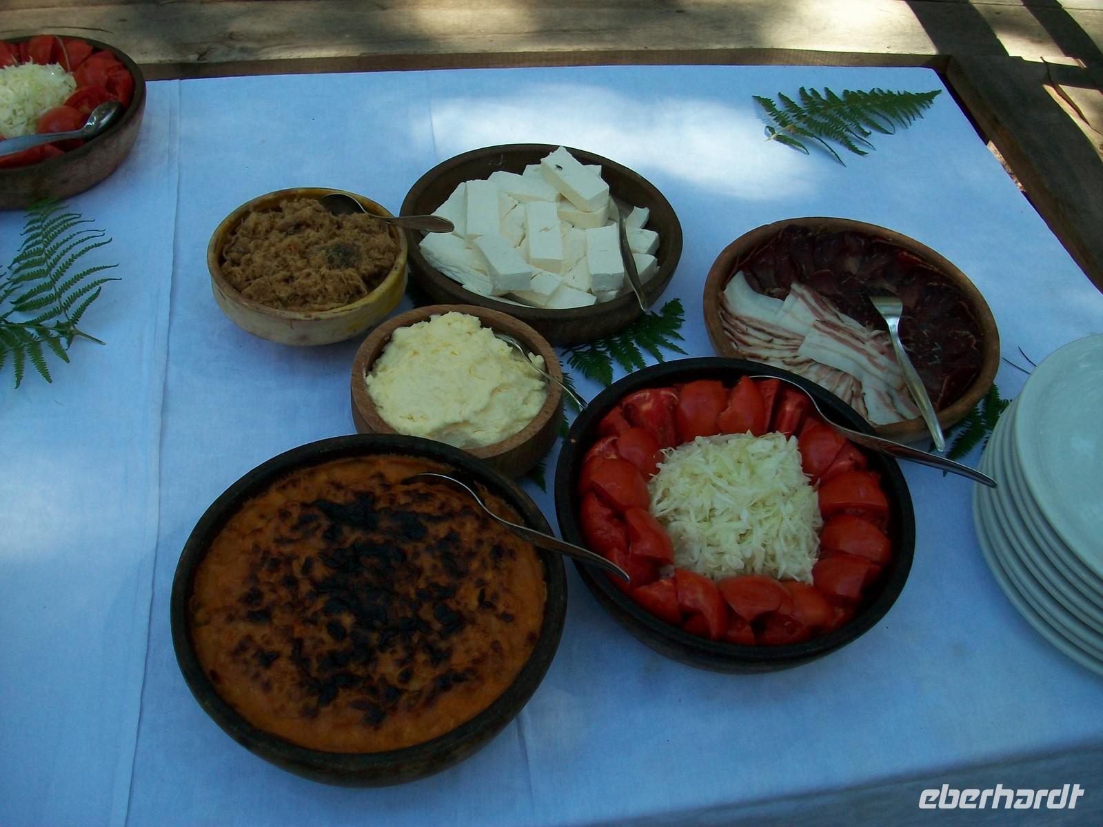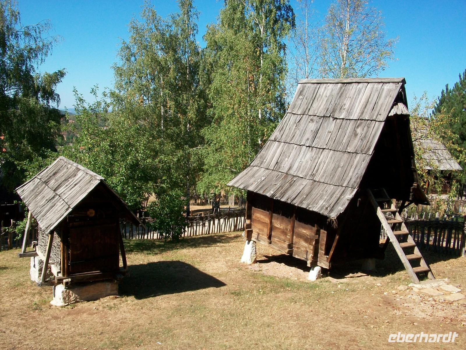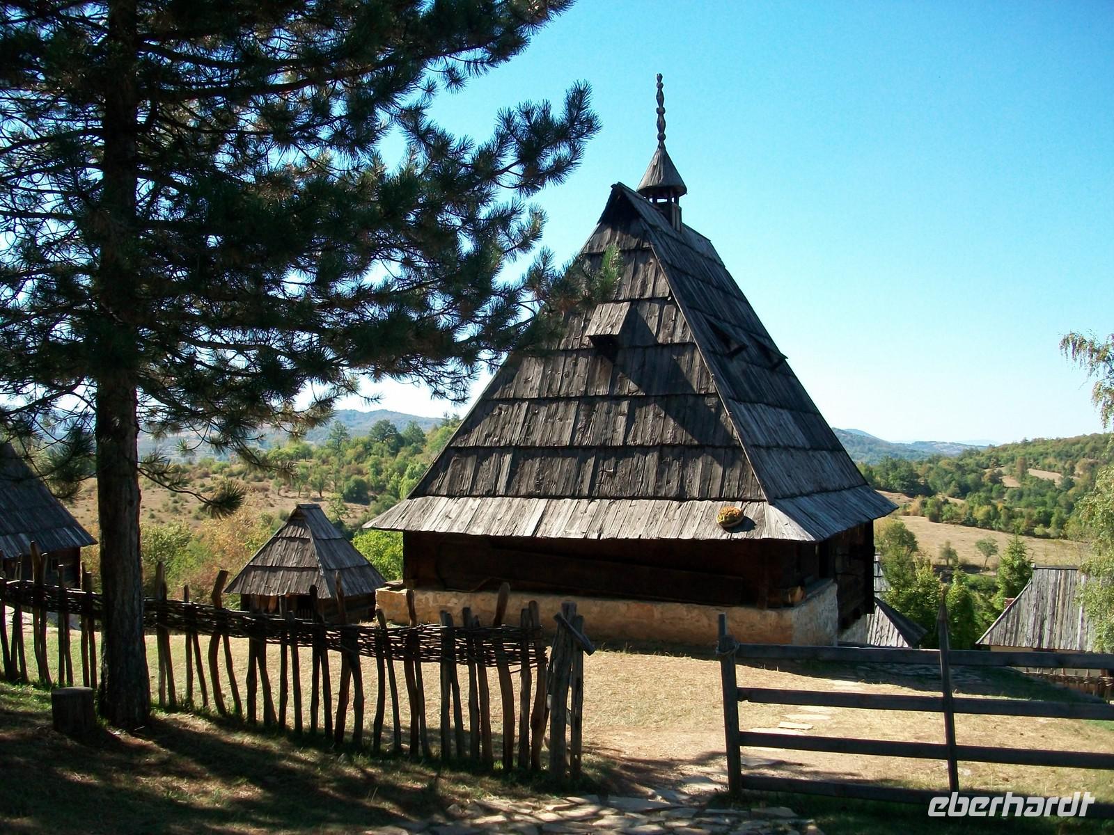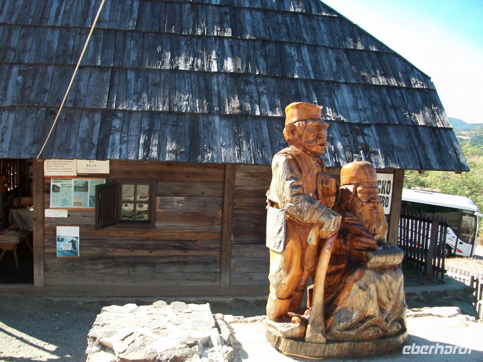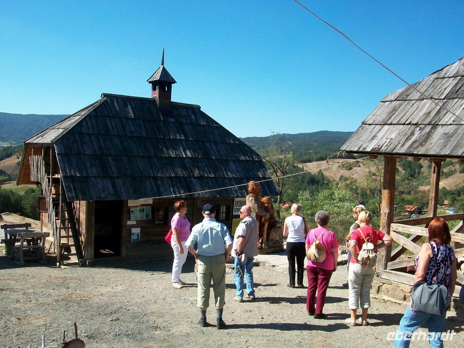 Bald weichen wir von der Hauptstraße ab und sind auf abenteuerlichen Wegen im Zlatiborgebirge unterwegs. Die schmale Straße führt uns in Windungen bergauf, bald haben wir unser Ziel Sirogojno erreicht. Inmitten einer schönen und ruhigen Gebirgsnatur die den Blick weit ins Land zulässt, spazieren wir zu unserem Restaurant in dem es das Mittagessen geben wird. Mitten im Wald, umgeben von den uralten Häusern der serbischen Bauern, ist für uns ein Buffet gerichtet. Viele Leckereien der vielfältigen Balkanküche sind hier aufgebaut, inmitten der schönsten Natur lassen wir es uns schmecken; unter dem Schatten der Bäume ist es angenehm kühl und so wird diese Mahlzeit zu einem besonderem Ereignis dieser schönen Reise.