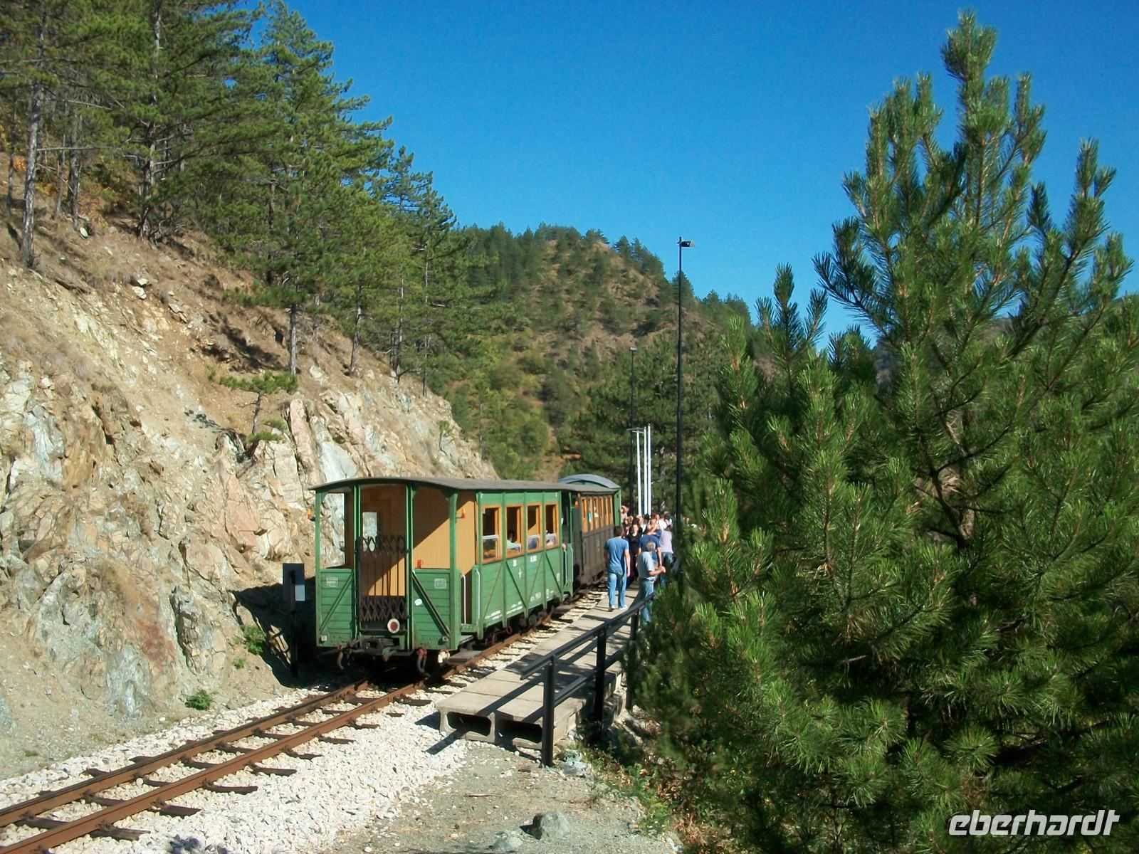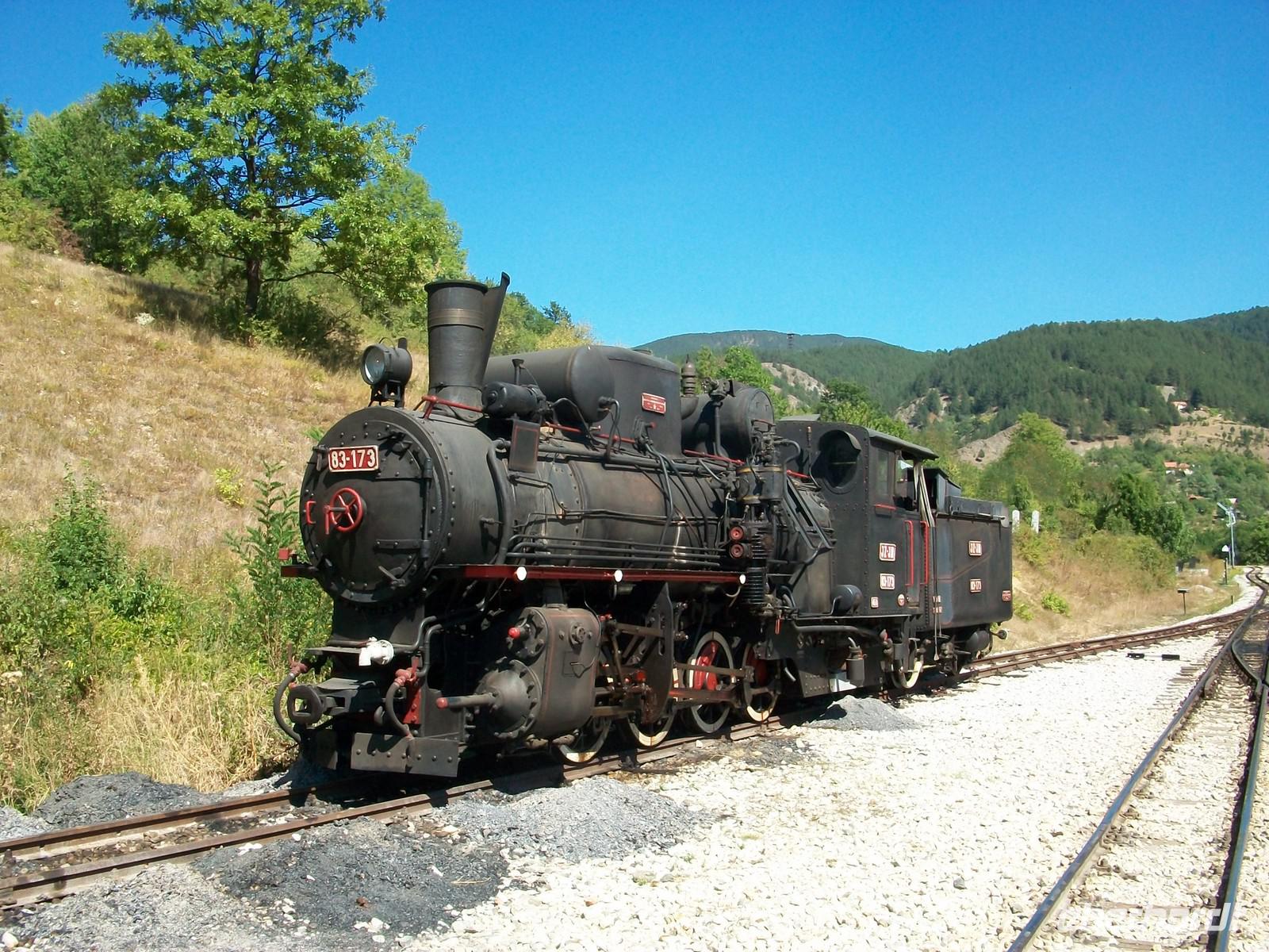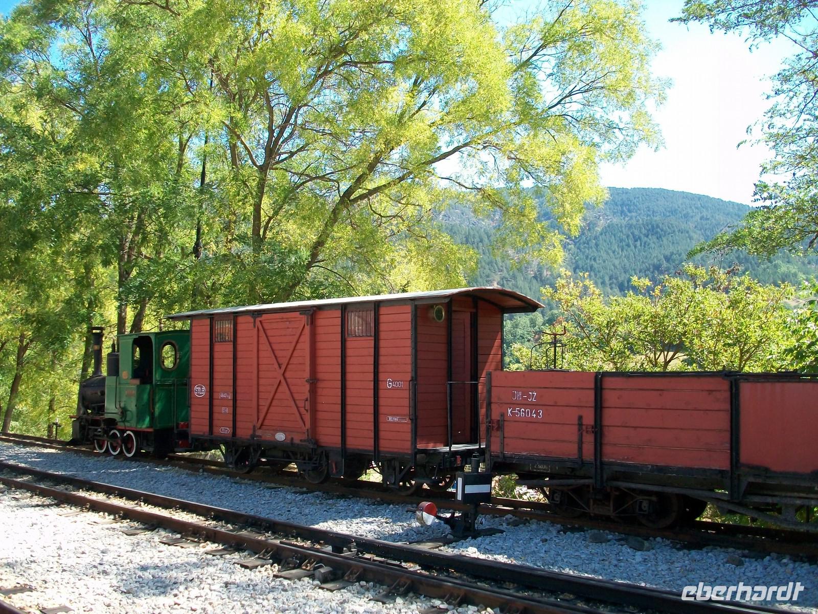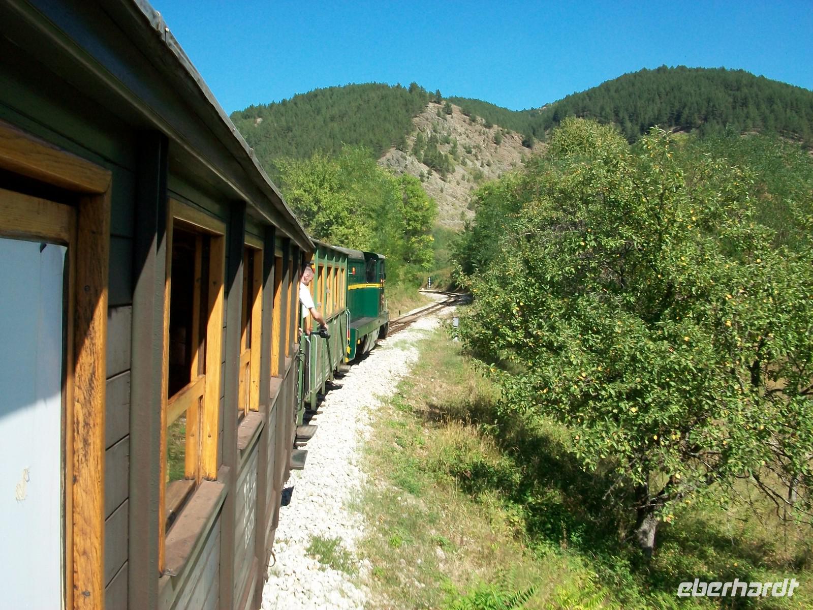 13.30 Uhr, ein greller Pfiff, ein Ruck- die Fahrt beginnt. Zuerst geht es auf der Ebene los, wir fahren an dem kleinen Ort Mokra Gora vorbei und sind dann schon bald inmitten der schönsten Natur. Wir durchfahren Waldstücke, dann wieder durch eigens für die Bahn angelegte kleine Schluchten und immer haben wir einen schönen Blick auf die grüne Natur des Spätsommers.