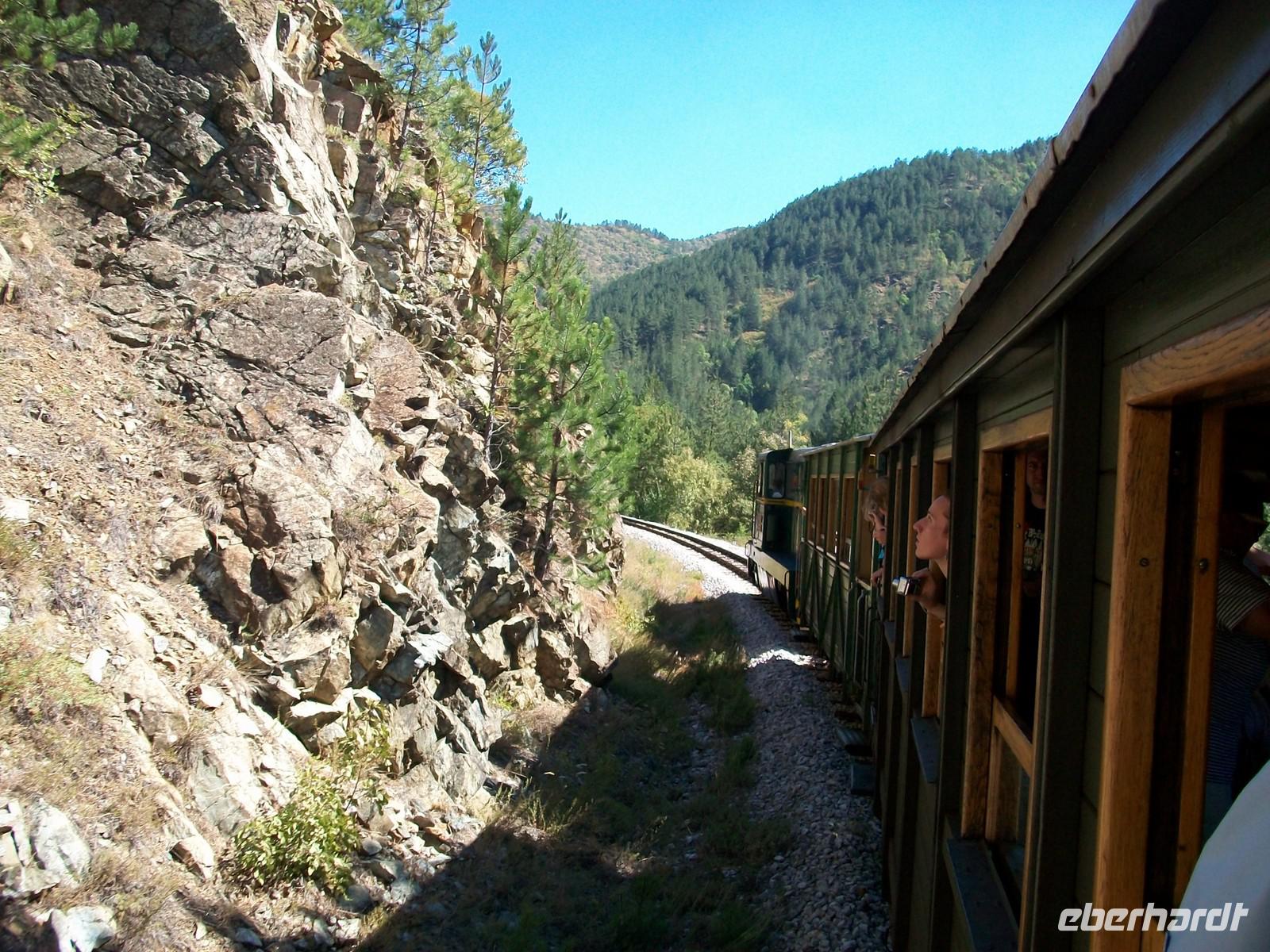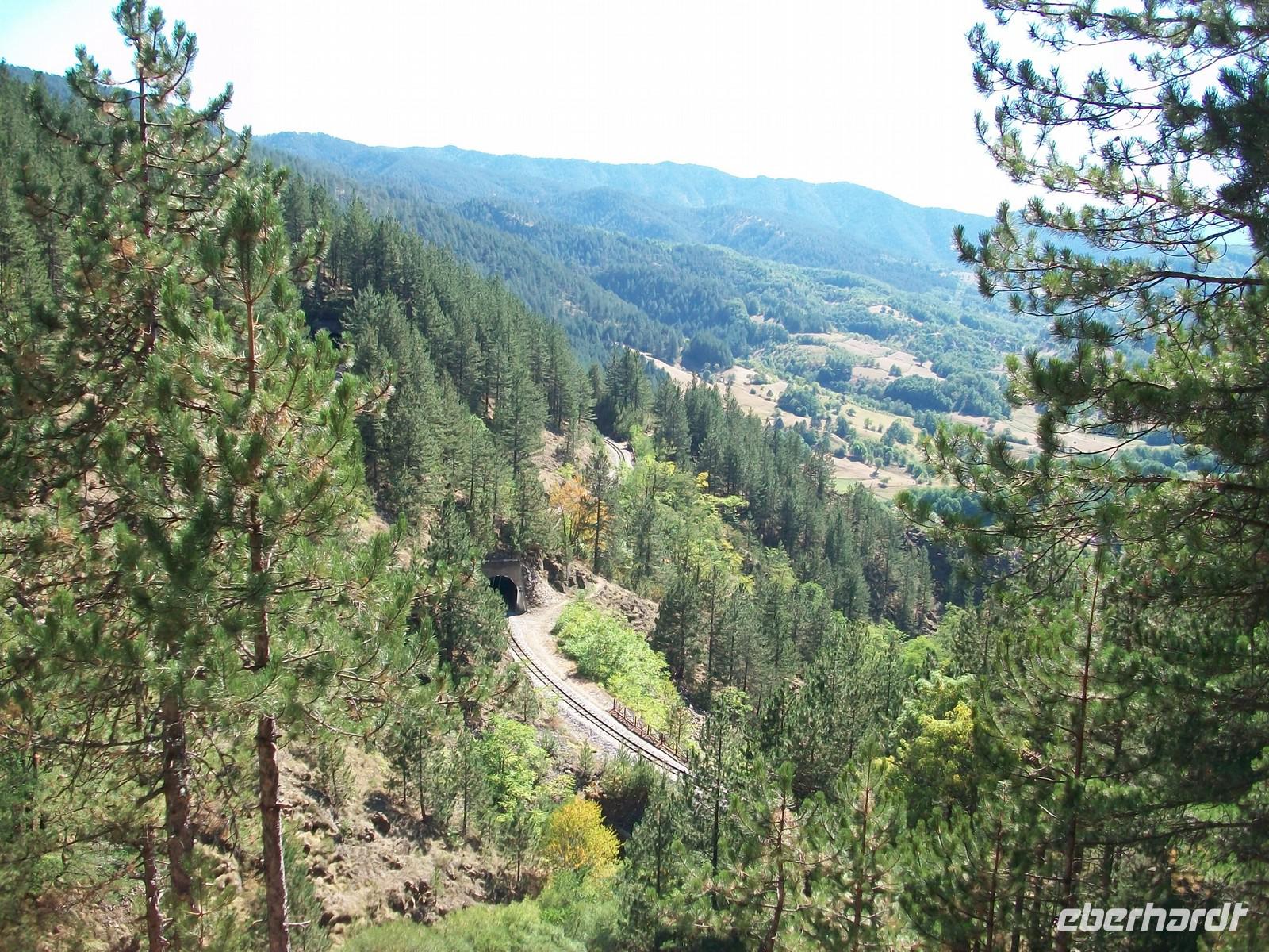 Dann geht es durch viele Tunnels die teilweise im Berg selbst verlaufen und als Kehrtunnel fungieren. Daraus aufgetaucht haben wir schon wieder an Höhe gewonnen. Diese schöne Fahrt ist wahrhaft atemberaubend und auf der Rampe zwischen den Wagen stehend, bläst mir der Wind ins Gesicht. Es ist eine wirklich wilde Romantik die in dieser Form nur der Balkan bieten kann.