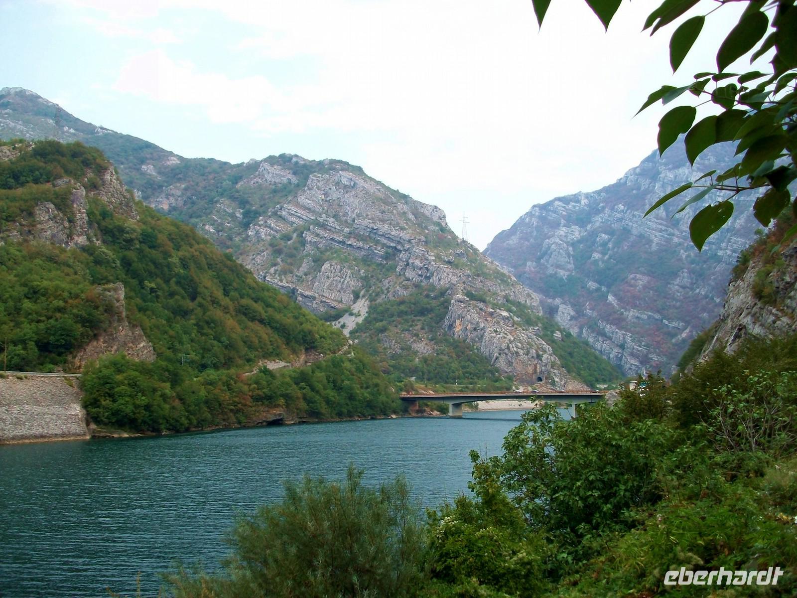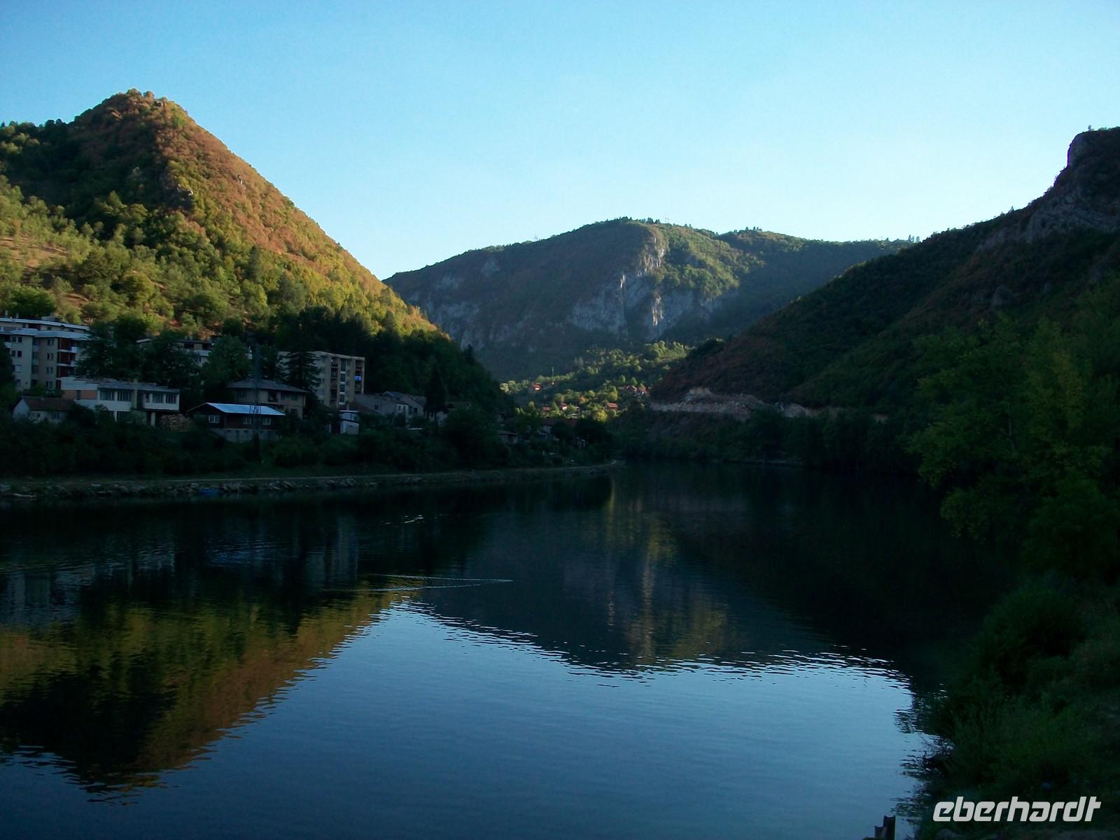 In der nächsten knappen Stunde durchfahren wir das Flusstal der Drina, mal im Schatten und mal in der Sonne des Spätnachmittags ergeben sich von der Straße aus immer neue und schöne Perspektiven auf das malerische Flusstal.