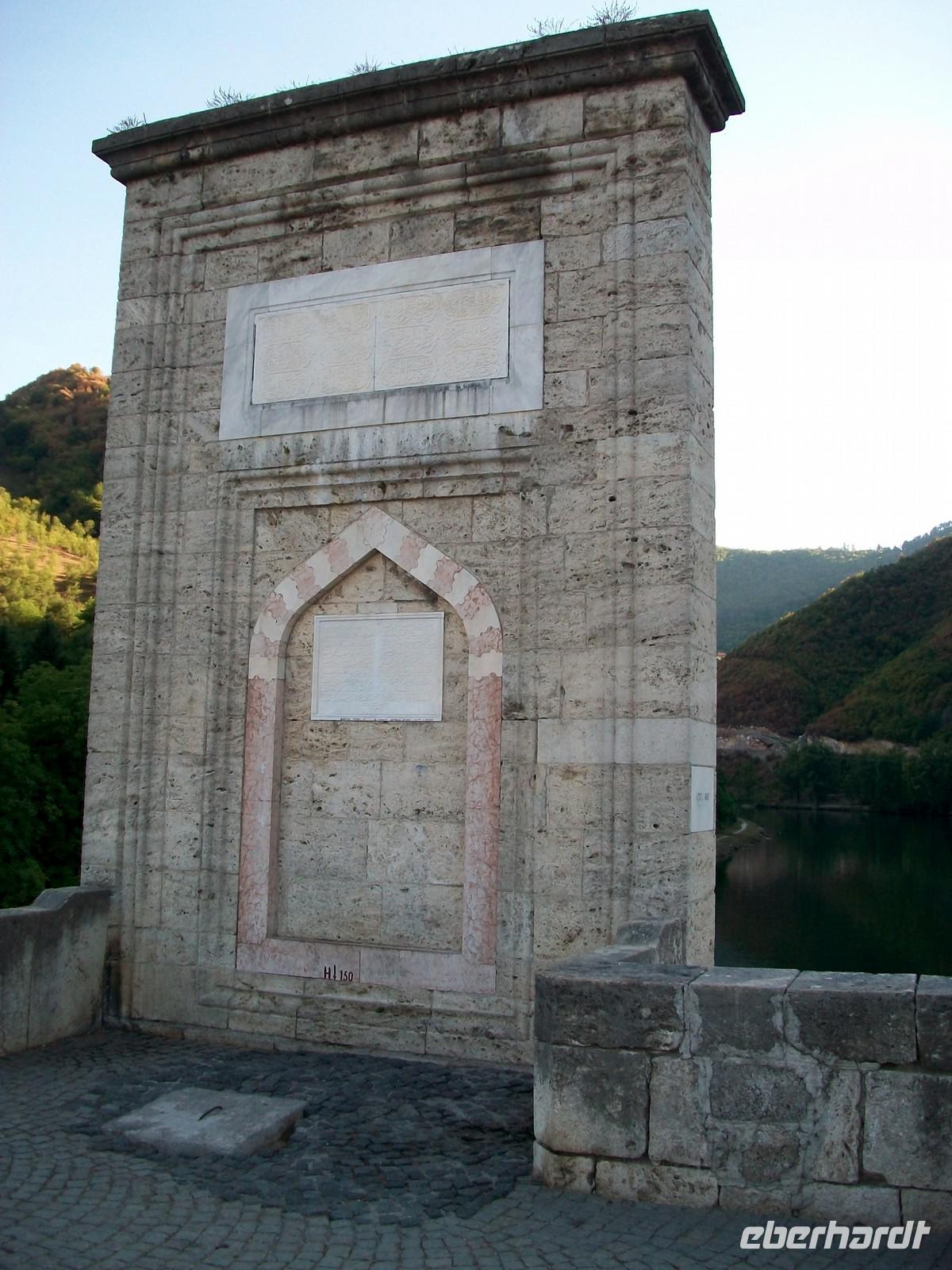 Dann sind wir an der Grenze zu Bosnien angelangt. Die Abfertigung dauert eine halbe Stunde, das ist eine gute Zeit für diese Grenzen. Bald sind wir zwischen schroffen Bergen unterwegs um uns eine ganz besondere Brücke anzuschauen. Der berühmte jugoslawische Dichter Ivo Andric siedelte an der Brücke über die Drina hier seinen gleichnamigen Roman an und nach dem sich die Straße abgesenkt hat, erreichen wir den Ort Višegrad. Wir überqueren die grünlichen Fluten der Drina die ihre Wasser der Save zusendet und fahren am gegenüberliegenden Ufer flussaufwärts wo wir von weitem schon die berühmte Brücke sehen. Mehrere Bögen überspannen den Fluss; dieses Bauwerk aus der osmanischen Zeit liegt zu dieser Tageszeit schon im Schatten, die Sonne ist hinter den steil aufragenden Bergen verschwunden und taucht das Tal in Schatten. Die Berge die uns umgeben und auch die Stadt werden noch von der Sonne beschienen und bilden den schönen Kontrast als wir die Brücke überqueren. In der Mitte erklärt uns Bogdanka das Entstehen des Bauwerks und wir erfahren etwas über den Roman der unseren Lesehunger befördert.