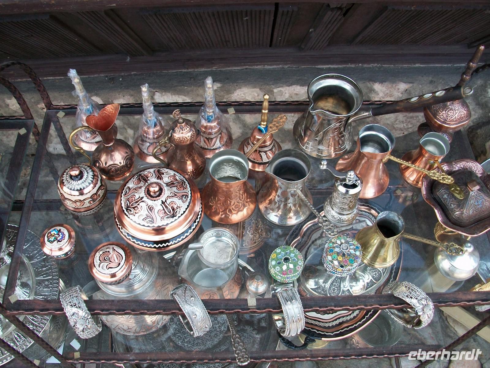 Dann tauchen wir ganz ein in den Orient, auf den Bänken vor den Cafés sitzen Einheimische und rauchen Wasserpfeife; dann sind wir wieder in einer Gasse der Handwerker unterwegs wir hören die Hammerschläge der Kupferschmiede die fleißig ihrer Arbeit nachgehen und sich auch gern über die Schulter sehen lassen.
