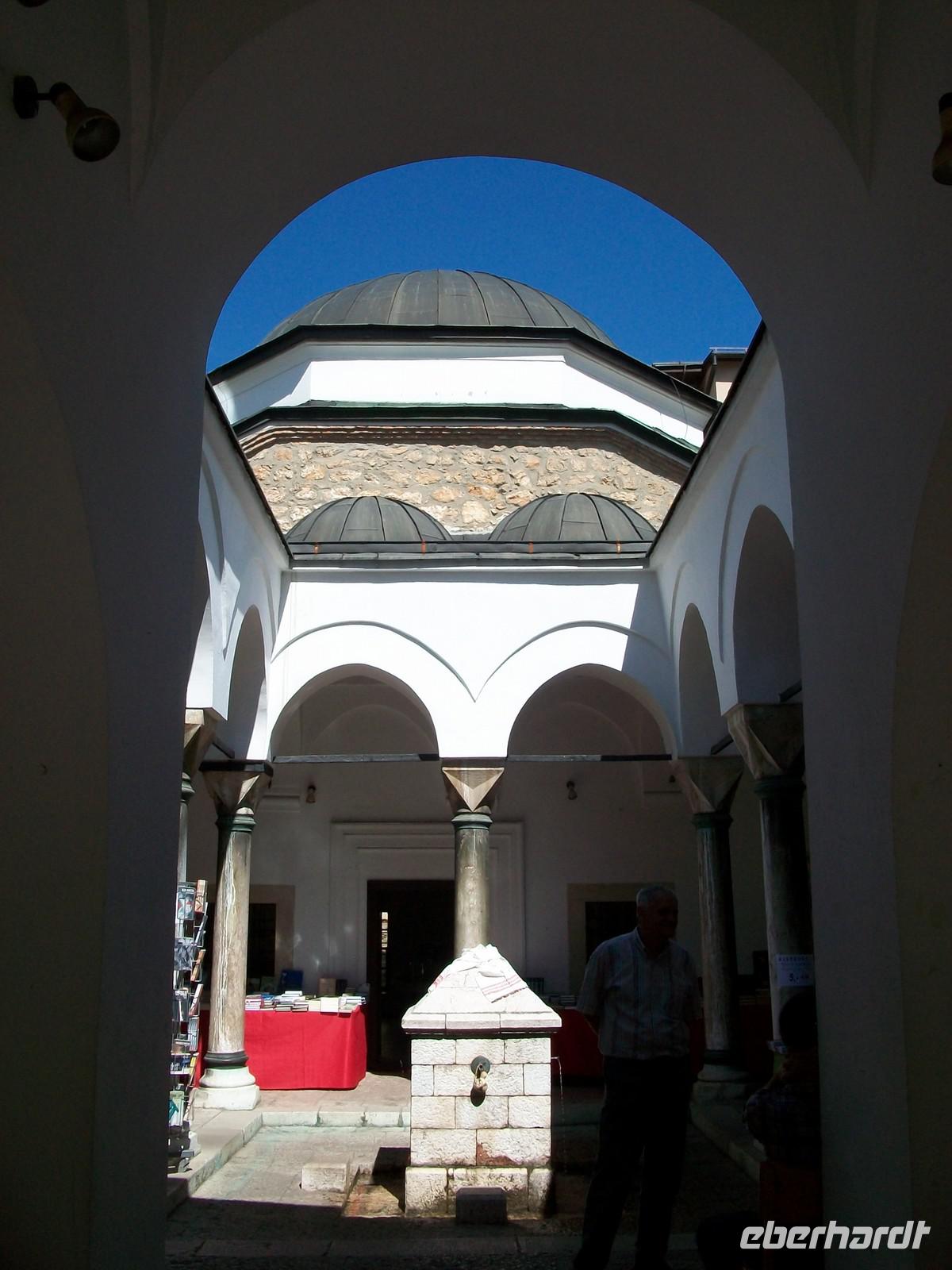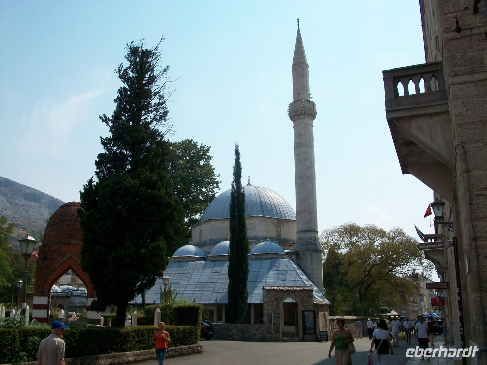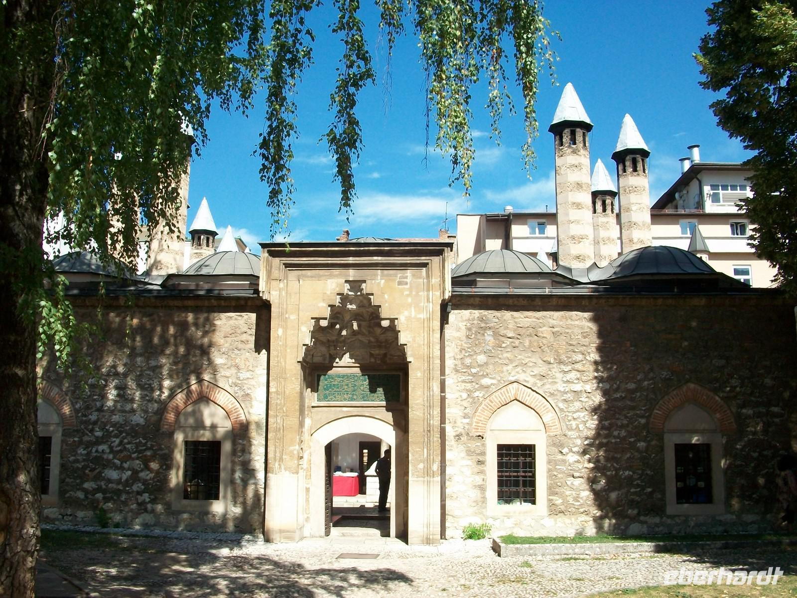 Wie mit dem Messer abgeschnitten endet der Habsburger Teil und wir tauchen nun ein in das Morgenland. Viele Jahrhunderte herrschten hier die Osmanen und brachten neben ihren typischen Bauten auch den Islam in diese Gegend. Wir stehen nun im Innenhof einer Moschee und lernen eine weitere Weltreligion kennen die uns Belma sehr wissenswert nahebringt. Das ist das Einmalige an Sarajevo, die jeweiligen Gotteshäuser dieser Weltreligionen stehen nur einen Katzensprung auseinander, hier hört man die Glocken läuten und den Muezzin zum Gebet rufen.