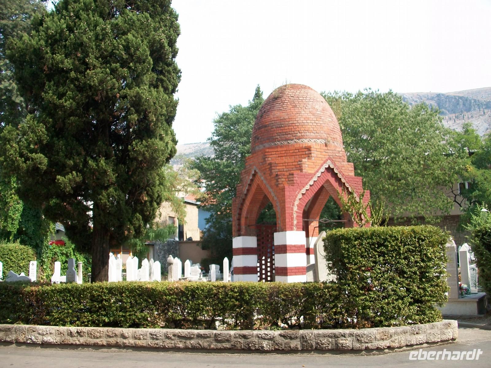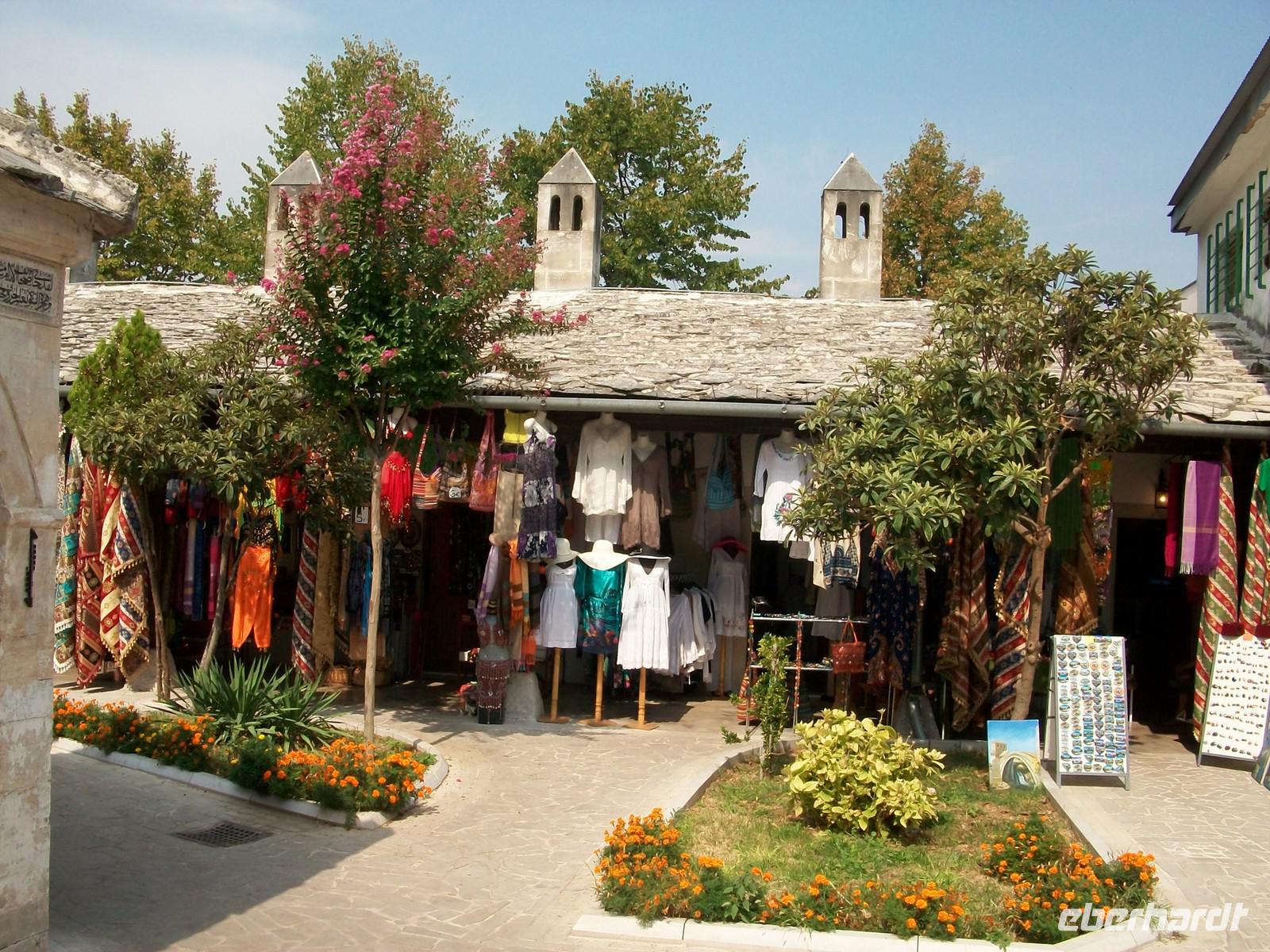 Wir werden schon von unserer Führerin Elvina erwartet, überqueren die Hauptstraße und sind bald im osmanischen Teil angelangt. Hier gibt es türkisches Pflaster welches uns die Fußsohlen massiert. Vorbei an zahlreichen Minaretten erreichen wir bald die Hauptattraktion von Mostar, die Alte Brücke. Hier haben sich viele Nationen der Welt versammelt um dieses wunderschöne Bauwerk zu bewundern. Es ist immer wieder ein schönes Gefühl über diese einmalige Brücke zu gehen die über 400 Jahre hielt und im letzten Krieg ohne Grund zerstört wurde. Unser Weg führt uns dann am anderen Neretvaufer entlang durch die schmale Gasse die von Verkaufsständen gesäumt ist. Wir schwenken links ab und befinden uns nun schon im Innenhof einer Moschee. Schlank strebt das Minarett nach oben, wir betreten das muslimische Gotteshaus mit dem rechten Fuß und lauschen den Erklärungen unserer Führerin. Fremd muten uns die religiösen Gebräuche des Islam an, nach dem wir die Moschee verlassen haben sind wir wieder etwas schlauer.