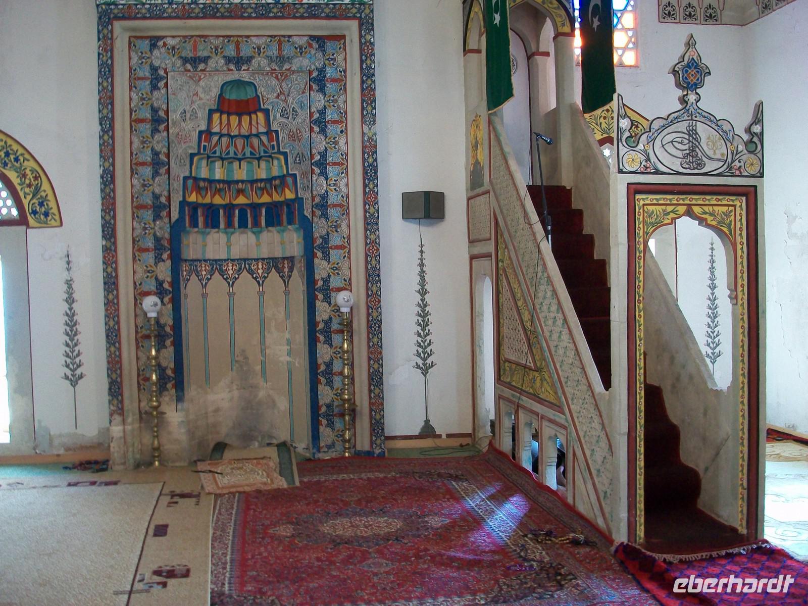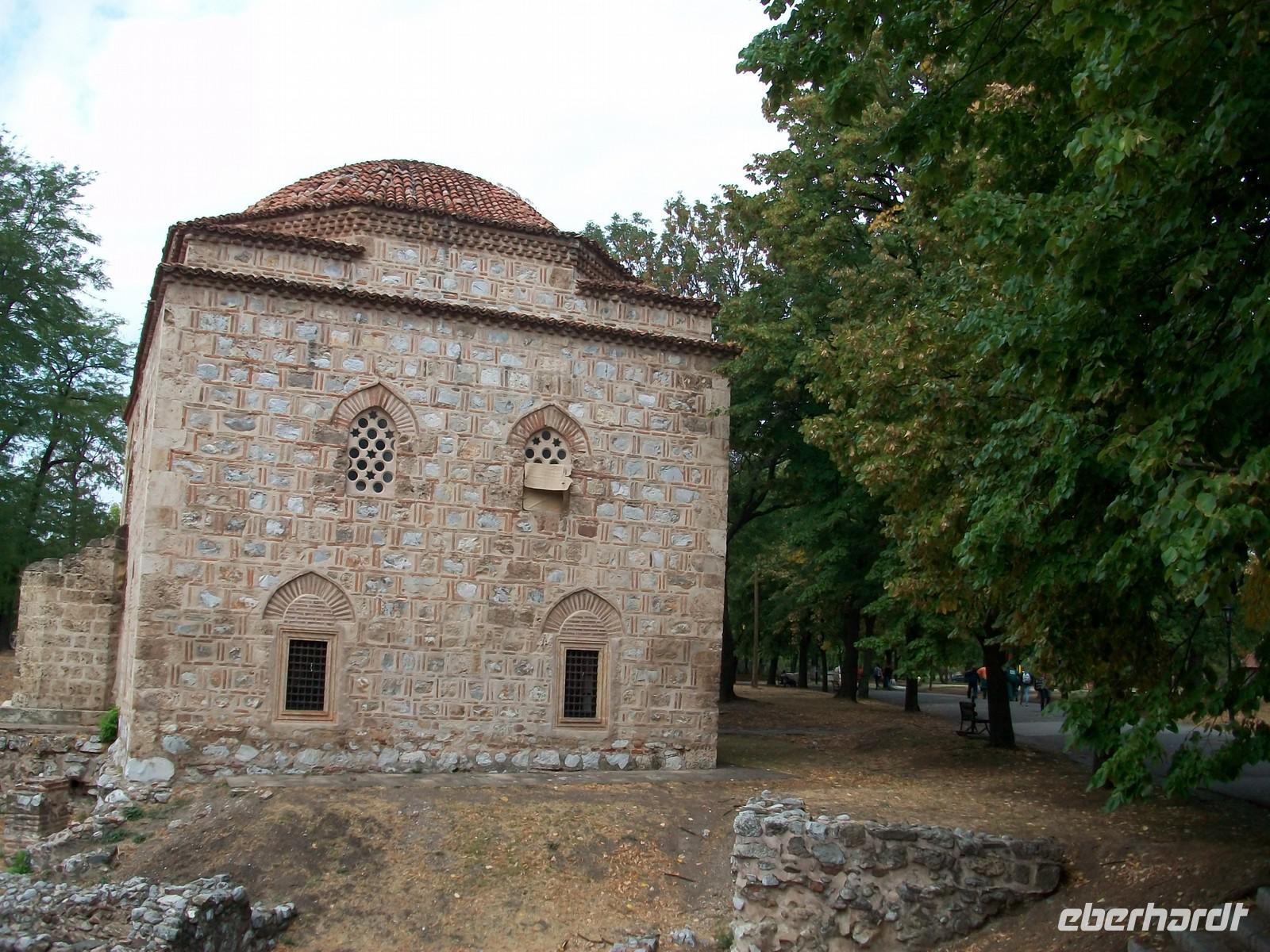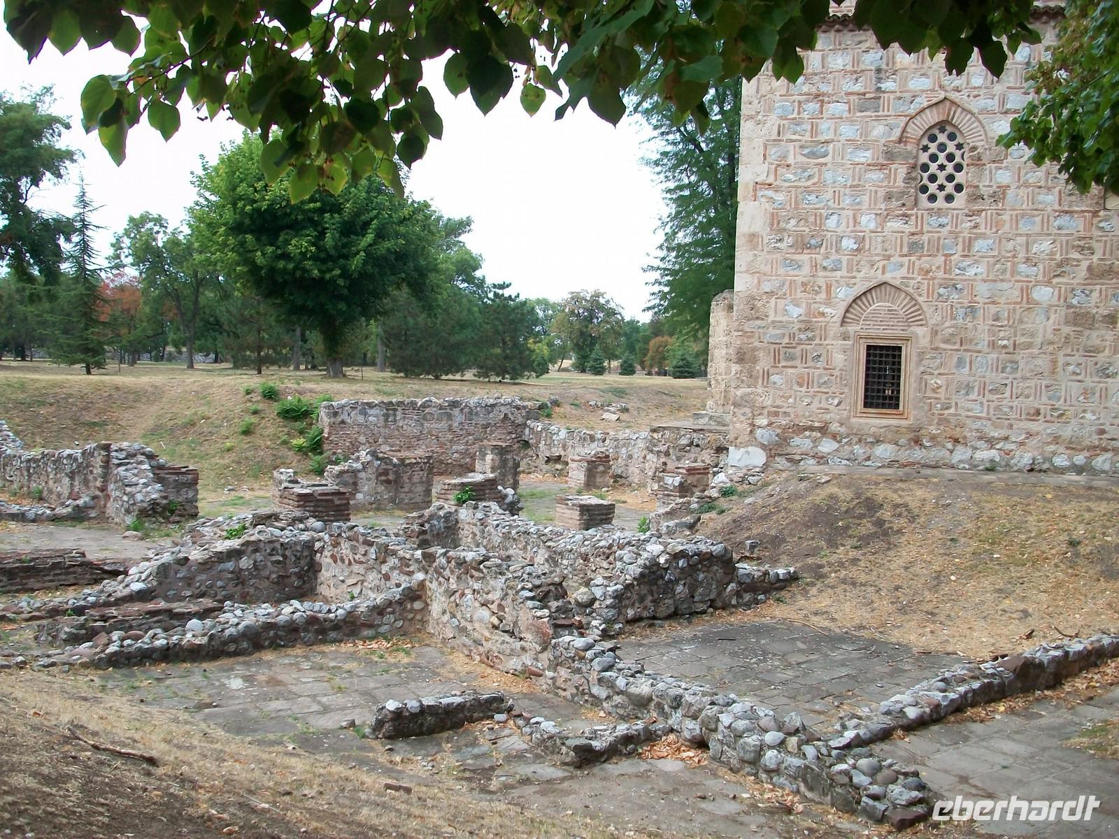 Hier ist ein malerischer Innenhof zu sehen und im Innern ein schönes Schnitzwerk nebst einer sehenswerten Innenausstattung. Eben als wir die Kirche verlassen, ruft der Muezzin vom gegenüberliegenden Minarett die Moslems zum Gebet- es ist auch hier in Skopje ein schöner Mix der Kulturen und Religionen.