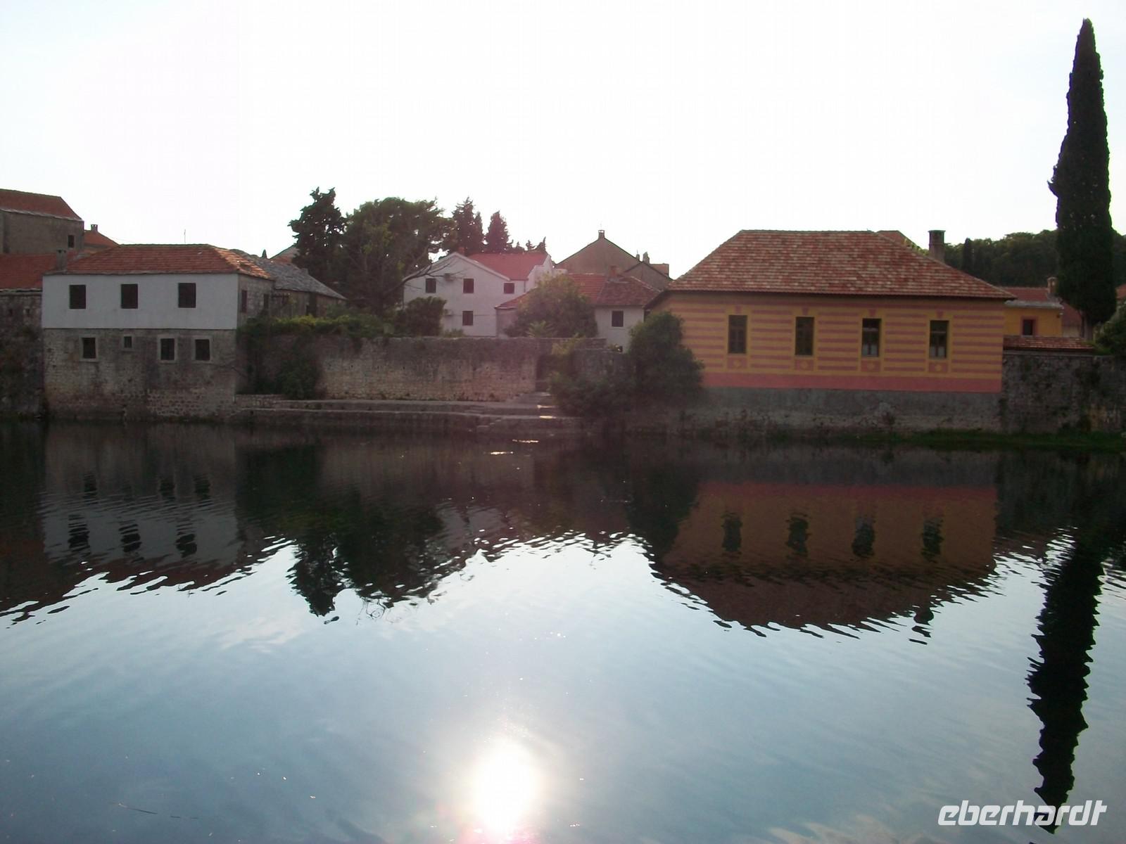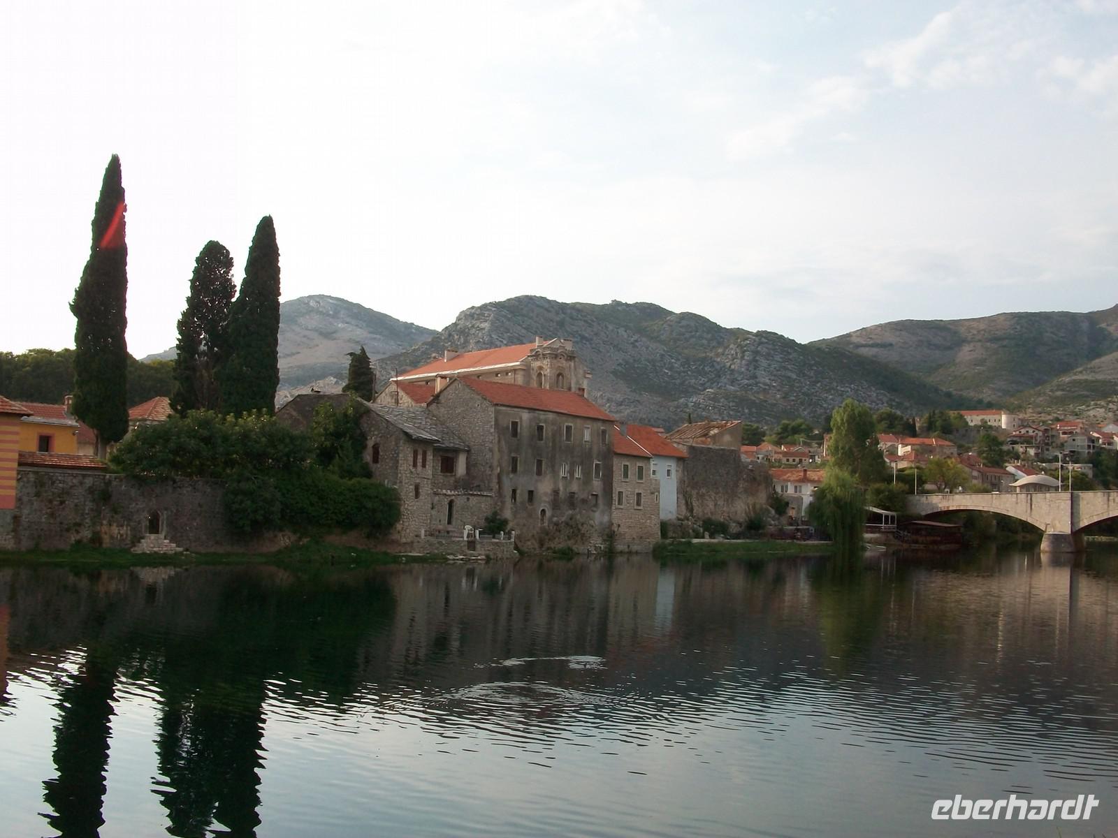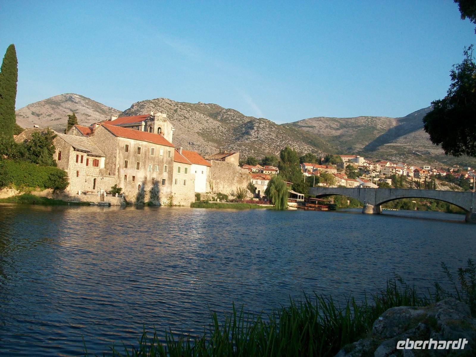Unsere Gruppe versammelt sich 14.00 Uhr am Bus und dann setzen wir die Fahrt fort. Zuerst fahren wir durch das fruchtbare Tal der Neretva mit dem Weinanbau der Herzegowina, später sind wir dann im verkarsteten Hinterland unterwegs. Der letzte heiße Sommer hat hier eine große Dürre zurückgelassen, hie und da sind auch die verkohlten Überreste von Buschbränden zu sehen. Bald wird das Land aber wieder fruchtbarer wir haben den Ort Trebinje erreicht der unser heutiges Domizil sein wird. Zunächst schauen wir uns mit einer lokalen Führerin den etwas verträumten Ort an, wir sehen die typischen Häuser die aus Kalkstein errichtet wurden, spätestens hier sind wir nun im mediterranen Einflussbereich angelangt.