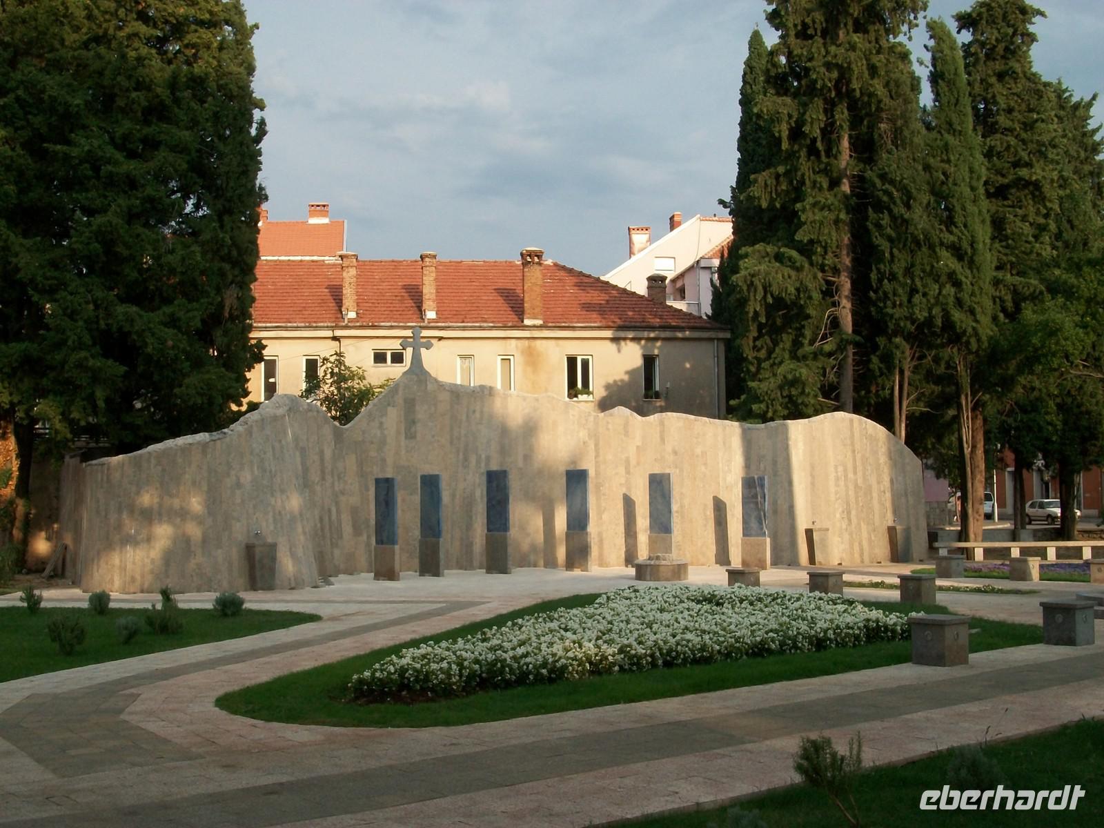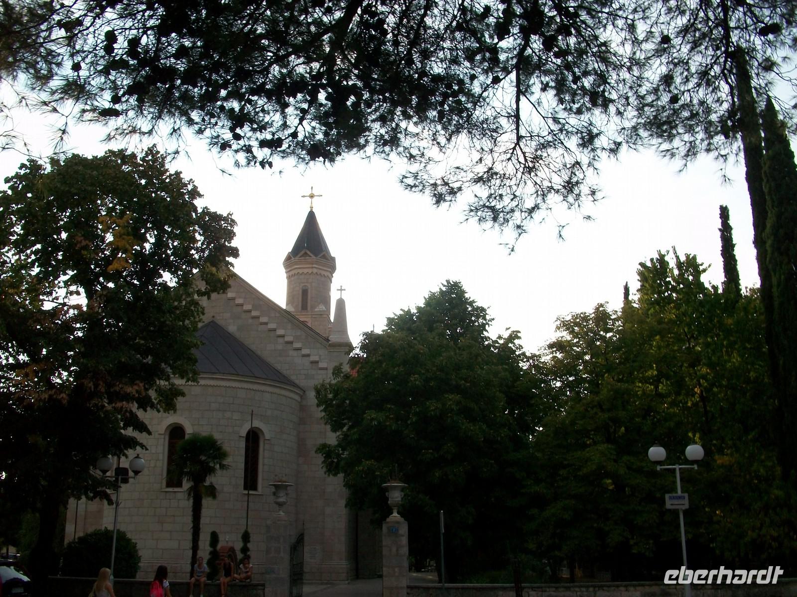 Schon von weitem ist der schlanke Turm der Franziskanerkirche zu sehen. Das ist erst einmal unser Ziel, von hier beginnt die Führung durch einen sehr sehenswerten Ort. Beim Öffnen der Bustüren dringt ein Schwall sehr heißer Luft hinein. Mostar hat mediterranes Klima und jetzt, kurz vor Mittag, sind hier runde 30 Grad im Schatten zu vermelden.