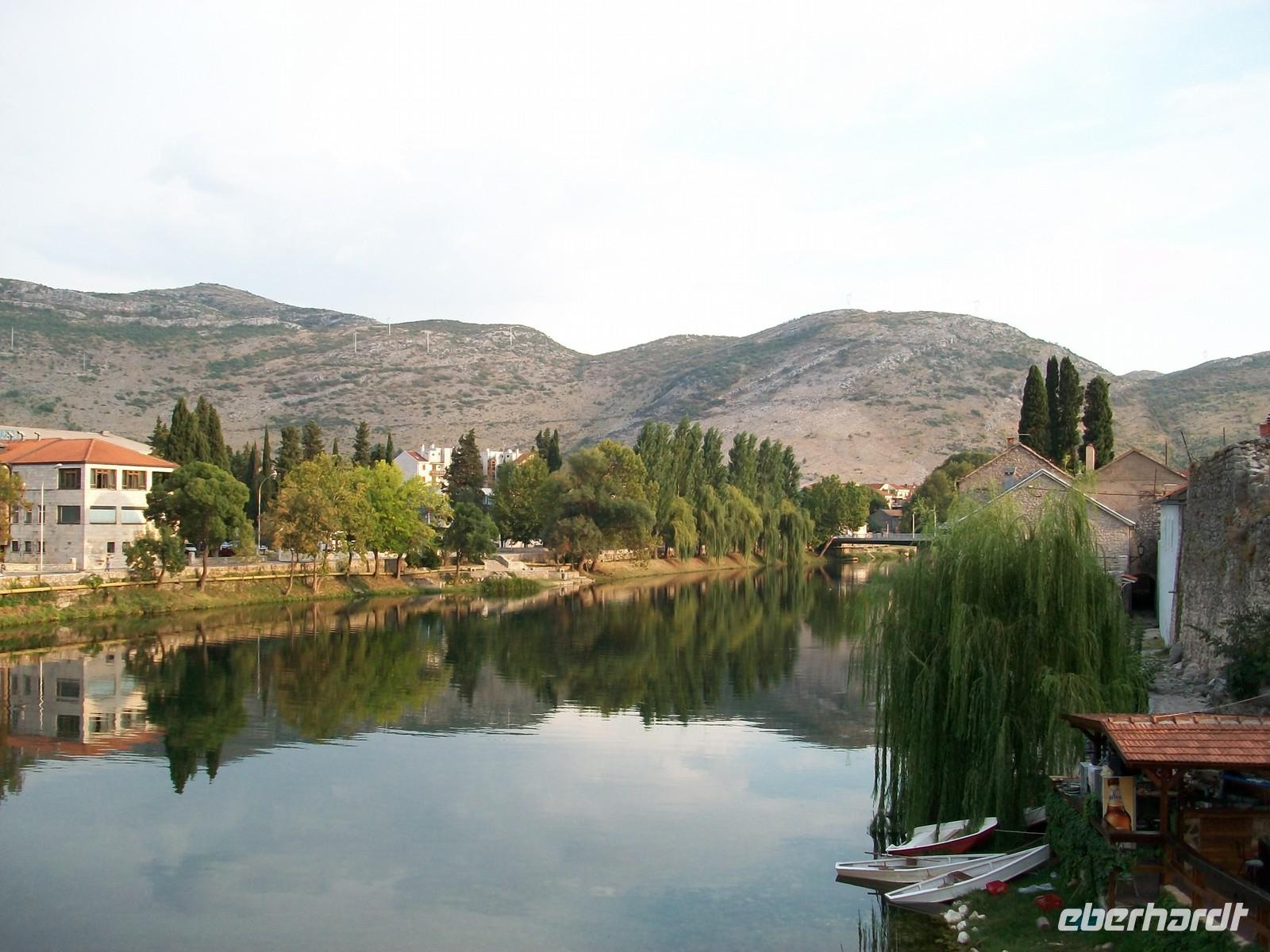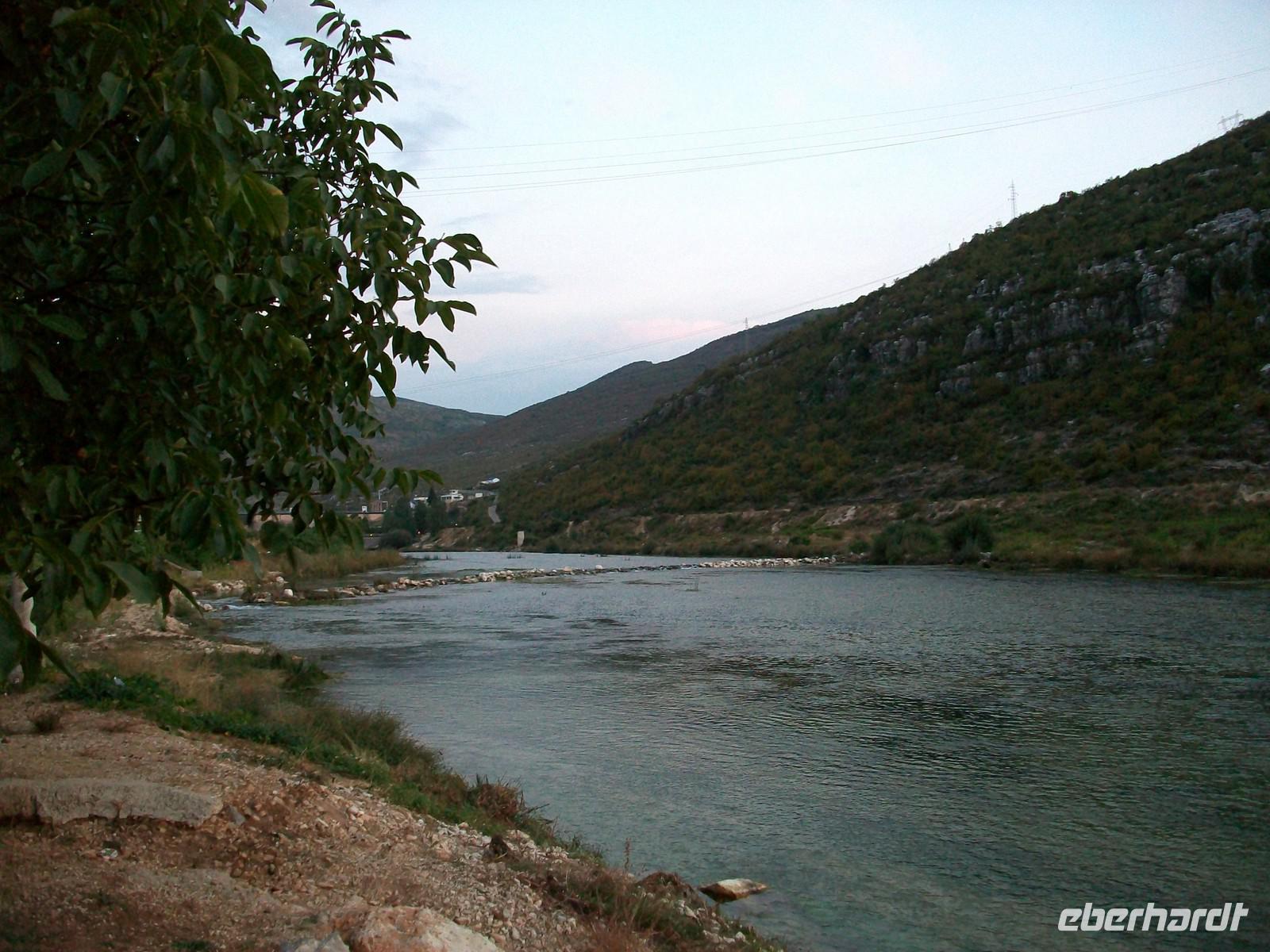 Unmittelbar hinter Jablanica führt und die Fahrt durch einen besonders romantischen Teil. Die Berge rücken eng an die Straße heran und bilden hier die Neretvaschlucht. Bei dieser ruhigen Fahrt gibt es immer neue und schönere Impressionen, immer entlang des Flusses mit seinen grünen Fluten. Hier wird auch Fischzucht betrieben, besonders die Forellen aus der Neretva sollen sehr lecker sein. Bald öffnet sich aber die Schlucht und macht einem ausgedehnten Kessel Platz, nur noch wenige Kilometer und wir sind in Mostar angelangt.