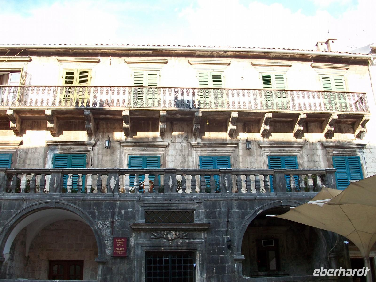 13.9.2012. Der Tag beginnt mit einem Donnerschlag, ich schrecke aus meinen Träumen heraus, über uns entlädt sich ein Gewitter welches in Windeseile über das Wasser der Adria gezogen kommt. Kein schöner Tagesbeginn und leider wird uns die Gewitterfront heute nicht in Ruhe lassen. Es ist 8.15 Uhr und wir starten, der Weg führt uns hinauf in die Berge; hier haben sich dunkle Wolken zusammengeballt die ihre grellen Blitze entladen. Auf dem Weg in die alte montenegrinische Königsstadt Cetinje schickt uns Petrus immer wieder Schauer die ihre Tropfen trommelnd an die Scheiben unseres Busses senden. Als wir in dem Ort einfahren hat es nur kurz zu regnen aufgehört, dennoch werden wir von Jelena erwartet; sie wird uns nun durch den sehenswerten Ort führen. Kaum hat sie mit den Erklärungen begonnen öffnete der Himmel wieder seine Schleusen. Kleine Bäche ergießen sich dabei die Wege entlang, so dass eine Führung unter diesen Umständen leider nicht durchführbar ist. Alternativ besuchen wir das Museum, es ist der einstige Königssitz und erfahren dabei von Jelena viel Wissenswertes über eine interessante Epoche aus diesem stolzen Land. Leider regnet es noch immer, mit den Interessierten gehen wir noch zum Präsidentensitz um dann gegen 11.00 Uhr in unserem Programm fortzufahren.