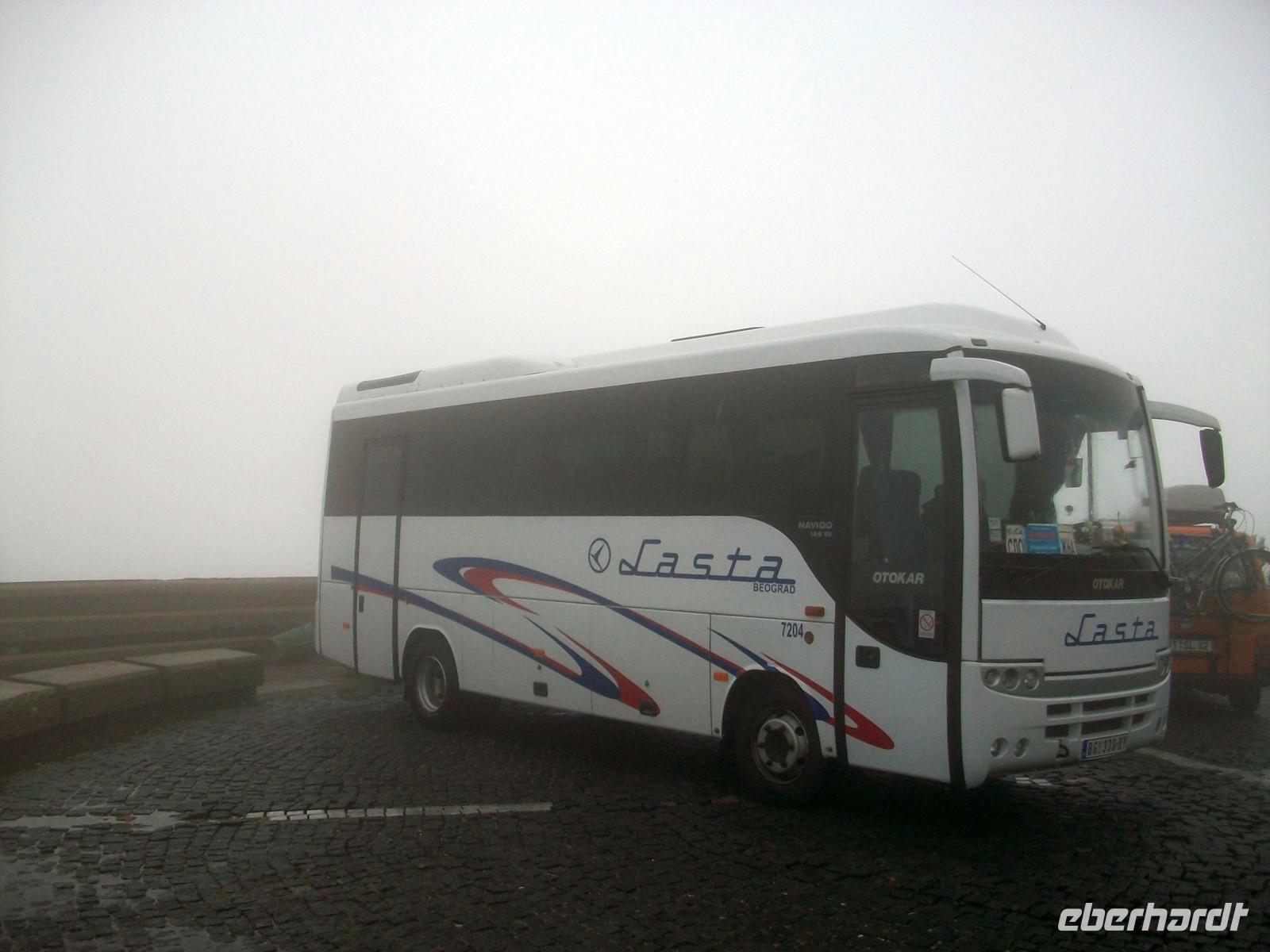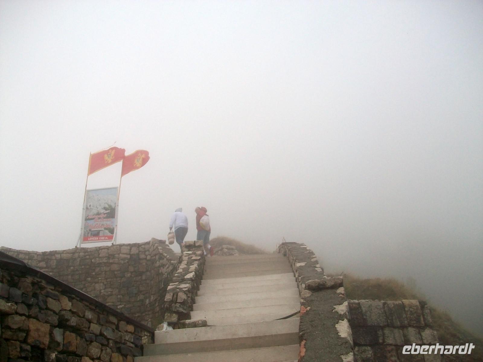 Dabei führt uns eine schmale Straße direkt hinauf in die Berge. Bald sind wir im wabernden Gebräu der Wolken verschwunden die Berggeistern gleich die Bergflanken hinaufziehen und uns den Blick verwehren. Es ist eine abenteuerliche Fahrt bergauf, immer wieder entladen Schauer ihre nasse Last, die Straße ist nur wenige Meter zu überschauen und unser serbischer Fahrer vollbringt Höchstleistungen.