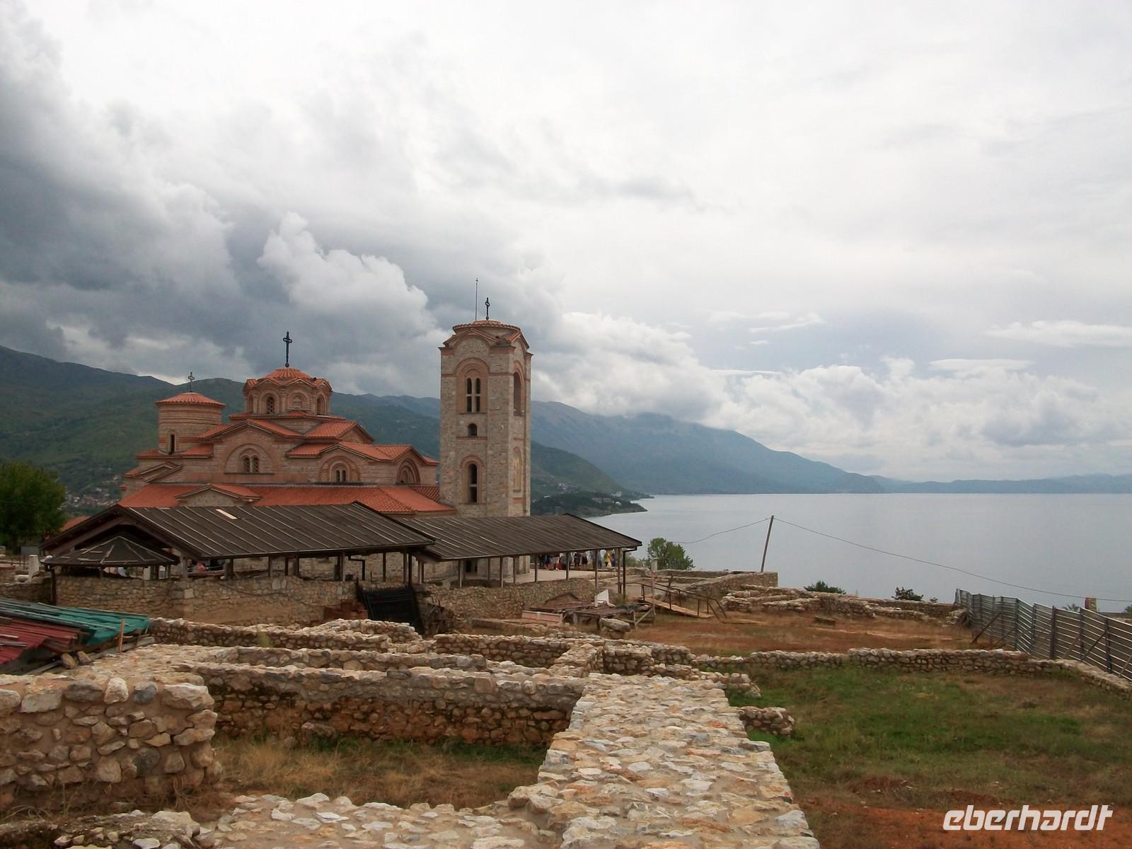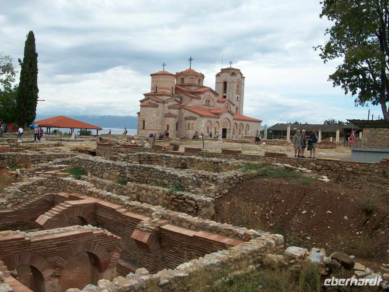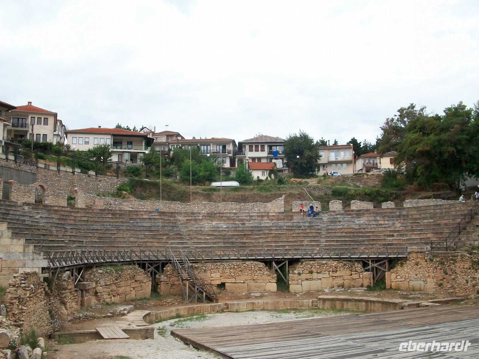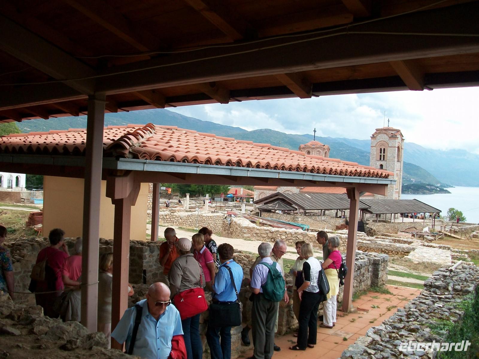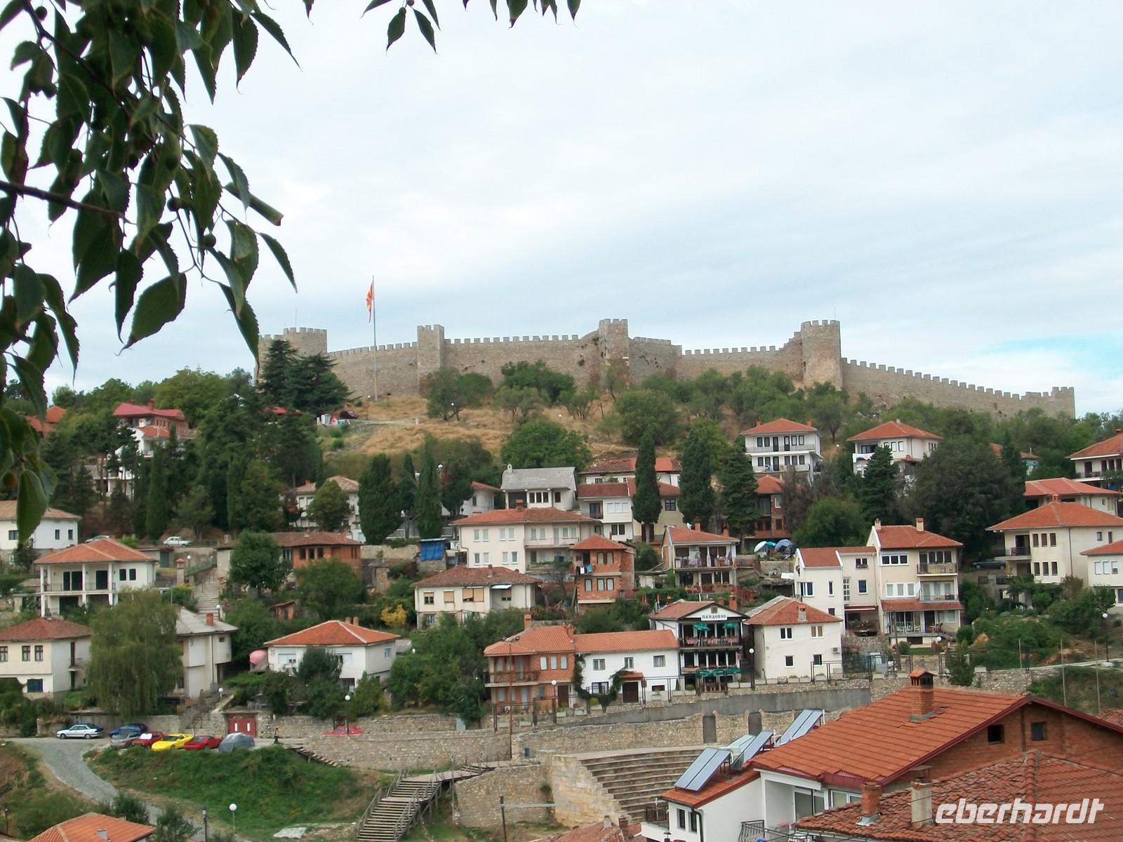 15.9.2012. Auch wenn der Himmel heute bewölkt ist, das Wetter ist nicht schlecht und es soll trocken bleiben. Wir treffen uns mit dem örtlichen Führer am Hotel und gegen halb zehn geht es los. Der Weg zur Innenstadt ist nicht weit, im Trubel der Hauptstraße steigen wir aus und sind nun auf dem Weg hinauf zum ältesten Teil der Stadt mit der Festung. Das geht nicht ganz ohne Anstrengung aber oben angelangt belohnt uns ein schöner Blick hinunter zum See für unsere Mühen. Und nicht nur dass, erst hier oben können wir so richtig eintauchen in die Historie dieses einmaligen Ortes in dem so viele Kulturen ihre Spuren hinterließen. So sehen wir Zeugnisse aus griechischer, römischer, byzantinischer Zeit gelangen zu Bauwerken die die Osmanen hier zurückließen und auch die Slawen haben ihre Kultur überliefert. Wir sehen Klöster, Kapellen, das Amphitheater und schlendern durch schmale Gassen des Ortes. Höhepunkt sind jedoch die wunderschönen Mosaiken die wir sehen können und die davon Zeugnis ablegen, dass es schon in der Antike hier eine Hochkultur gab. Leider ist unser mazedonischer Führer etwas chaotisch, aber Bogdanka als ausgebildete Historikerin versteht es immer wieder sehr gut, im entscheidenden Moment das Heft des Handelns fest in ihre kompetente Hand zu nehmen und somit gerät diese Führung auch zu einem besonderen Ereignis in einer besonderen Stadt.