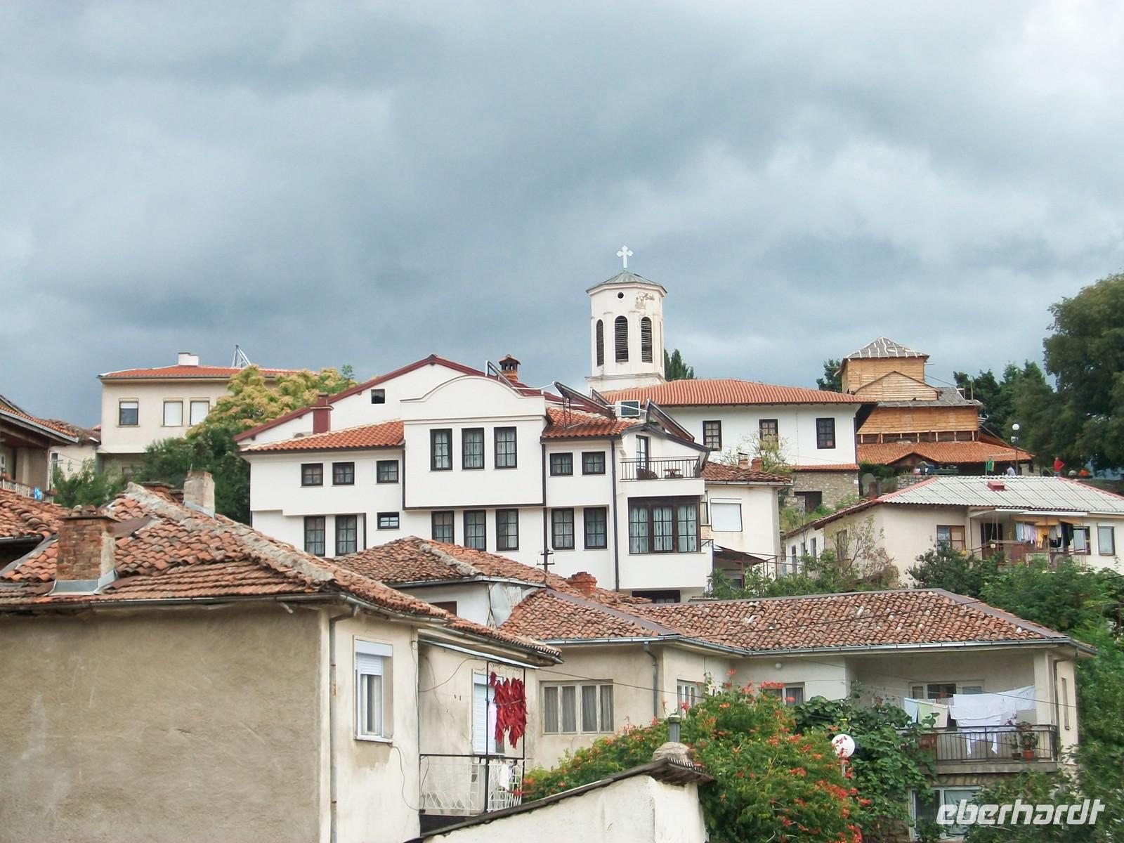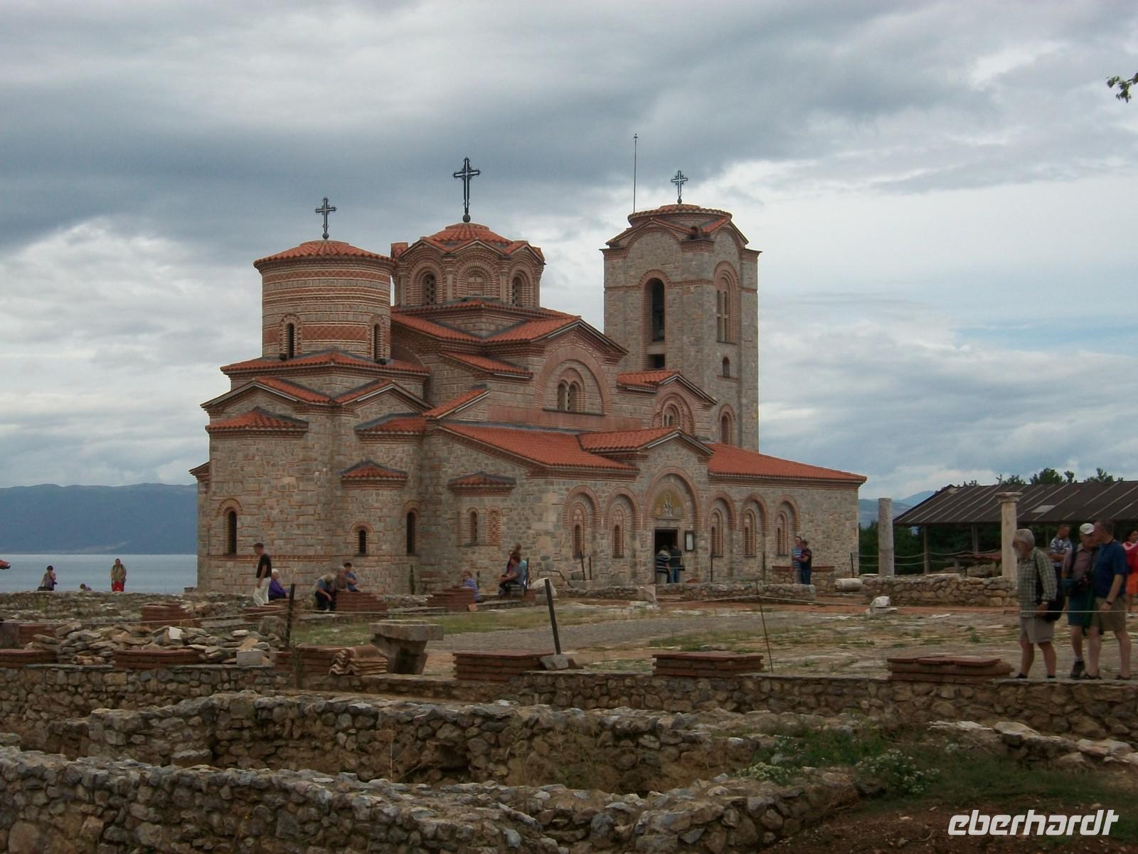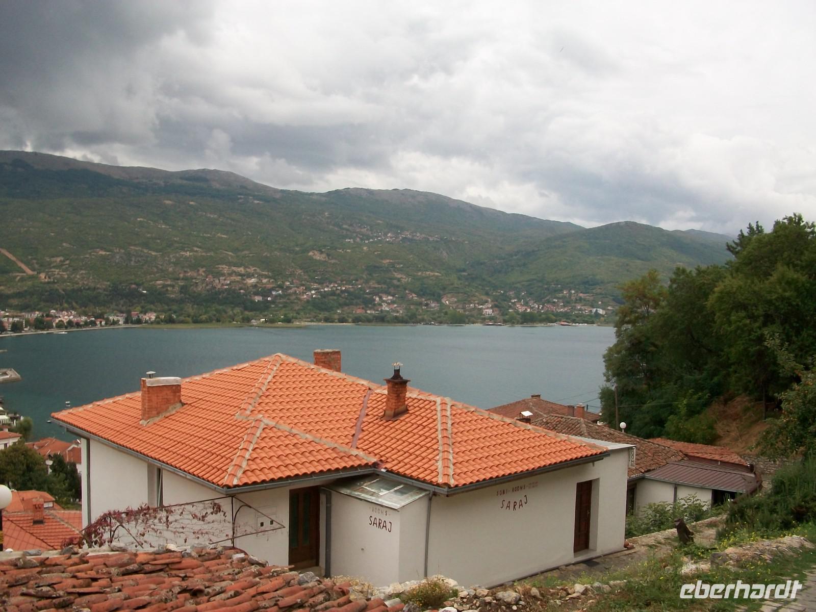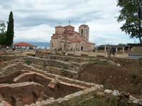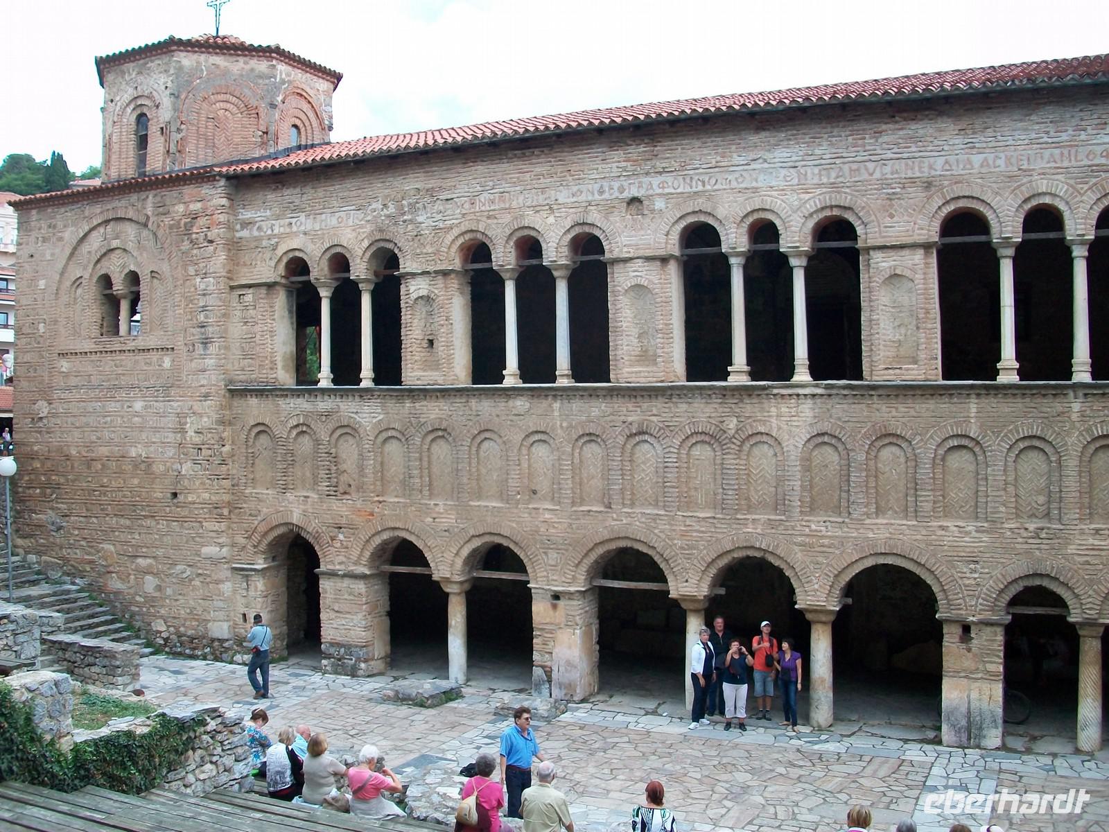 15.9.2012. Auch wenn der Himmel heute bewölkt ist, das Wetter ist nicht schlecht und es soll trocken bleiben. Wir treffen uns mit dem örtlichen Führer am Hotel und gegen halb zehn geht es los. Der Weg zur Innenstadt ist nicht weit, im Trubel der Hauptstraße steigen wir aus und sind nun auf dem Weg hinauf zum ältesten Teil der Stadt mit der Festung. Das geht nicht ganz ohne Anstrengung aber oben angelangt belohnt uns ein schöner Blick hinunter zum See für unsere Mühen. Und nicht nur dass, erst hier oben können wir so richtig eintauchen in die Historie dieses einmaligen Ortes in dem so viele Kulturen ihre Spuren hinterließen. So sehen wir Zeugnisse aus griechischer, römischer, byzantinischer Zeit gelangen zu Bauwerken die die Osmanen hier zurückließen und auch die Slawen haben ihre Kultur überliefert. Wir sehen Klöster, Kapellen, das Amphitheater und schlendern durch schmale Gassen des Ortes. Höhepunkt sind jedoch die wunderschönen Mosaiken die wir sehen können und die davon Zeugnis ablegen, dass es schon in der Antike hier eine Hochkultur gab. Leider ist unser mazedonischer Führer etwas chaotisch, aber Bogdanka als ausgebildete Historikerin versteht es immer wieder sehr gut, im entscheidenden Moment das Heft des Handelns fest in ihre kompetente Hand zu nehmen und somit gerät diese Führung auch zu einem besonderen Ereignis in einer besonderen Stadt.
