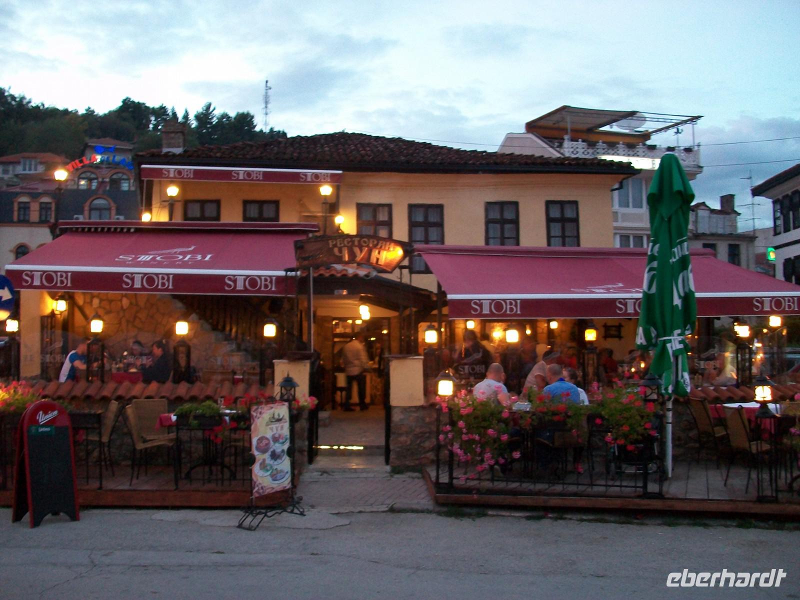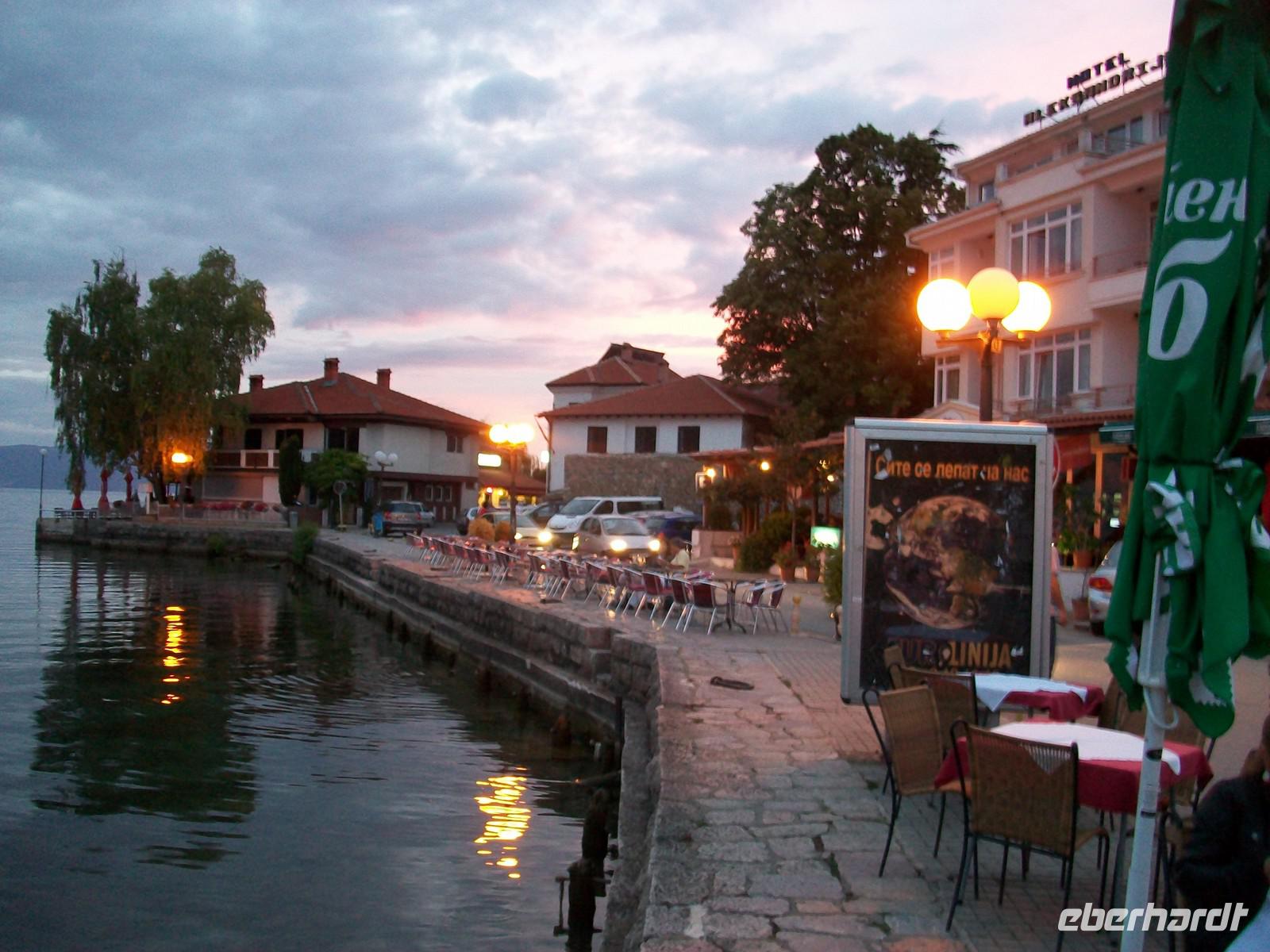Nach den Formalitäten sind wir auf dem Weg hinunter, im Ort Ohrid direkt am Seeufer, befindet sich unser Restaurant in dem wir heute mit einheimischen mazedonischen Speisen in reichhaltiger Auswahl verwöhnt werden. Es war ein turbulenter Tag, aber beim Sitzen am See, untermalt von einheimischen Klängen die uns drei Musiker bringen, klingt auch dieser Tag in Ruhe aus und macht uns Appetit auf den Morgigen an dem wir diesen reizvollen Ort erkunden werden.