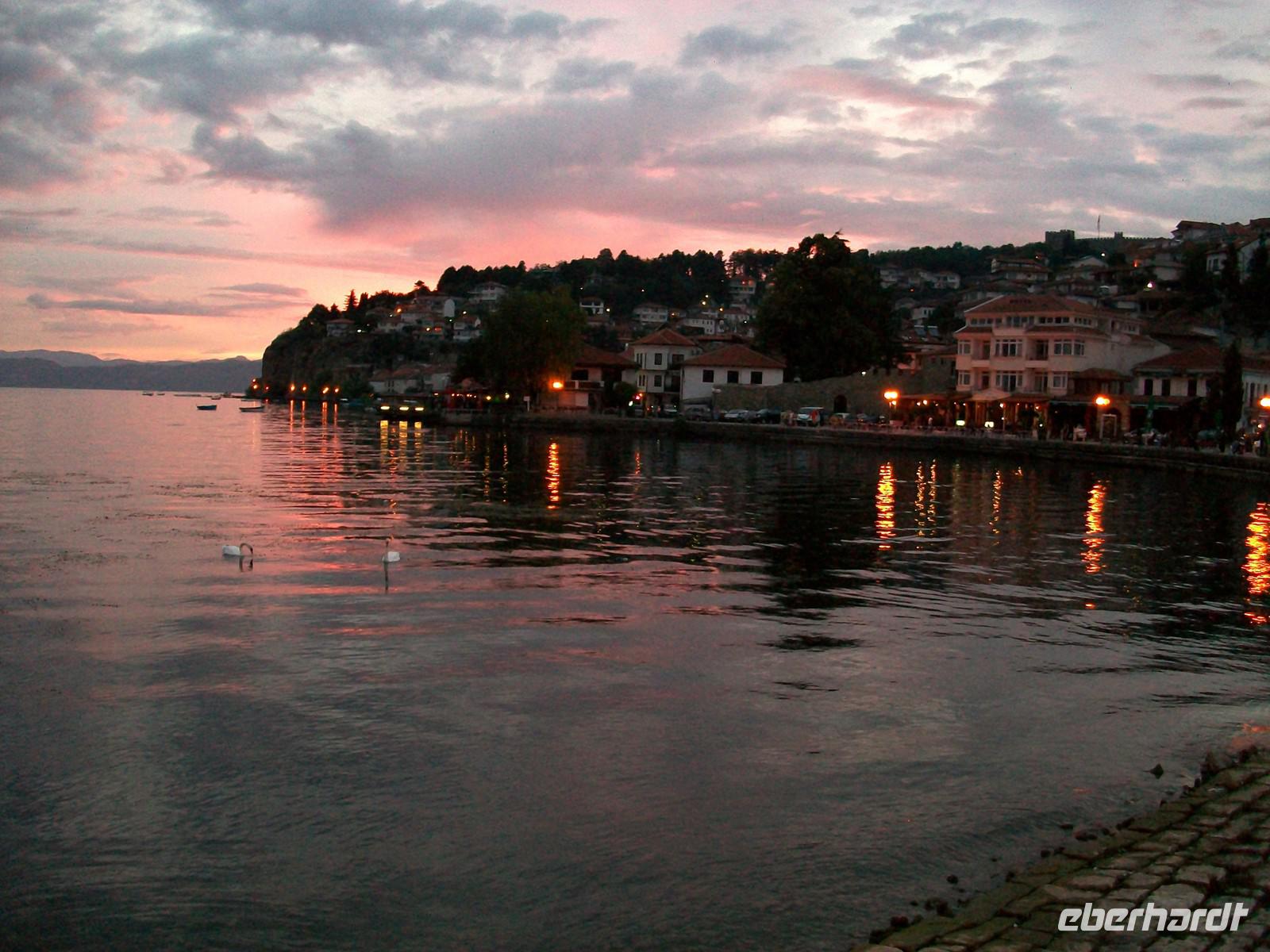 Unsere Reisegruppe hat sich 18.00 Uhr versammelt, der Bus bringt uns direkt zum See an die schöne Promenade wo wir in romantischer Lage wieder ein schmackhaftes Abendessen genießen werden. Der Abend ist noch angenehm mild und auf der überdachten Terrasse wird uns wiederholt ein schmackhaftes und reichhaltiges Essen serviert. Dabei können wir den Blick auf den See schweifen lassen, hinter den Häusern am Hang geht die Sonne unter und malt dabei eine schöne rote Farbe ans Firmament. Mit diesen wunderschönen Impressionen ist nun auch dieser Tag vergangen, morgen heißt es nun leider schon Abschiednehmen vom Ohridsee, dieser Perle inmitten des Balkans.