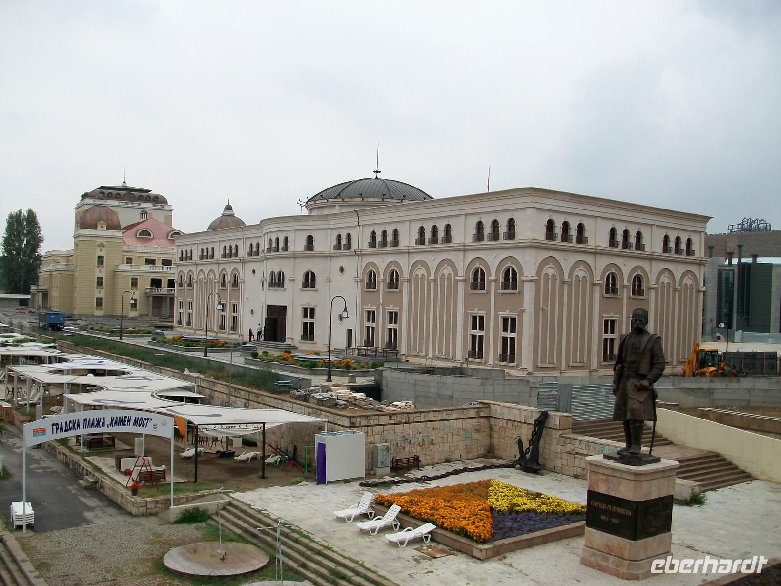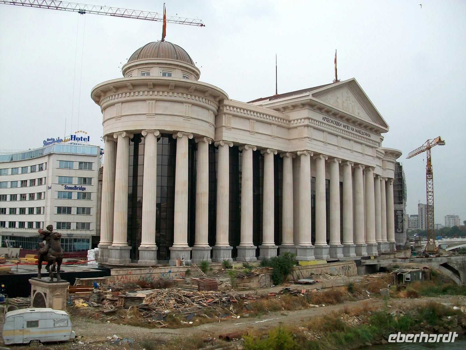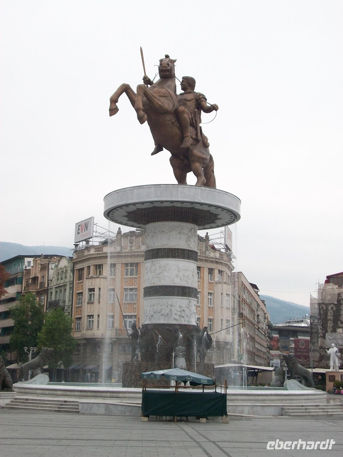 In Skopje wir derzeit immer noch viel gebaut, die Bauten und Denkmäler die hier entstehen sind sehr monumental. Auf der linken Seite entsteht der neoklassizistische Bau der Bibliothek, mächtige Säulen die der Antike nachgeahmt sind ziehen die Blicke der Besucher auf sich. Dann führt uns der Weg über die Steinbrücke hinüber in den modernen Teil der Mazedonischen Hauptstadt; vor uns ist das überdimensionierte Denkmal Alexander des Großen zu sehen, er sitzt auf dem Pferd und reckt das Schwert gen Griechenland...