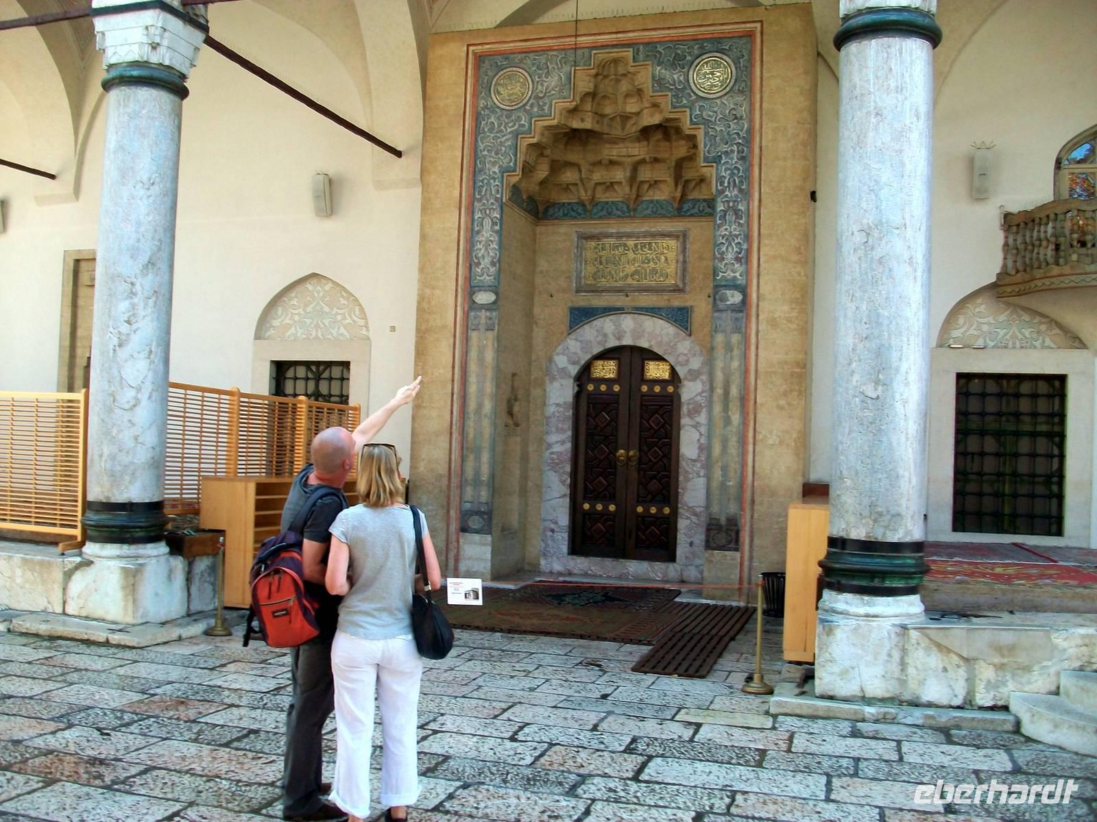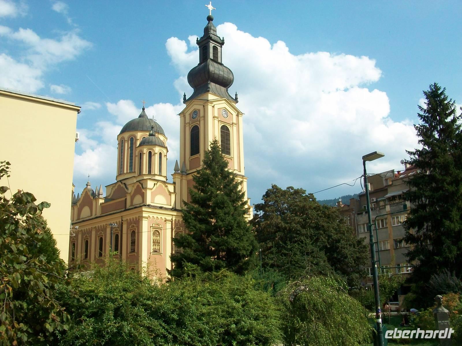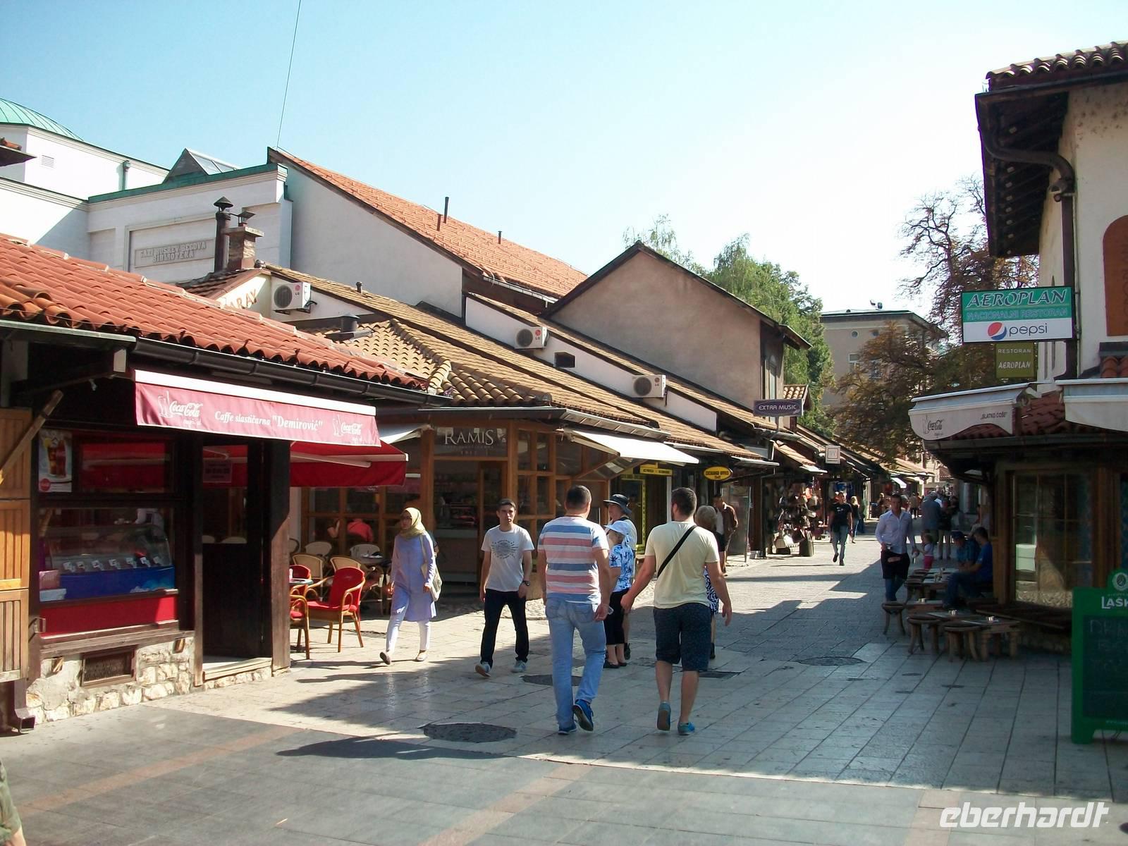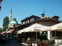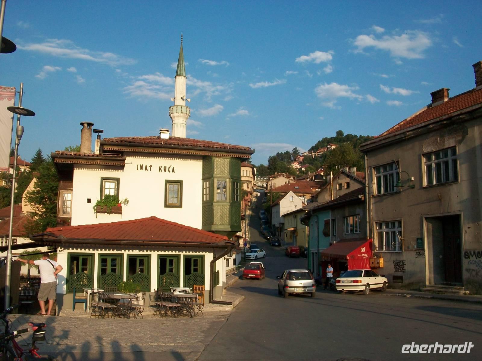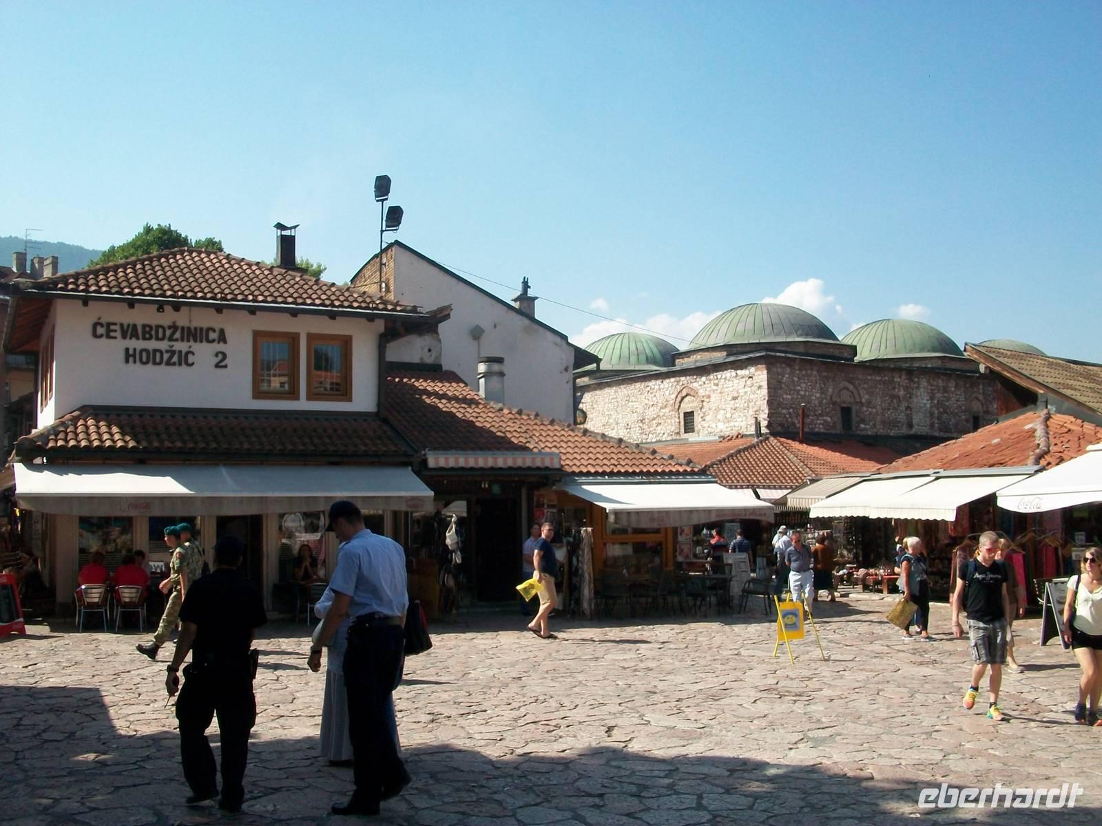Der Rundgang beginnt an der Ewigen Flamme, sie erinnert an die Opfer des 2. Weltkrieges. Dann führt uns der Weg über die belebte Fußgängerzone zur serbisch- orthodoxen Kirche. Es ist ein schöner Bau aus Habsburger Zeiten; dieser Teil der Stadt stammt aus der österreichisch- ungarischen Monarchie. Dann führt uns der Weg zum jüdischen Viertel und der Synagoge und als wir weiter gehen, überschreiten wir die Grenze zum Morgenland. Der alte türkische Teil mit den so typischen niedrigen Häusern, dem Basar und den Moscheen, blieb erhalten wie er war, und somit sind wir hier mit nur einem Schritt im Orient angelangt!