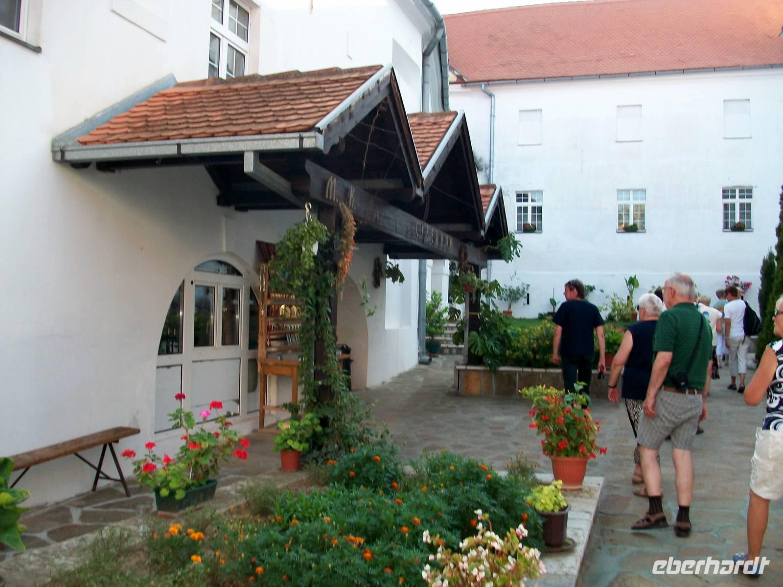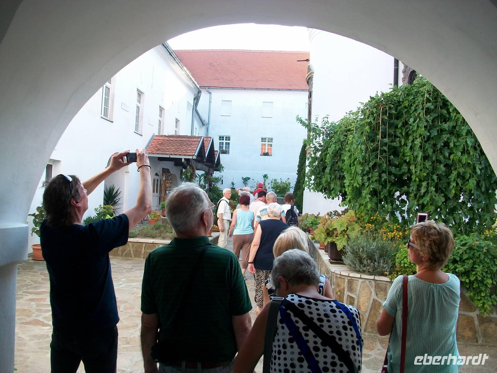 Nun haben wir uns aber eine Pause verdient. Im gut klimatisierten Bus gelangen wir nach Sremski Karlovci und in einem der alten Häuser hat sich im Garten ein Weinkeller versteckt. Der Weinbau hat hier eine lange Tradition und auf einer gemütlichen Terrasse im Schatten hat unsere Reisegruppe Platz genommen um die edlen Tropfen der Region zu genießen.