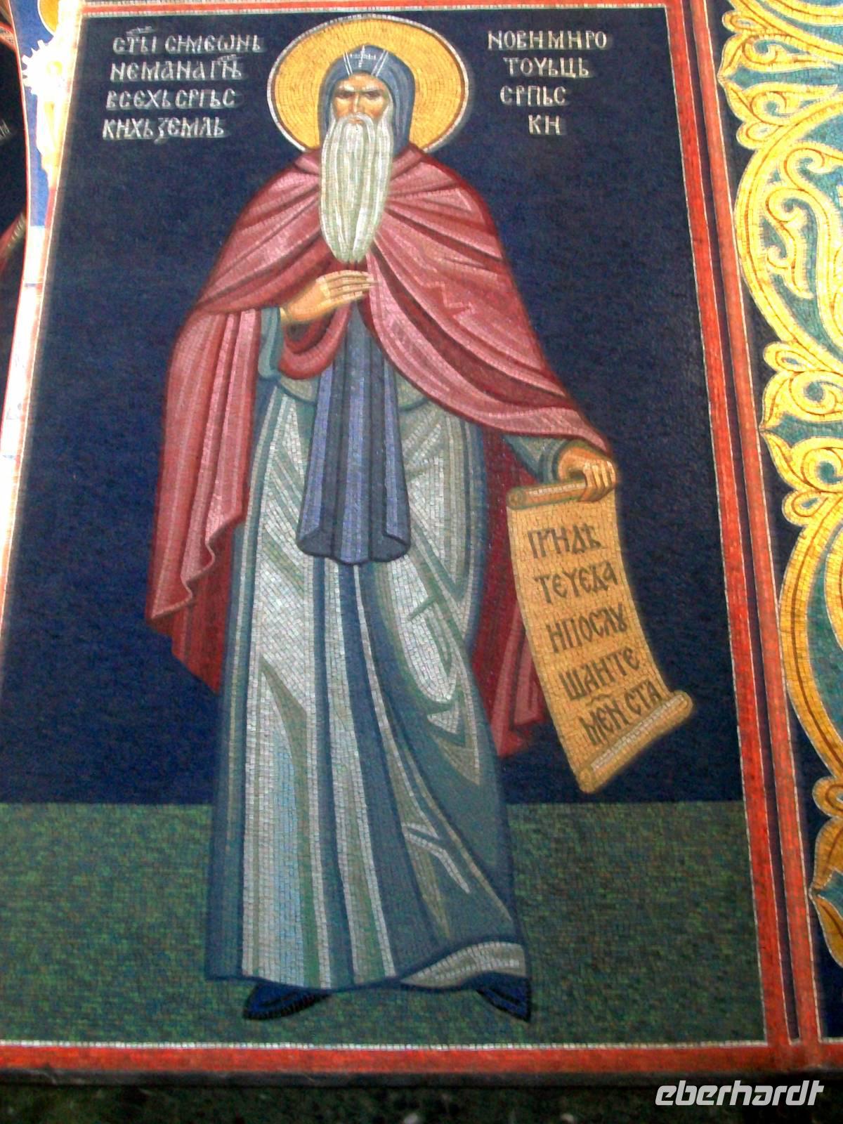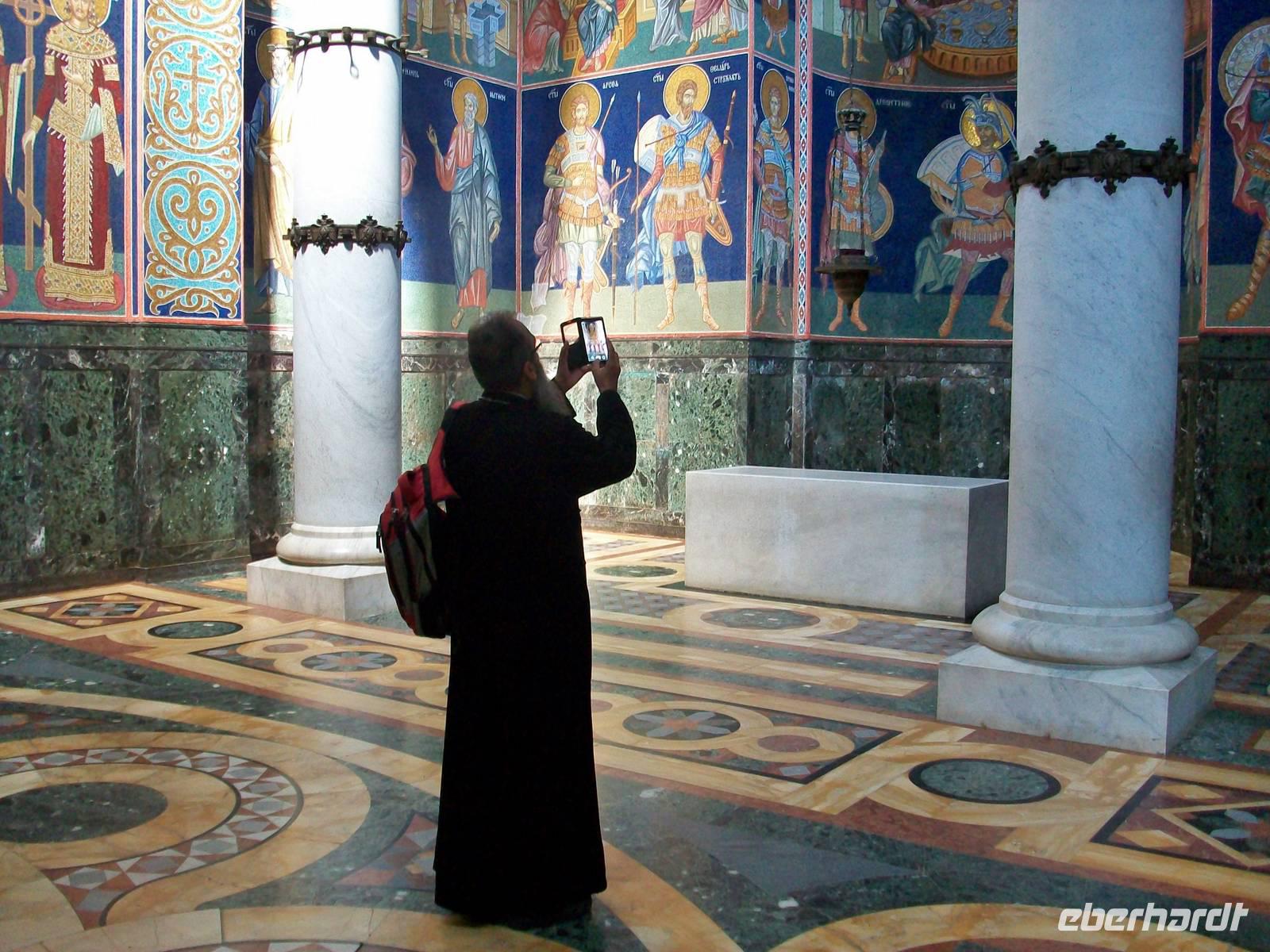 Wir besuchen die Kirche zum Heiligen Sava, ein monumentaler Kuppelbau, aber schon seit Jahrzehnten im Bau; im Innern hören wir leise Gesänge orthodoxer Mönche was der Sache eine große Feierlichkeit verleiht. Vor den aufgestellten Ikonen sehen wir Menschen die sich bekreuzigen und Bogdanka macht uns auf dieser Reise erstmalig vertraut mit den Besonderheiten der serbischen Kirche.