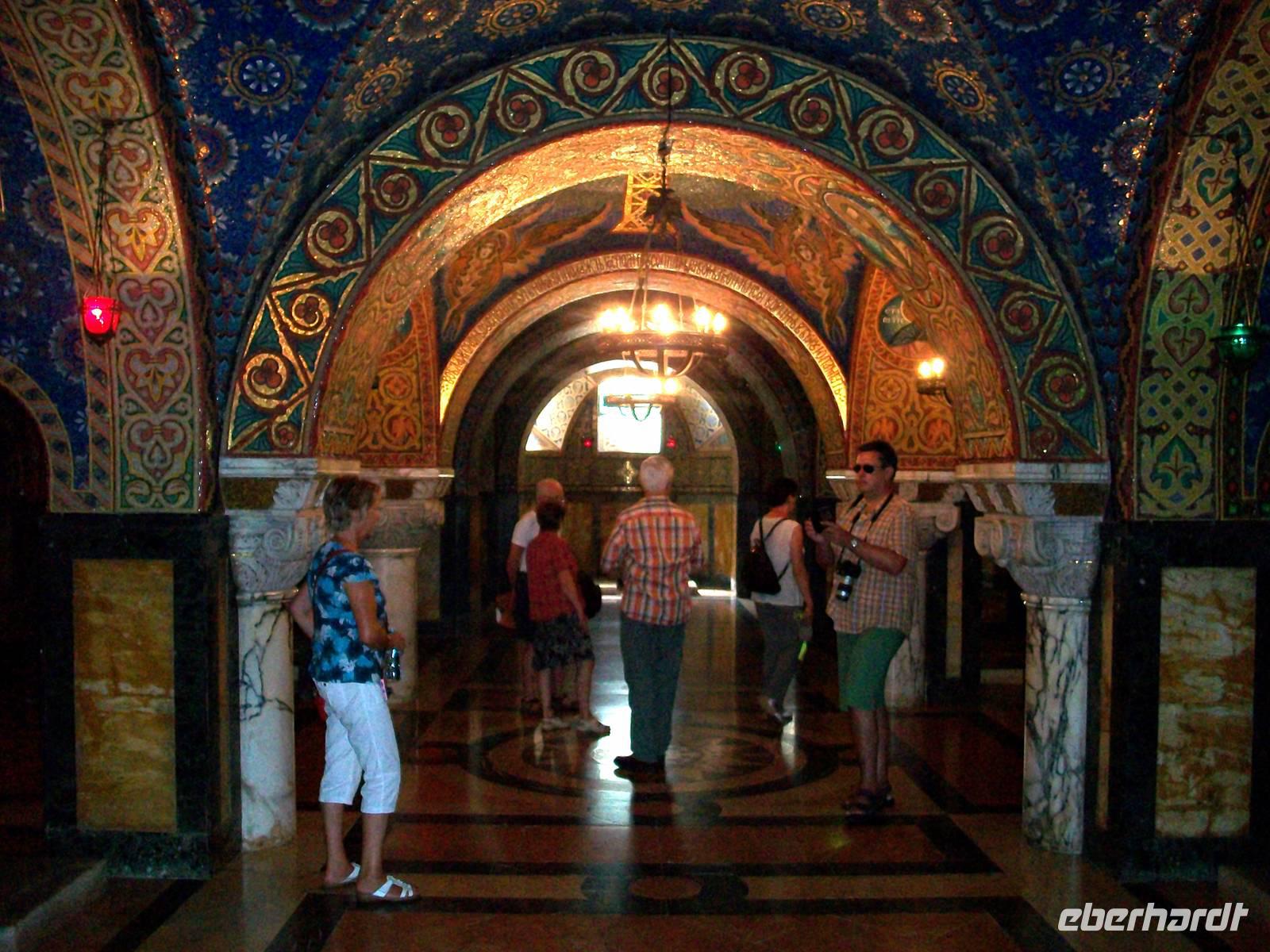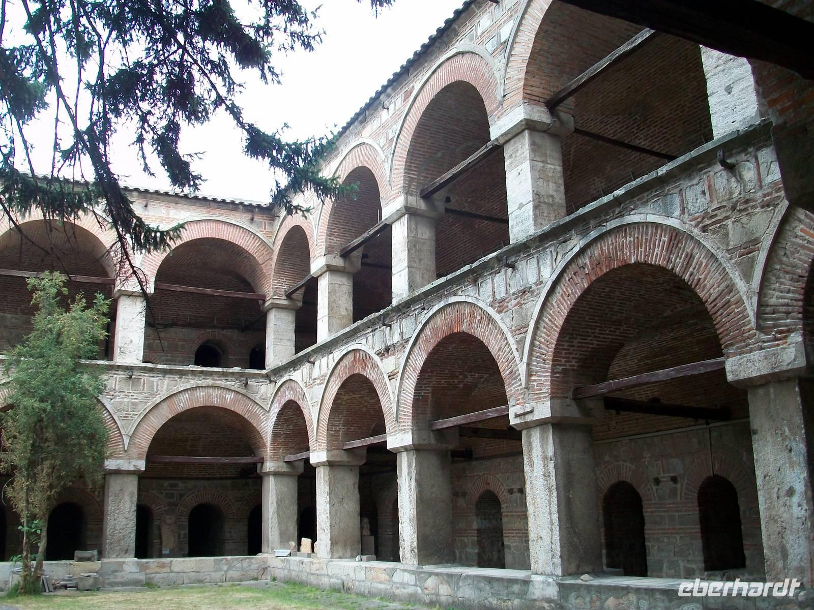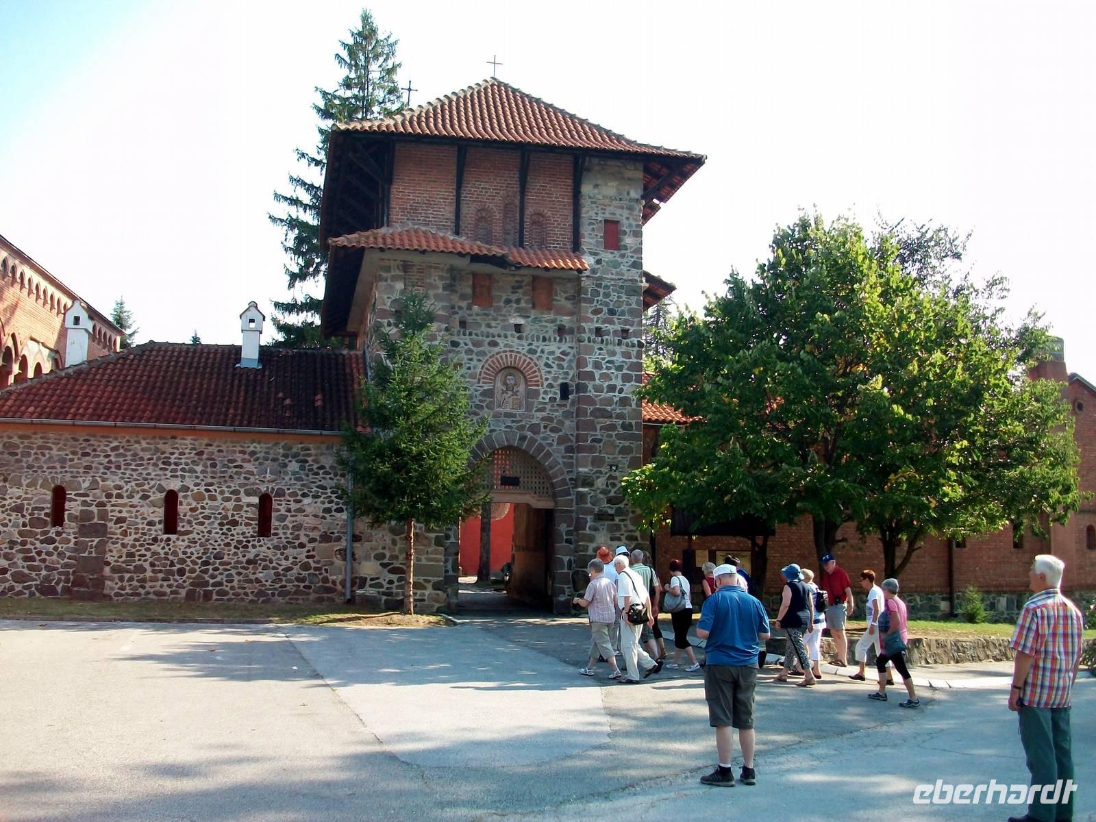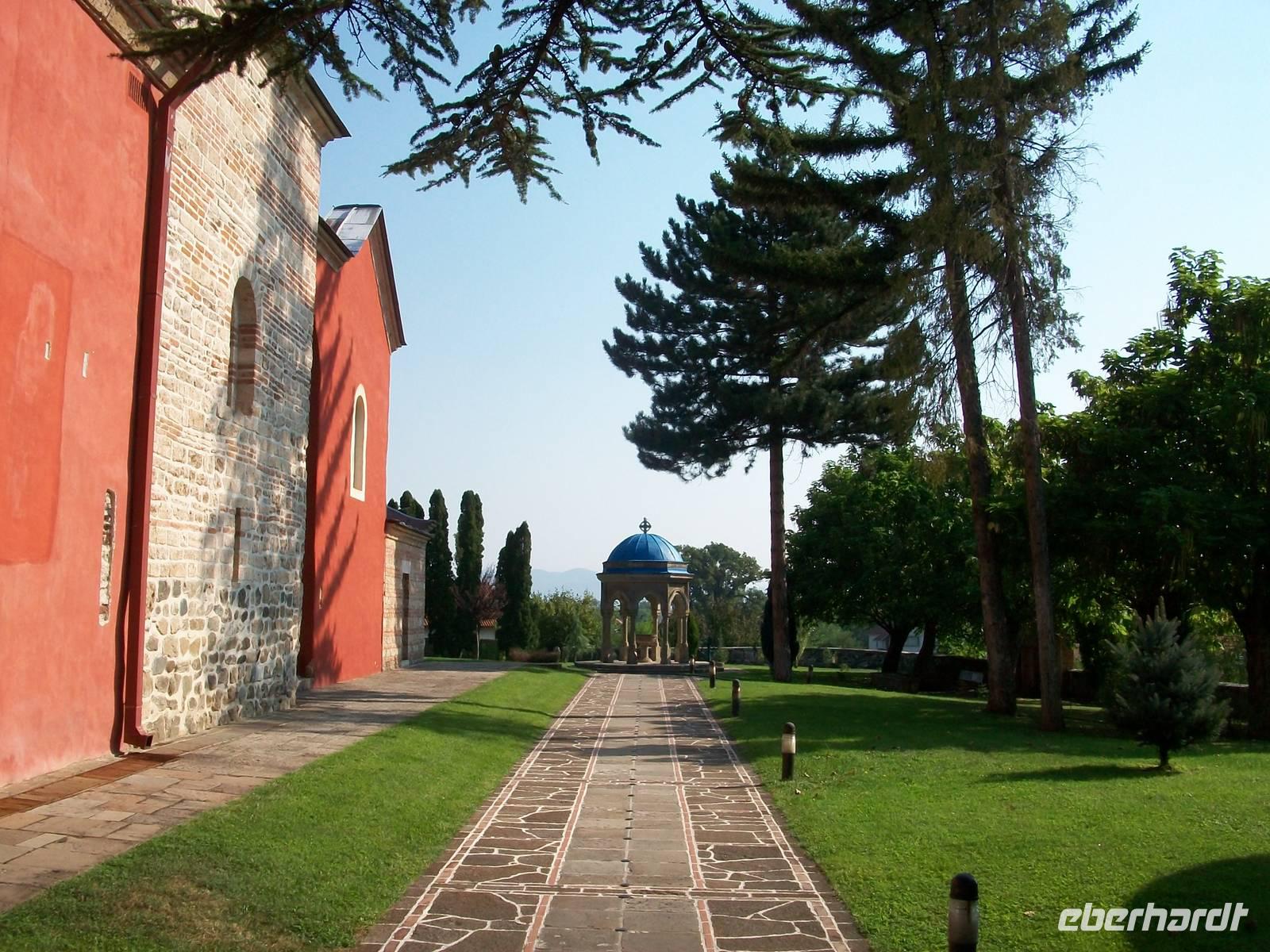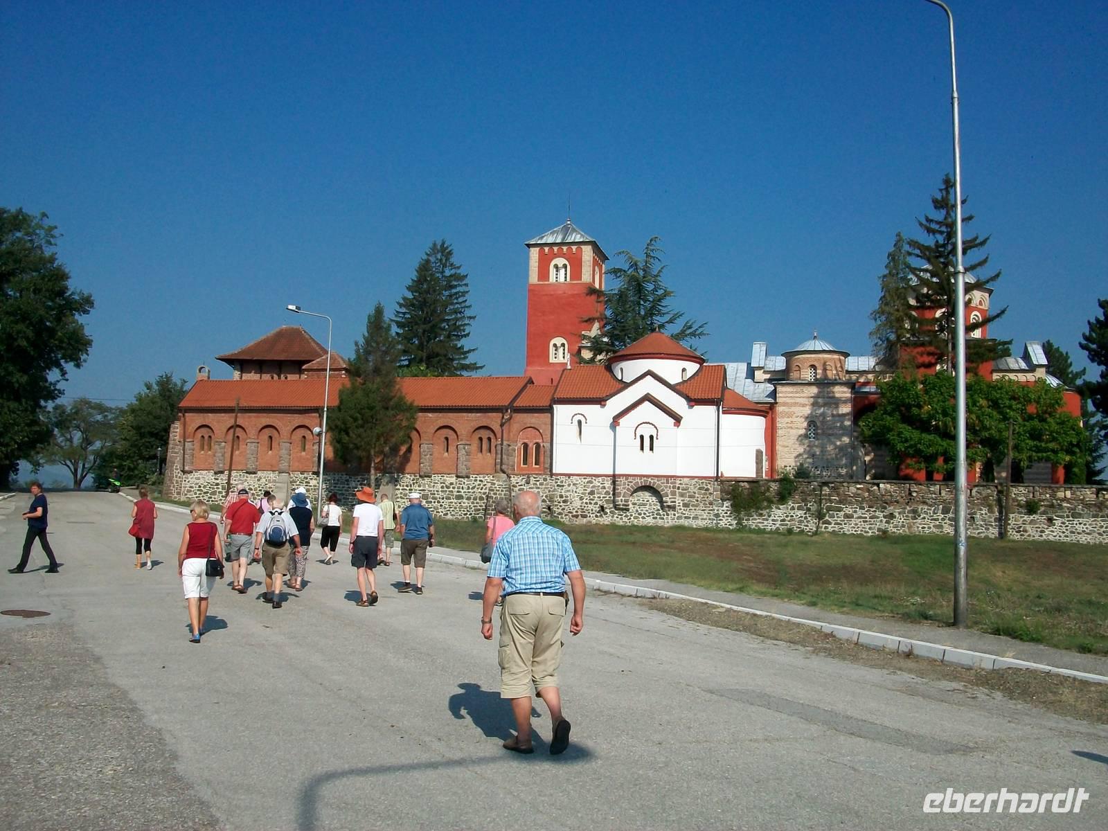 Zunächst gibt es einen kleinen Aufstieg durch den Wald und dann sehen wir die schöne Georgskirche vor unseren Augen. Als wir das Innere dieses Gotteshauses betreten kommen wir aus dem Staunen nicht mehr heraus. Der gesamte Innenraum wurde mit Mosaiken ausgelegt; das Auge kann sich an diesen schönen Motiven aus der biblischen Geschichte gar nicht satt sehen. Eine Treppe führt uns hinab zur Krypta und den Grabmalen. Hier im Halbdunkel herrscht eine eigentümliche Atmosphäre die noch durch eine magische Beleuchtung verstärkt wird. An diesem besonderen Ort reiht sich Grabmal an Grabmal, die Mitglieder der serbischen Dynastie Kardordevic fanden hier ihre letzte Ruhe, andachtsvoll stehen wir vor diesen ewigen Zeugnissen.