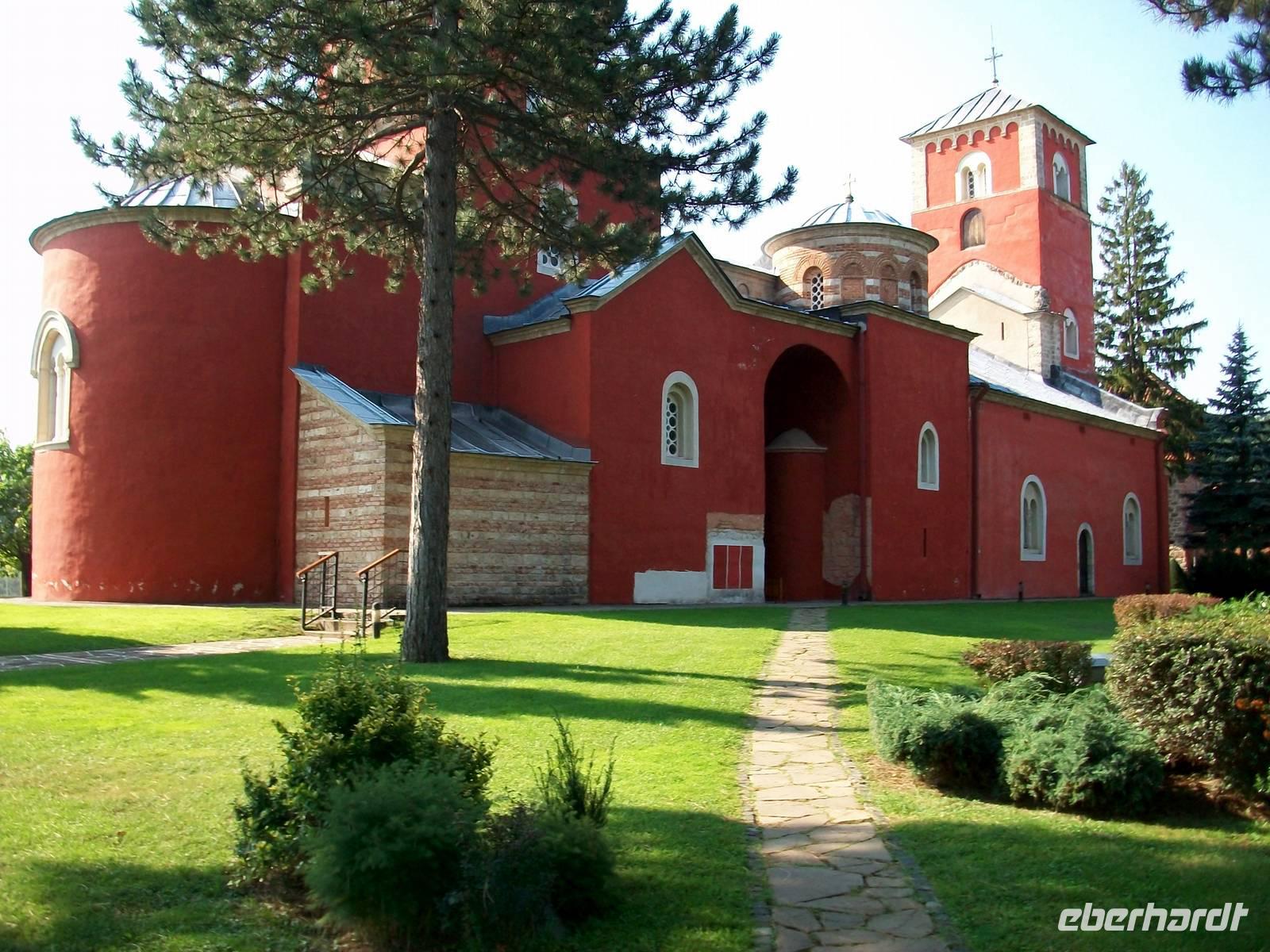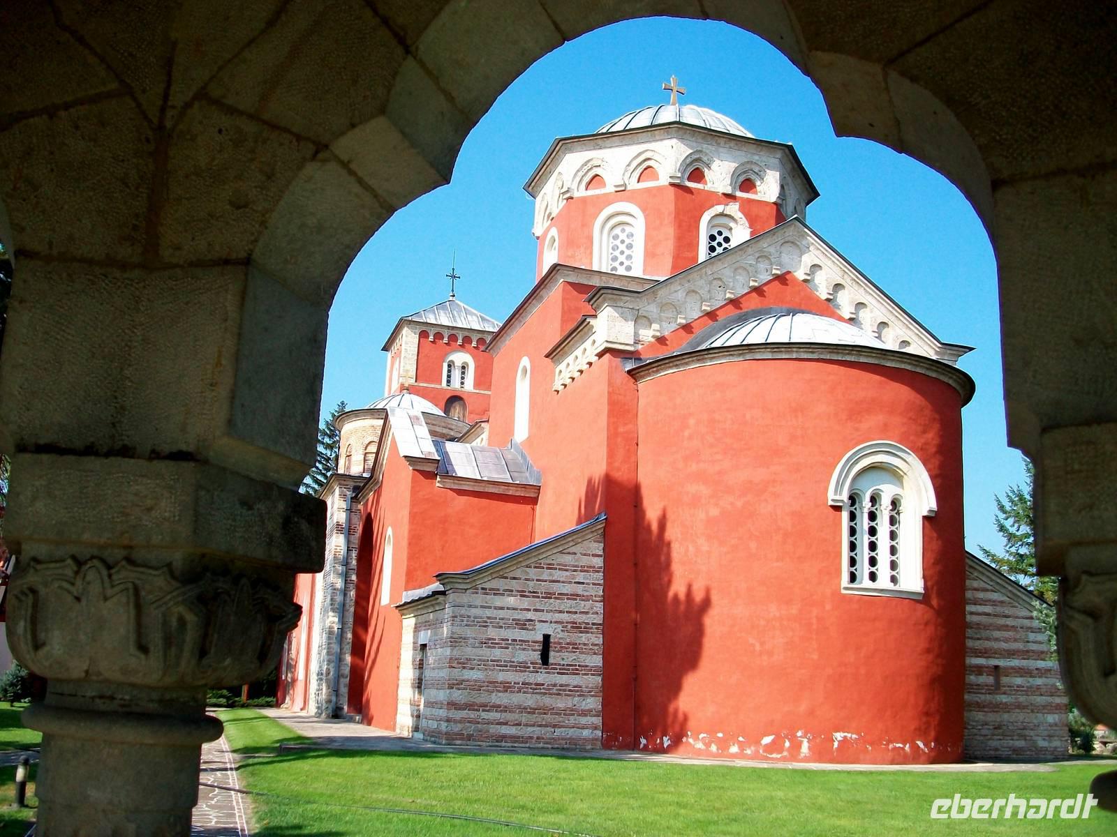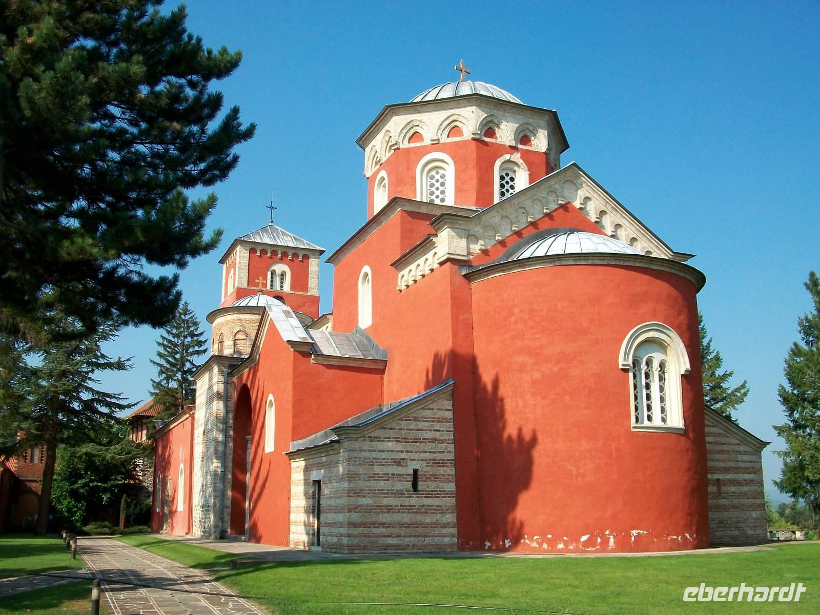 1.9.2015. Kein Wölkchen trübt den Himmel und das Thermometer steht schon fast wieder bei 30° als wir den gastlichen Ort verlassen. Nach einer halben Stunde kommt ein rotes Gebäude in unser Sichtfeld welches direkt an der Straße liegt, es ist das Kloster Žica. Da wir heute auch wieder genügend Zeit haben, genehmigen wir uns den Besuch außer der Reihe und Bogdanka wird uns auch hier in die Details einführen. Die Inneneinrichtung ist beeindruckend, die Malereien sehenswert und die Außenanlage äußerst gepflegt.