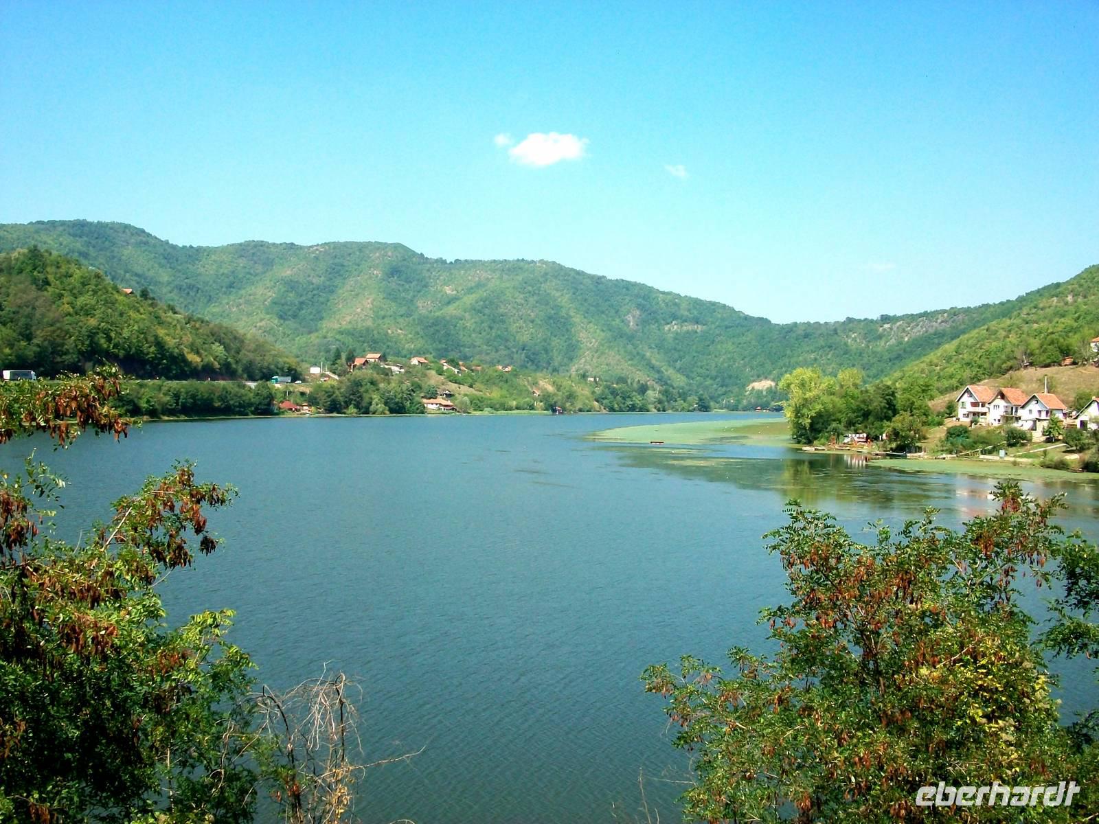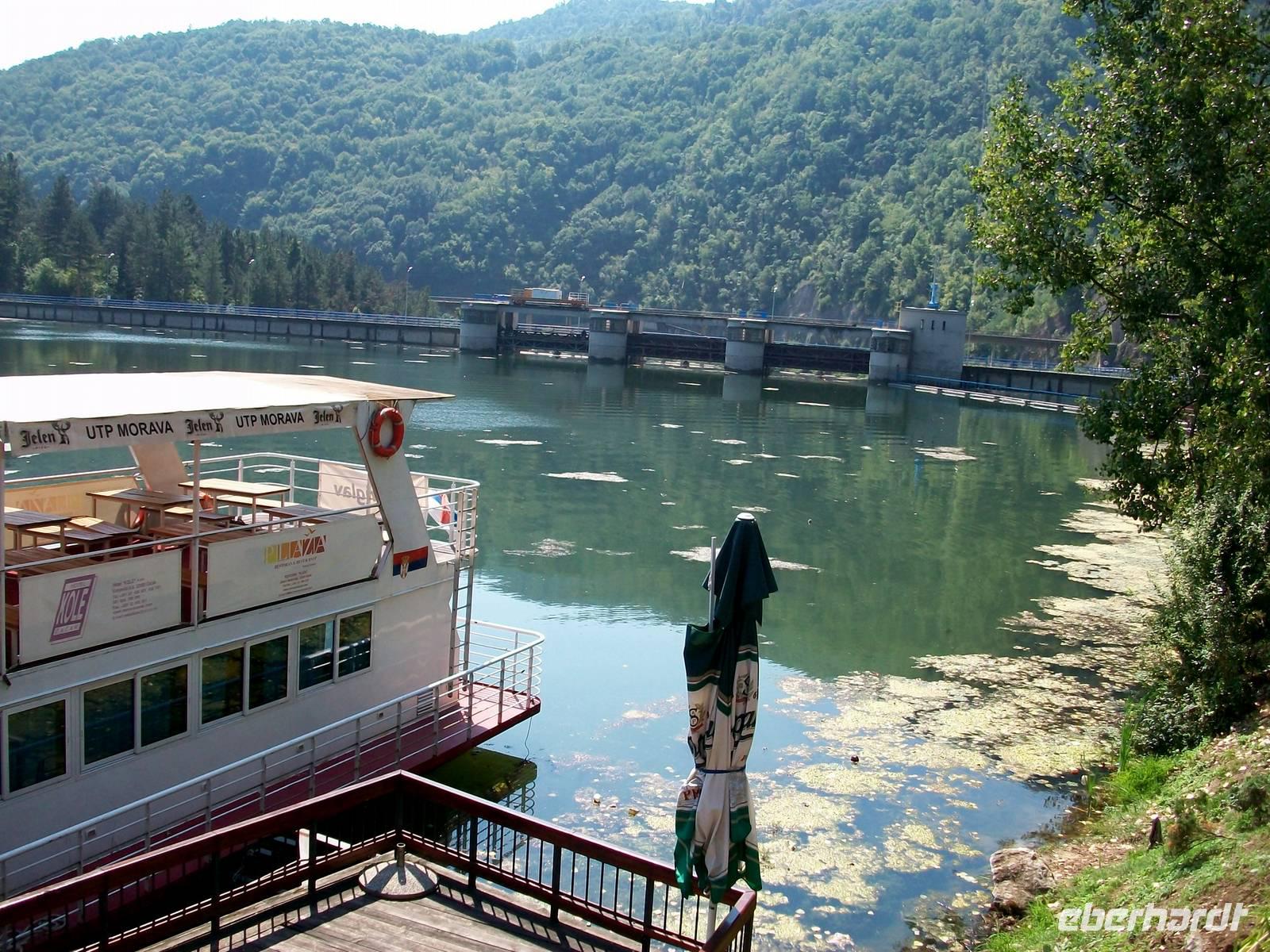 Dann geht es weiter im Gebiet der Westlichen Morava; dieser Fluss bildet an manchen Stellen eine romantische Schlucht deren Verlauf wir folgen. Eine Pause machen wir hier an einer besonders schönen Stelle mit Blick auf einen Stausee und den Wald der das Wasser umgibt.