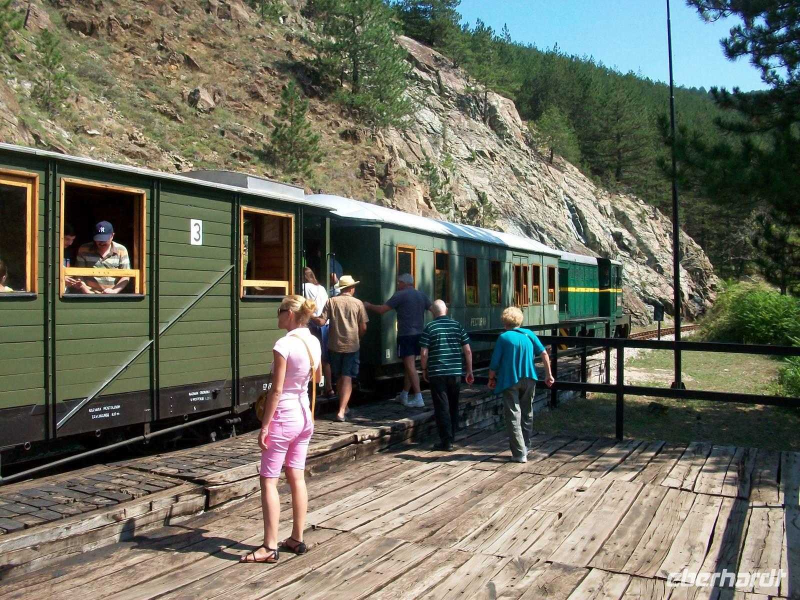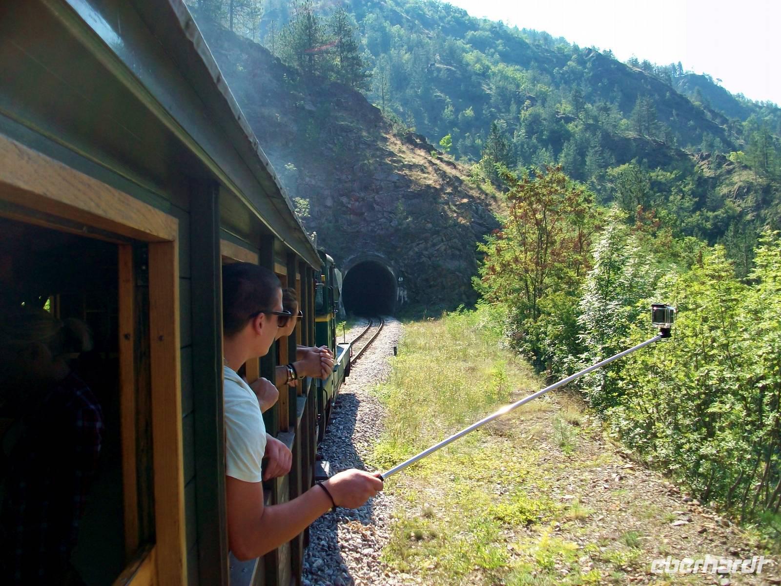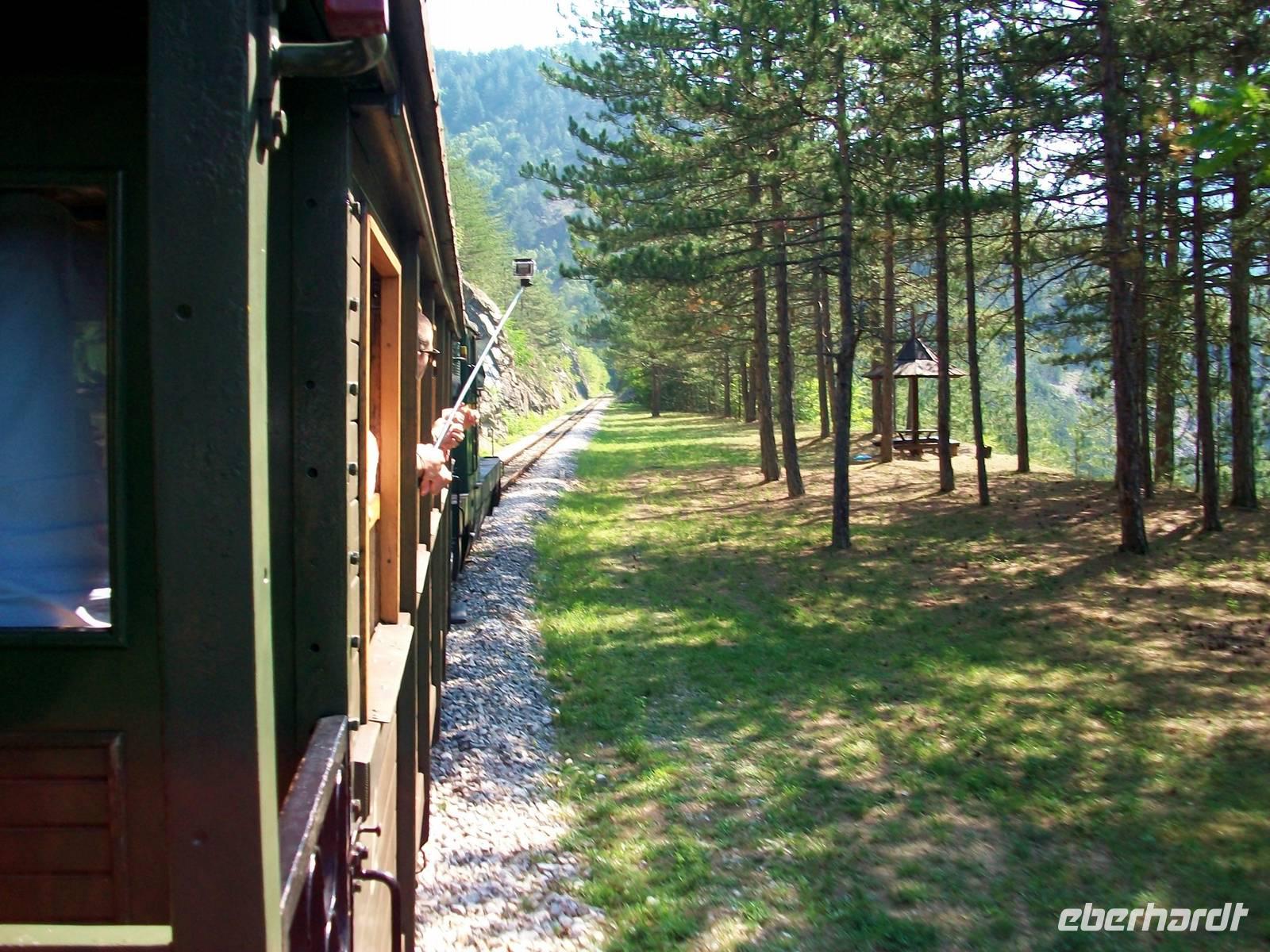 10.30 Uhr, ein schriller Pfiff gibt das Abfahrtssignal, der Zug ruckt an und die romantische Fahrt durch die Bergwelt Serbiens beginnt. Die Wagen sind historisch und sehr liebevoll gestaltet und irgendwie fühlen wir uns auch heute in der Zeit zurückversetzt. Durch Tunnel und über Brücken führt die Fahrt, dann wieder an Schluchten vorbei und durch lichten Wald hindurch mit Blick auf das schöne Land, so vergeht die Zeit wir im Flug. Am Endpunkt wird die Lok umgespannt und mit ausreichend Fotostopps geht die Fahrt zum Ausgangspunkt zurück. Dabei werden wir von dem schönsten Sommerwetter verwöhnt was man sich überhaupt vorstellen kann.