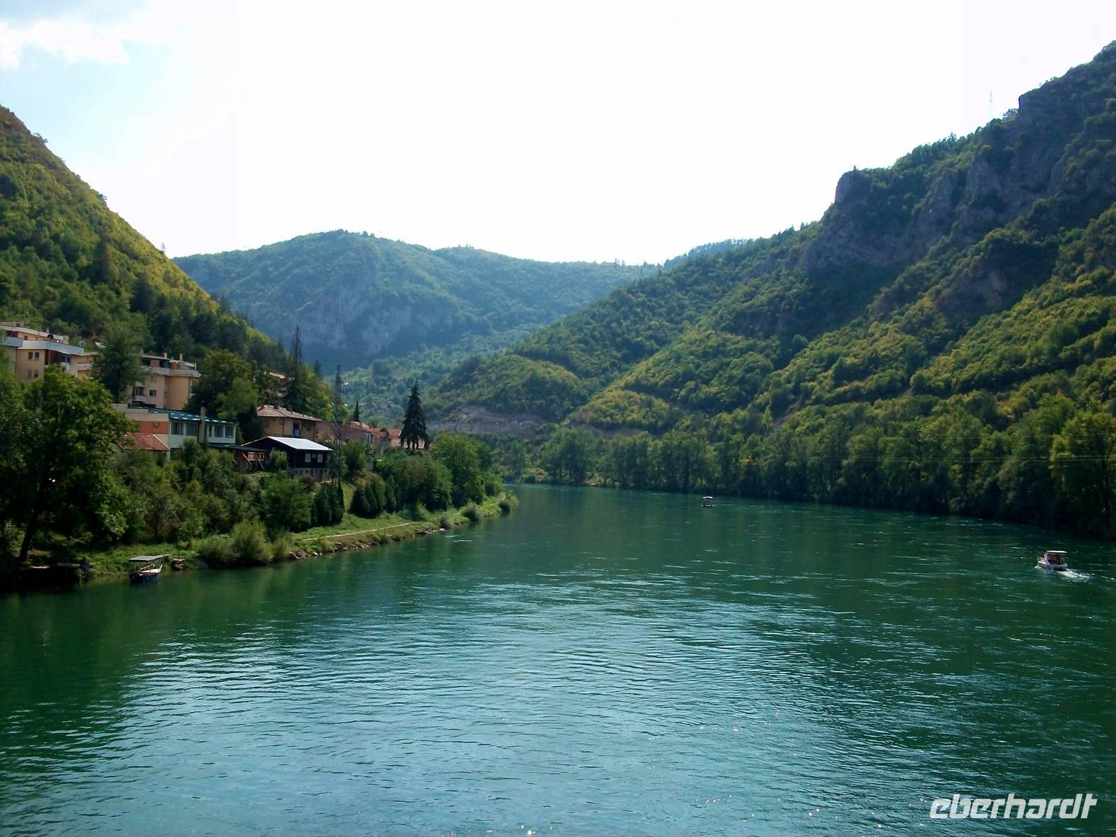 Durch die weißen Bögen des Kalksteins schlängelt sich der Fluss Drina der einen grünlichen Schimmer hat- ein schöner Kontrast.