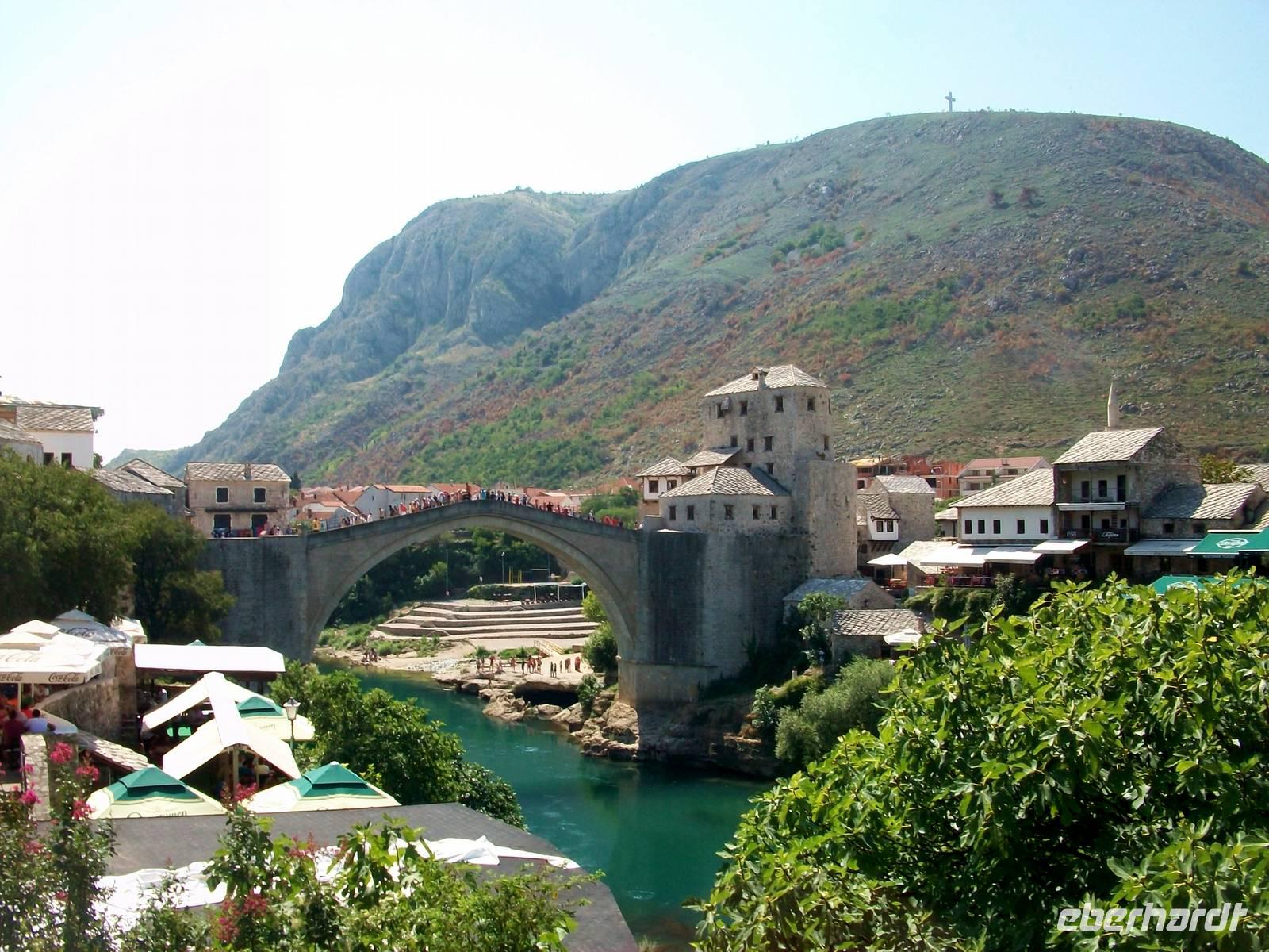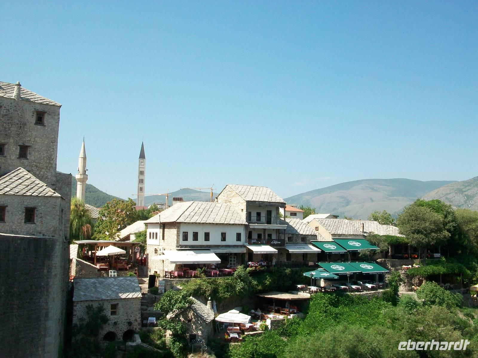 Weiter flussabwärts führt uns die Tour durch die wildromantische Neretvaschlucht. Etwas später gelangen wir dann zu unserem ersten größeren Ziel: Mostar. Unser Weg führt uns zunächst oberhalb der Stadt vorbei und unter uns, im Tal liegend, sehen wir schon die spitzen Minarette der Moscheen, die alten türkischen Häuser und die Neretva wie sie sich mit ihren grünlichen Fluten durch Mostar schlängelt.