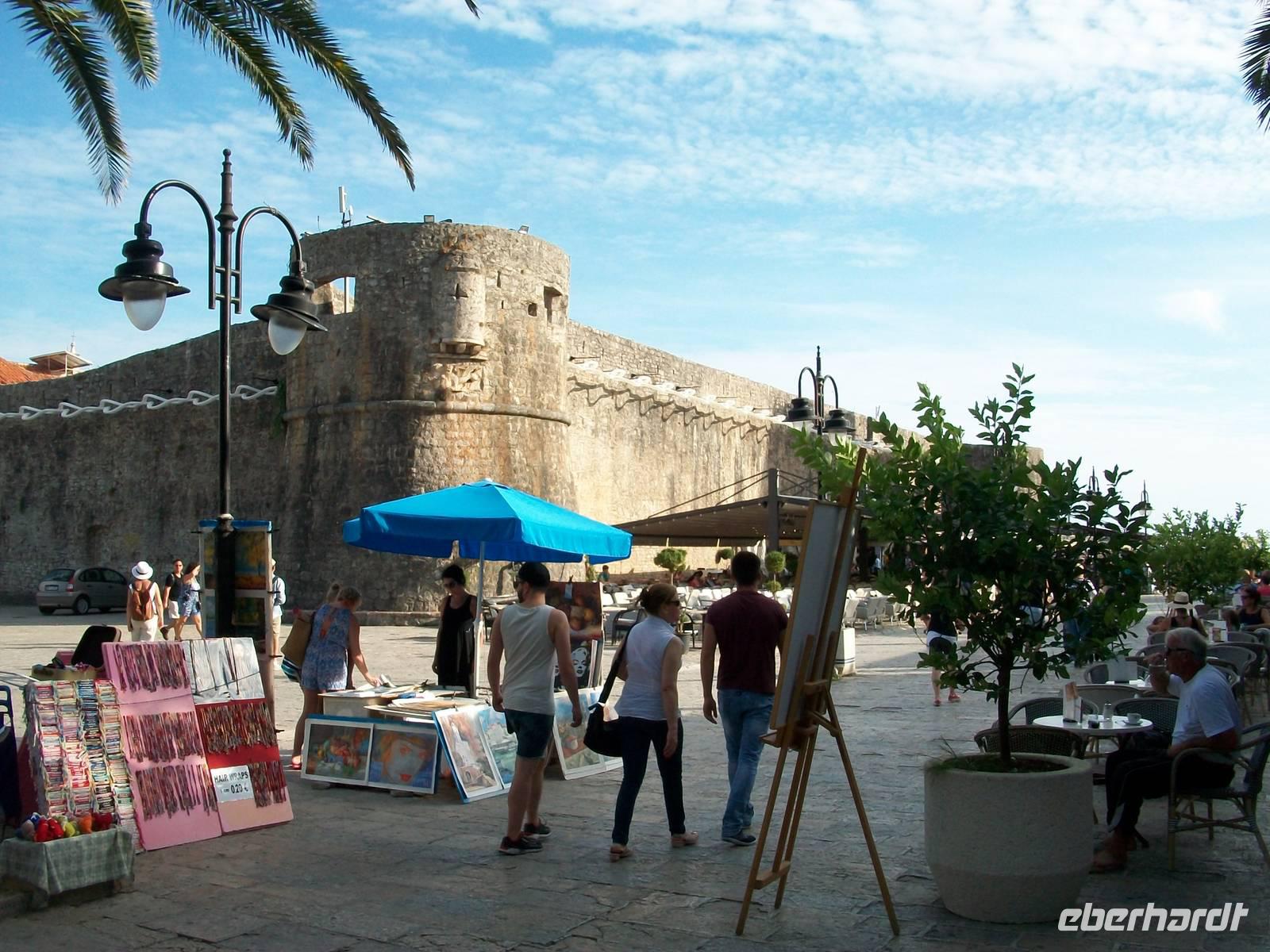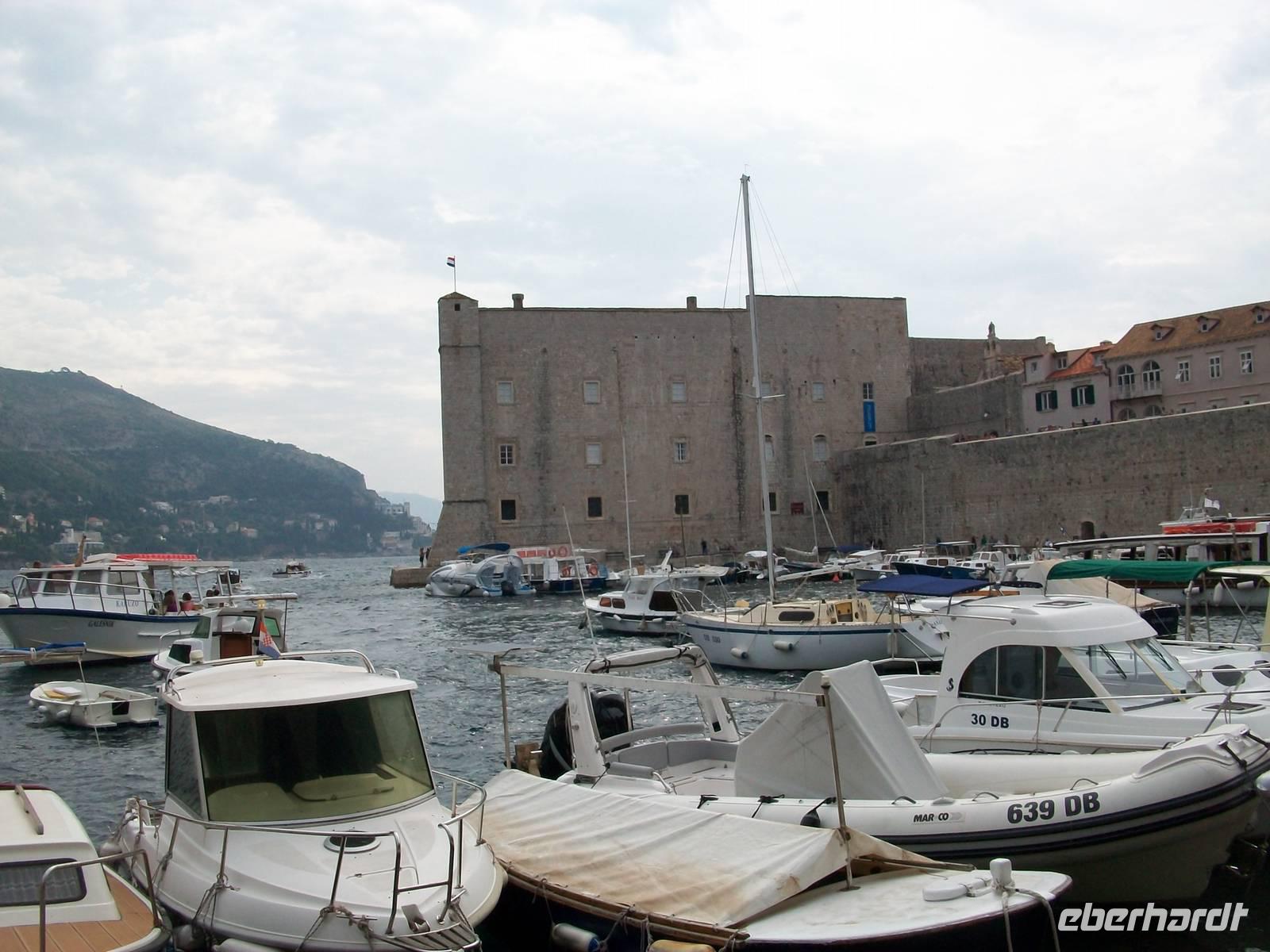 Ein Kreuzfahrer hat angelegt und somit sind wir heute nicht allein in der Stadt. Dennoch, mit Antea gelangen wir zu allen Sehenswürdigkeiten von Dubrovnik und mit ihren Erklärungen lässt sie die Historie längst vergangener Zeiten vor unseren geistigen Augen auferstehen. Am Franziskanerkloster vorbei geht es nun durch eine schmale Gasse in welcher die gepflegten Restaurants ihre leckeren Speisen präsentieren. Dann hinunter zum Uhrturm, gegenüber liegt die Blasiuskirche und durch ein Tor gelangen wir bald zum Alten Hafen. Von der Seeseite weht heute ein kräftiger Wind der die kleinen Boote schaukeln lässt. Etwas später sehen wir auch die Kathedrale der Stadt und schließlich beenden wir die wissenswerte Führung am einstigen Machtzentrum der alten Ragusa, dem Rektorenpalast.