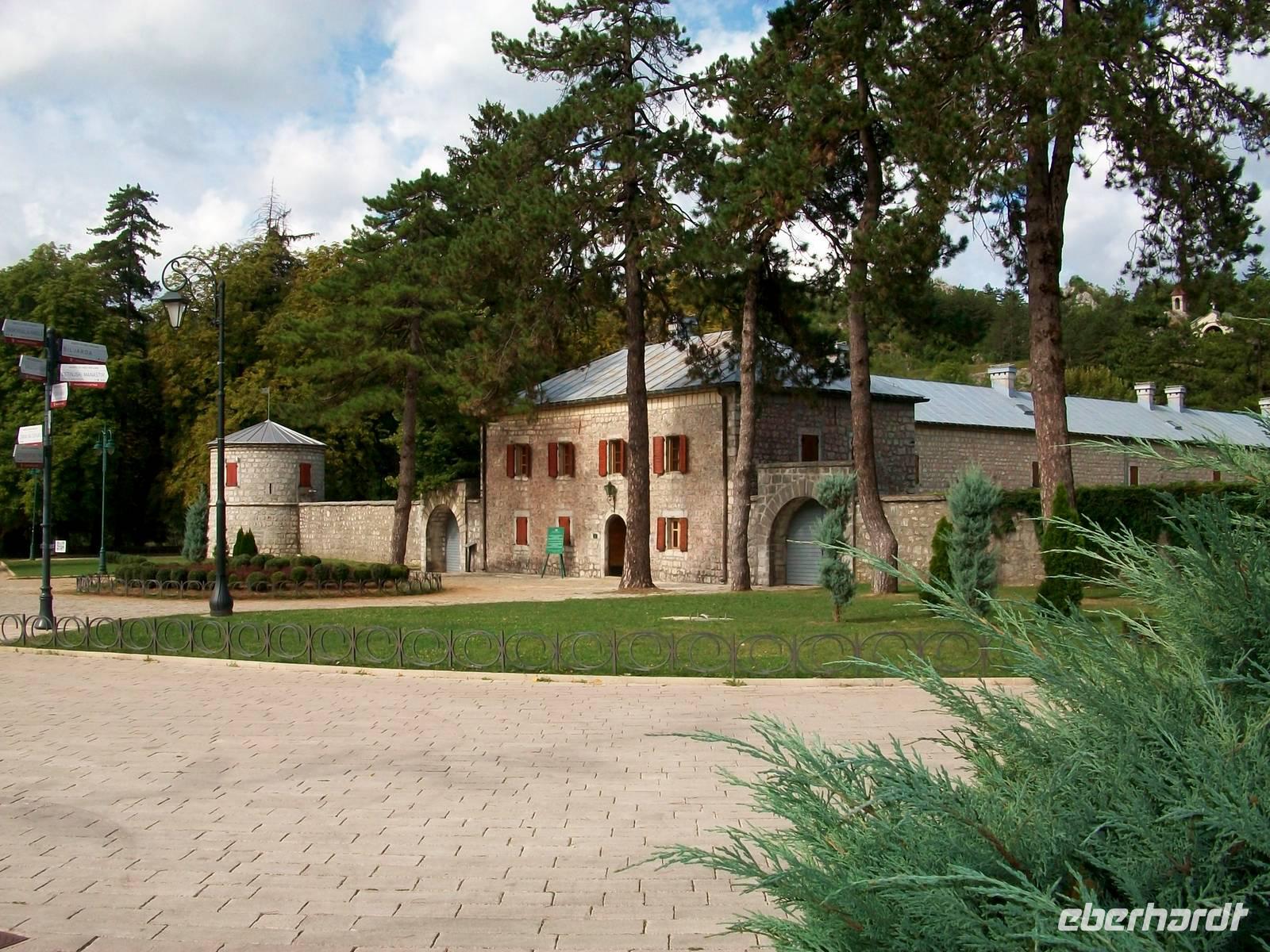 6.9.2015. Heute haben wir nun einen etwas ruhigeren Tag vor uns. Unser Hotel liegt direkt am Meer, und um zum einstigen Machtzentrum von Montenegro zu kommen, müssen wir eine Serpentinenstraße hinauf fahren. Atemberaubend sind die Ausblicke auf die Küste und die Inseln; bald jedoch verschwinden wir zwischen den Bergen und befinden uns hier in einer anderen Welt. Wir sehen die Spitzen des Lovcen, die verkarsteten Bergflanken und erkennen in einem Talkessel die Häuser einer Stadt. Das ist für heute unser Ziel, es ist Cetinje und der Ort diente dem montenegrinischen Königshaus einst als Hauptsitz.