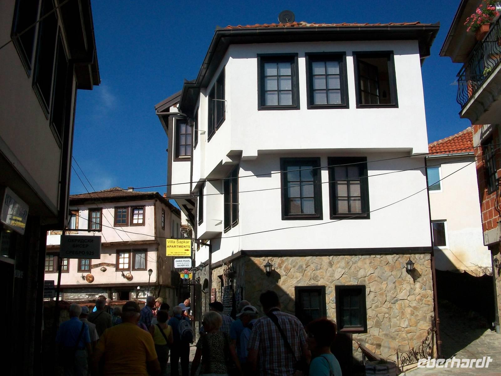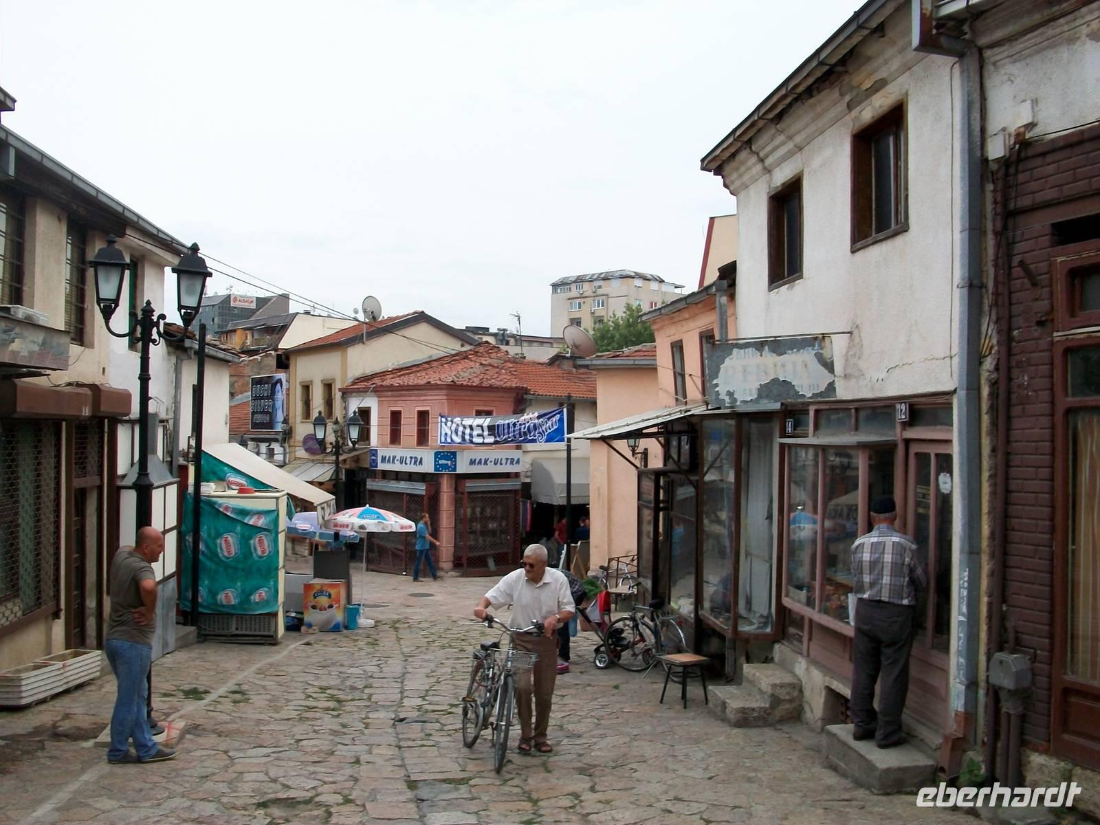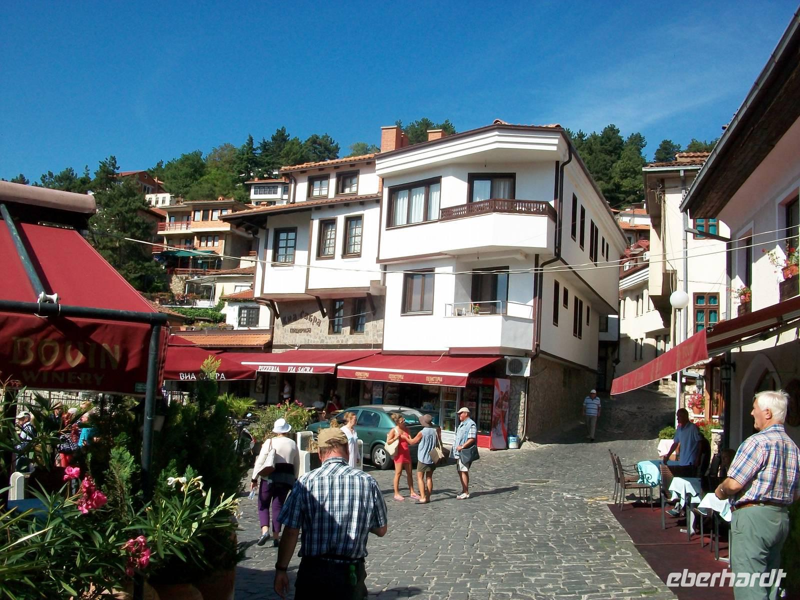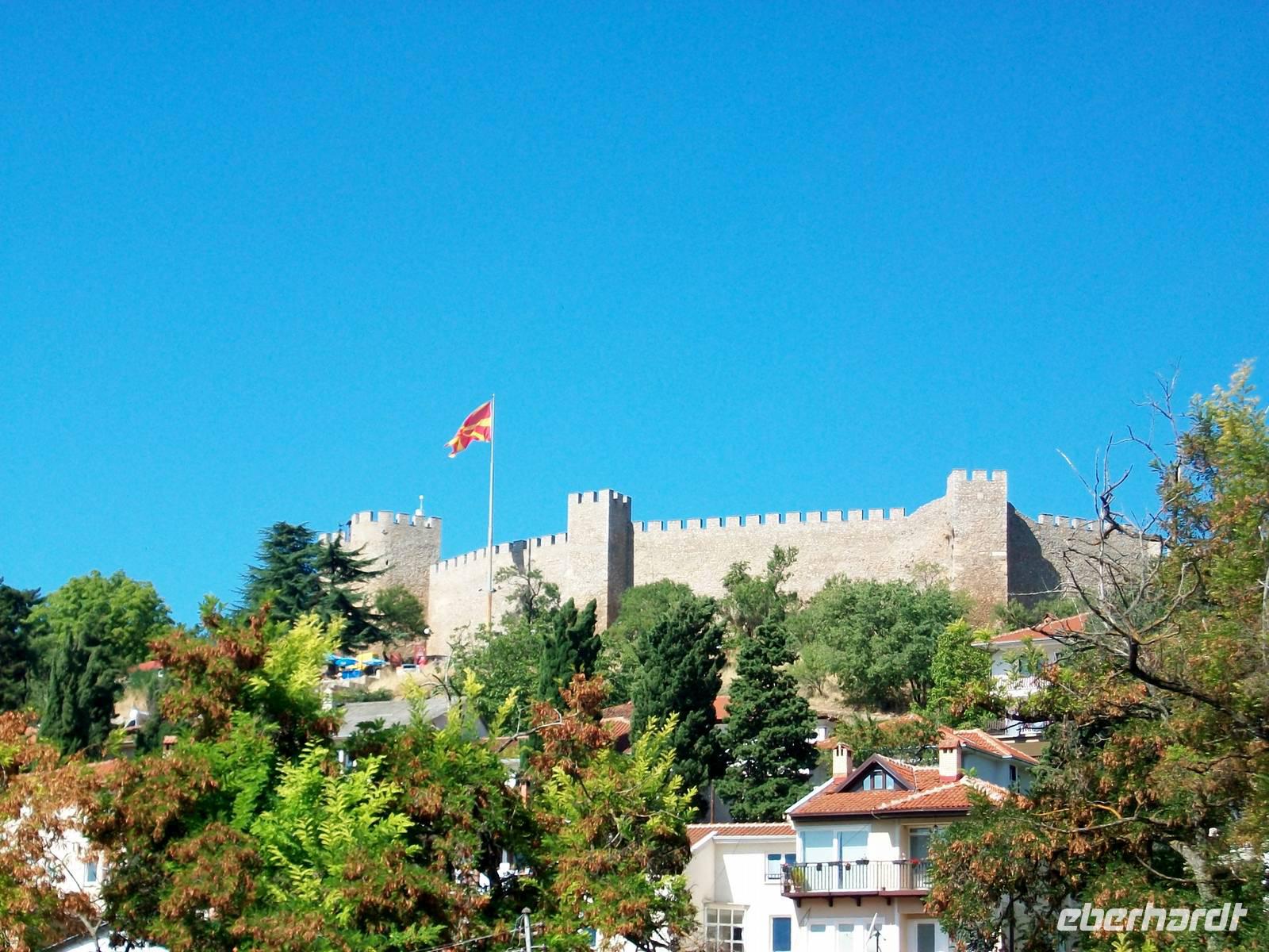 Über die belebte Fußgängerzone gelangen wir bald bergauf in Richtung Festung; oben flattert die mazedonische Fahne im Wind der vom See heraufweht.
