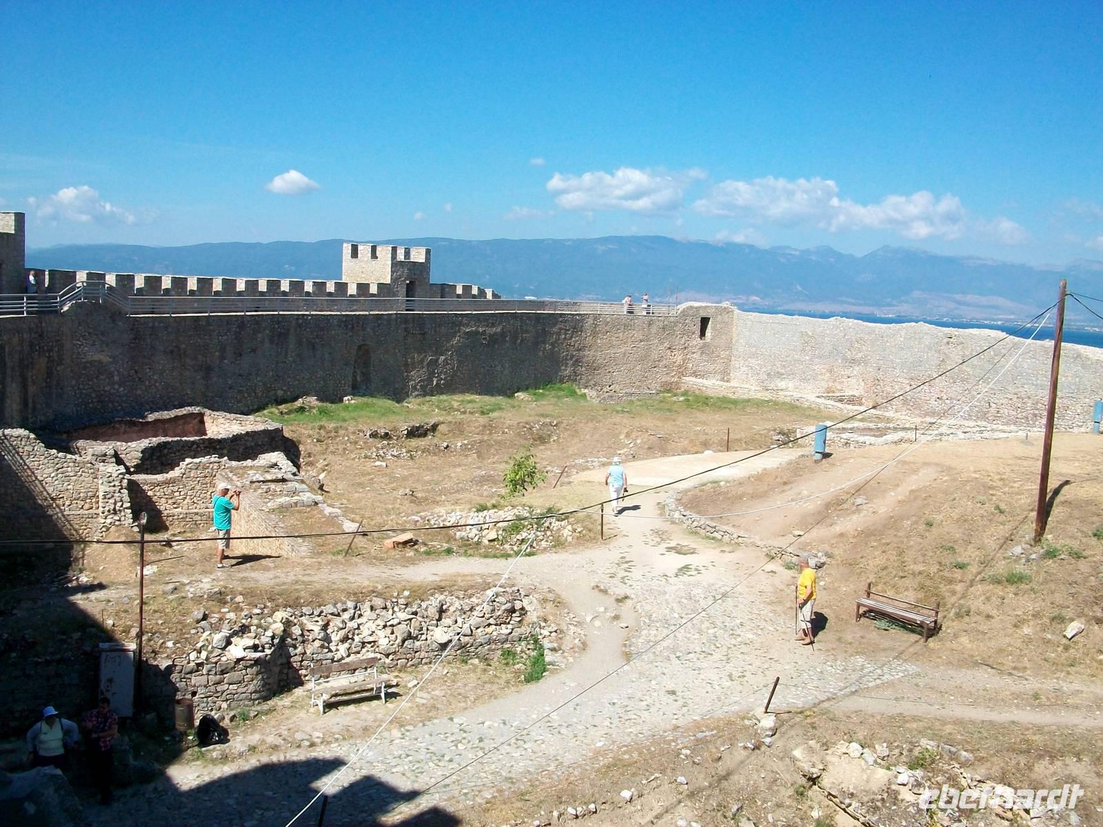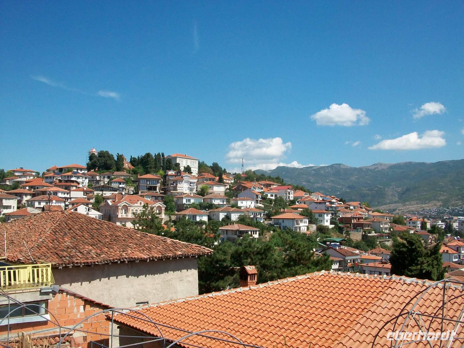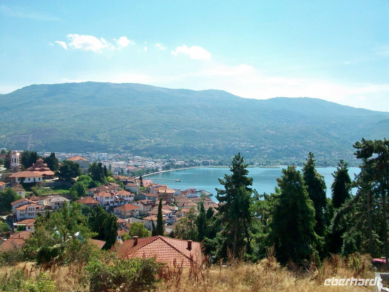 Die Anstrengung wird aber von einem wundervollen Blick belohnt; unter uns die große Wasserfläche des Ohridsees in den vor uns liegenden Hang sind die Häuser schwalbenestergleich hinein gebaut und im Hintergrund steigen die grünen Berge an, das Auge kann sich an diesem Anblick gar nicht satt sehen.