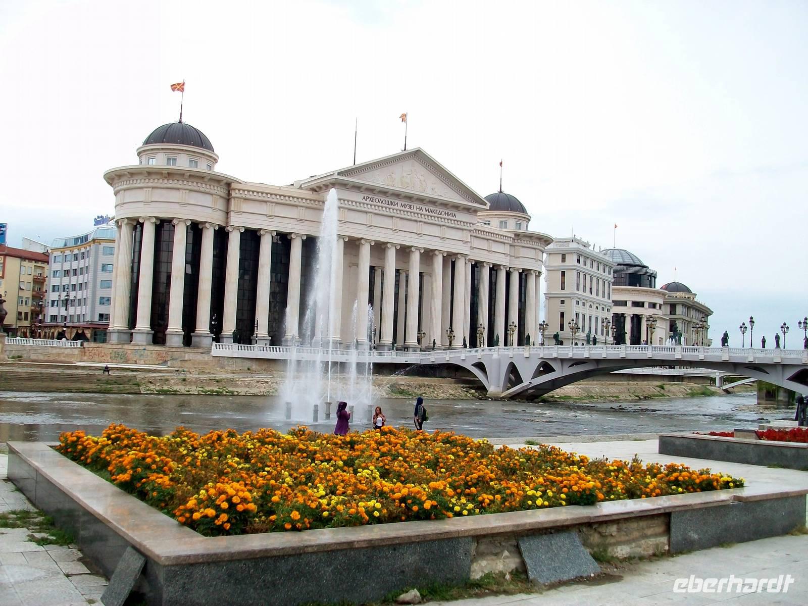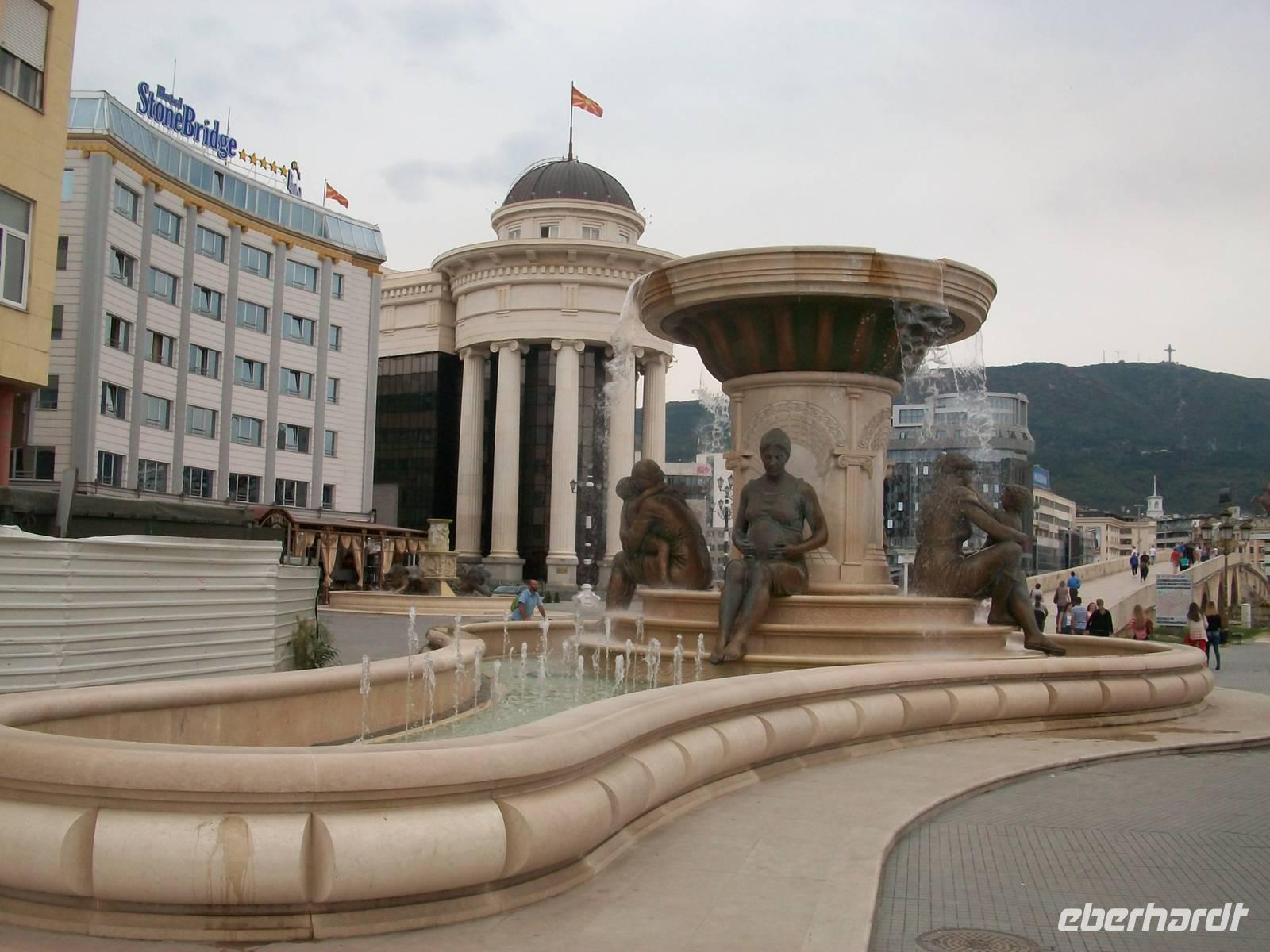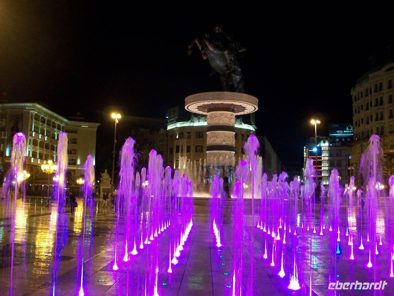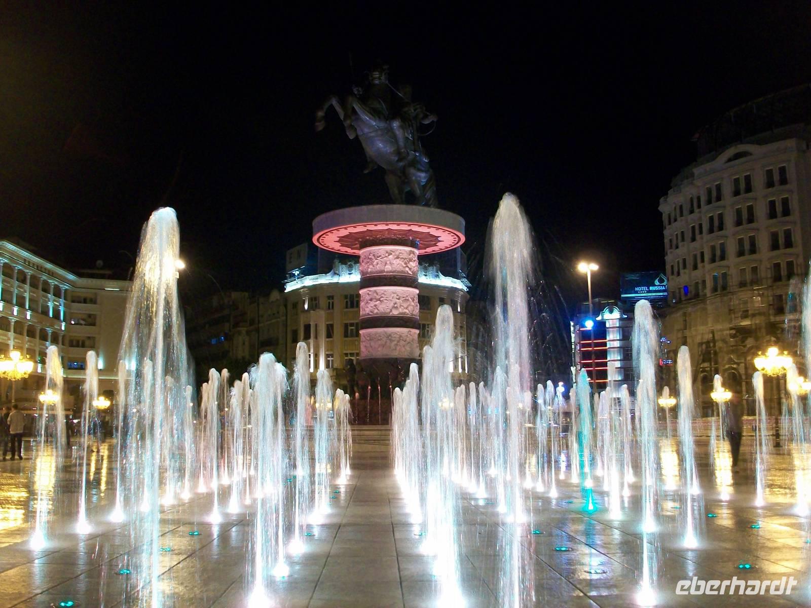 Wir besuchen noch eine ehemalige Karawanserei in der wir das frühere Leben und Treiben erahnen können, gelangen über den Basar um schließlich im modernen Skopje anzukommen. Spätestens hier scheiden sich nun die Geister, denn wir sind umgeben von einer monumentalen Architektur die mit viel Geld und Aufwand erst in den letzten Jahren entstand. Der Grundgedanke ist dabei einen neoantiken Stadtkern zu gestalten; mit den monumentalen Statuen unter anderem von Alexander dem Großen, seinem Vater Phillip und seiner Mutter Olimpia. Diese Denkmäler werden von einem Springbrunnen umgeben und machen auf den Betrachter schon einen etwas kitschigen Eindruck.