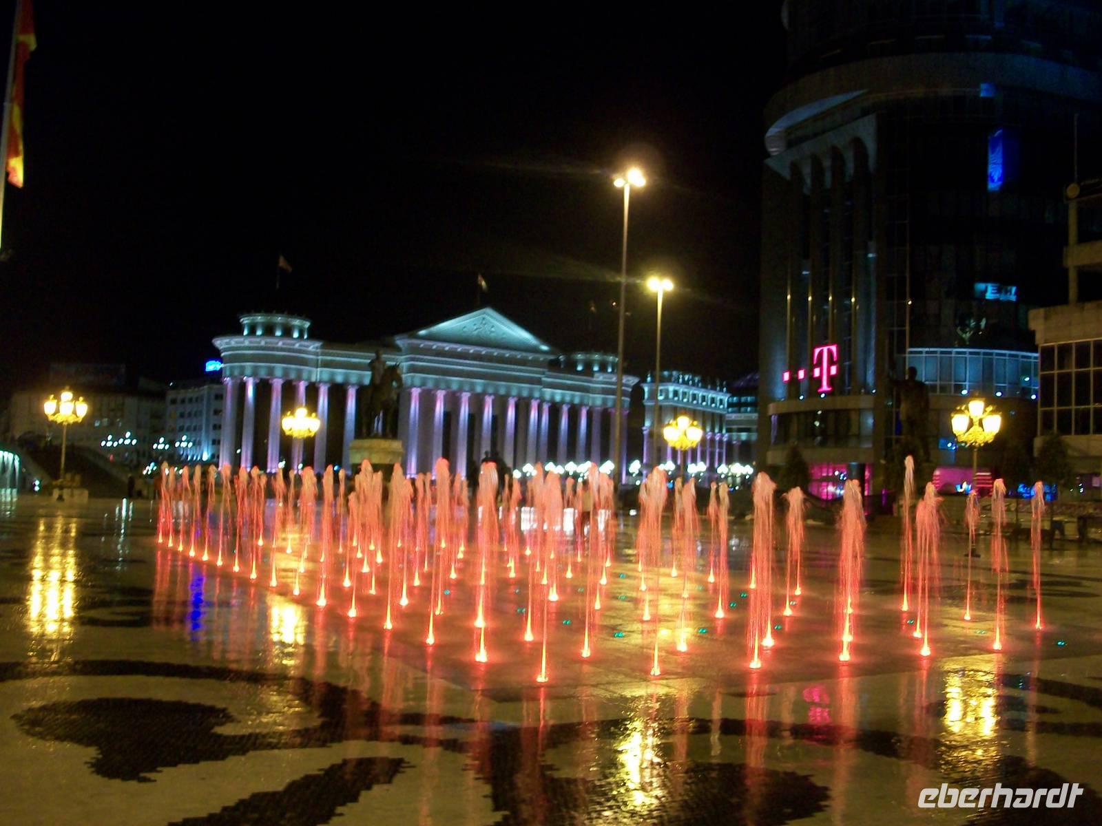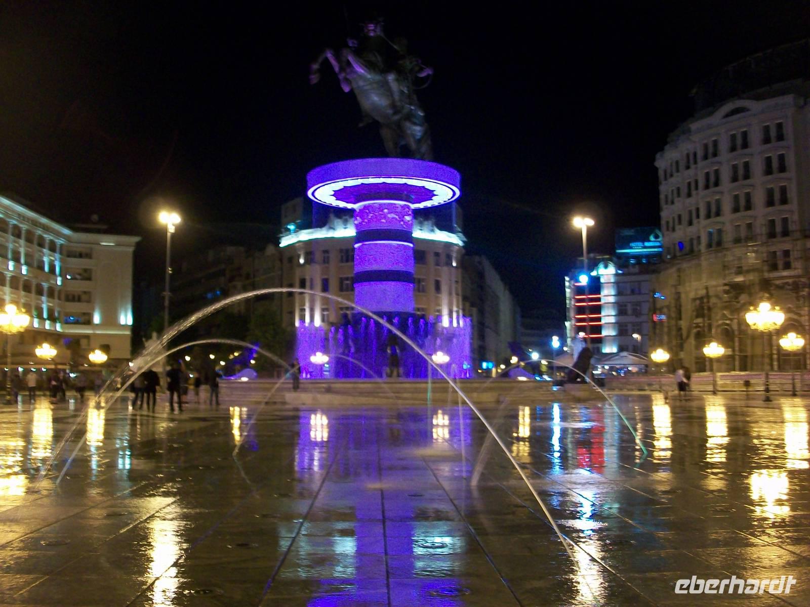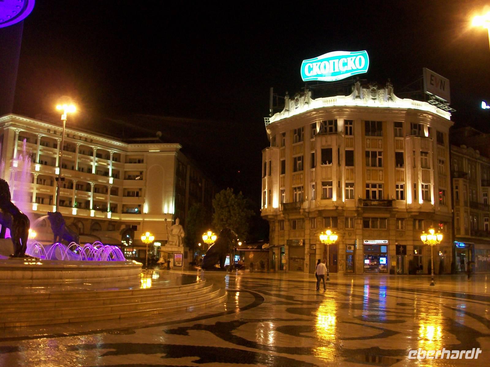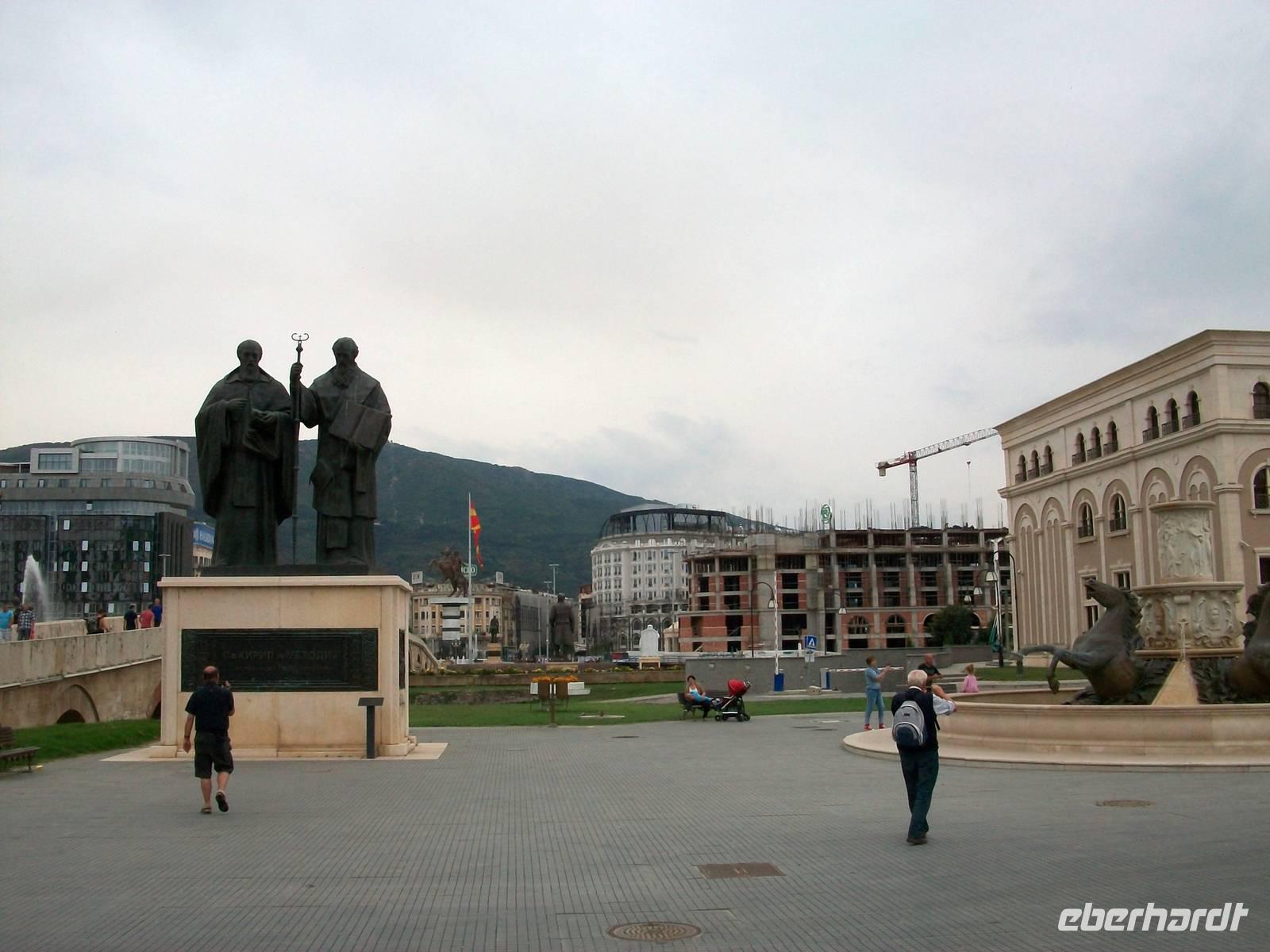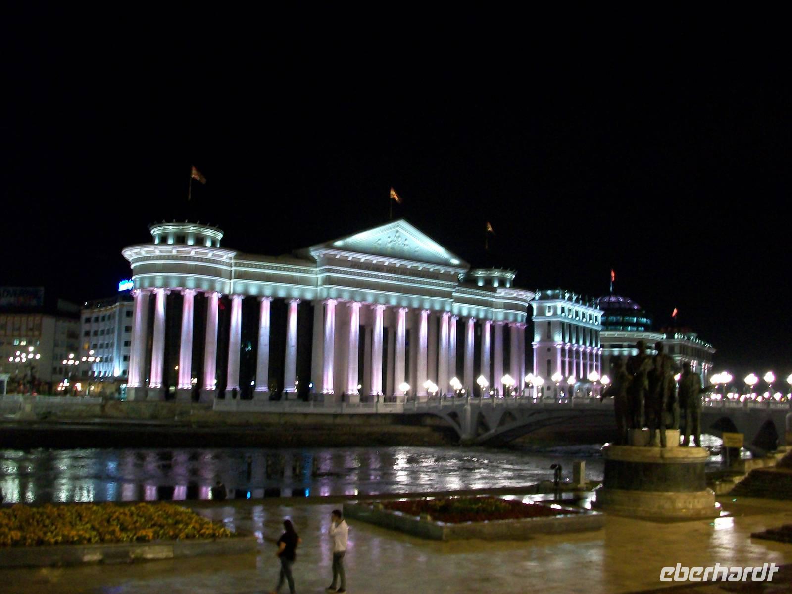 Wir besuchen noch eine ehemalige Karawanserei in der wir das frühere Leben und Treiben erahnen können, gelangen über den Basar um schließlich im modernen Skopje anzukommen. Spätestens hier scheiden sich nun die Geister, denn wir sind umgeben von einer monumentalen Architektur die mit viel Geld und Aufwand erst in den letzten Jahren entstand. Der Grundgedanke ist dabei einen neoantiken Stadtkern zu gestalten; mit den monumentalen Statuen unter anderem von Alexander dem Großen, seinem Vater Phillip und seiner Mutter Olimpia. Diese Denkmäler werden von einem Springbrunnen umgeben und machen auf den Betrachter schon einen etwas kitschigen Eindruck.