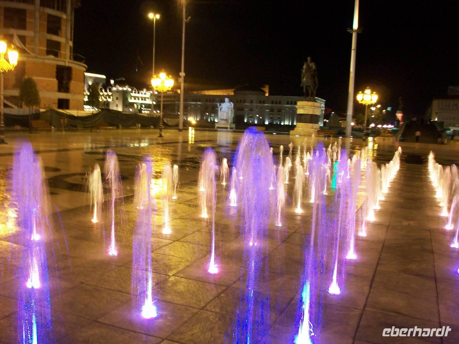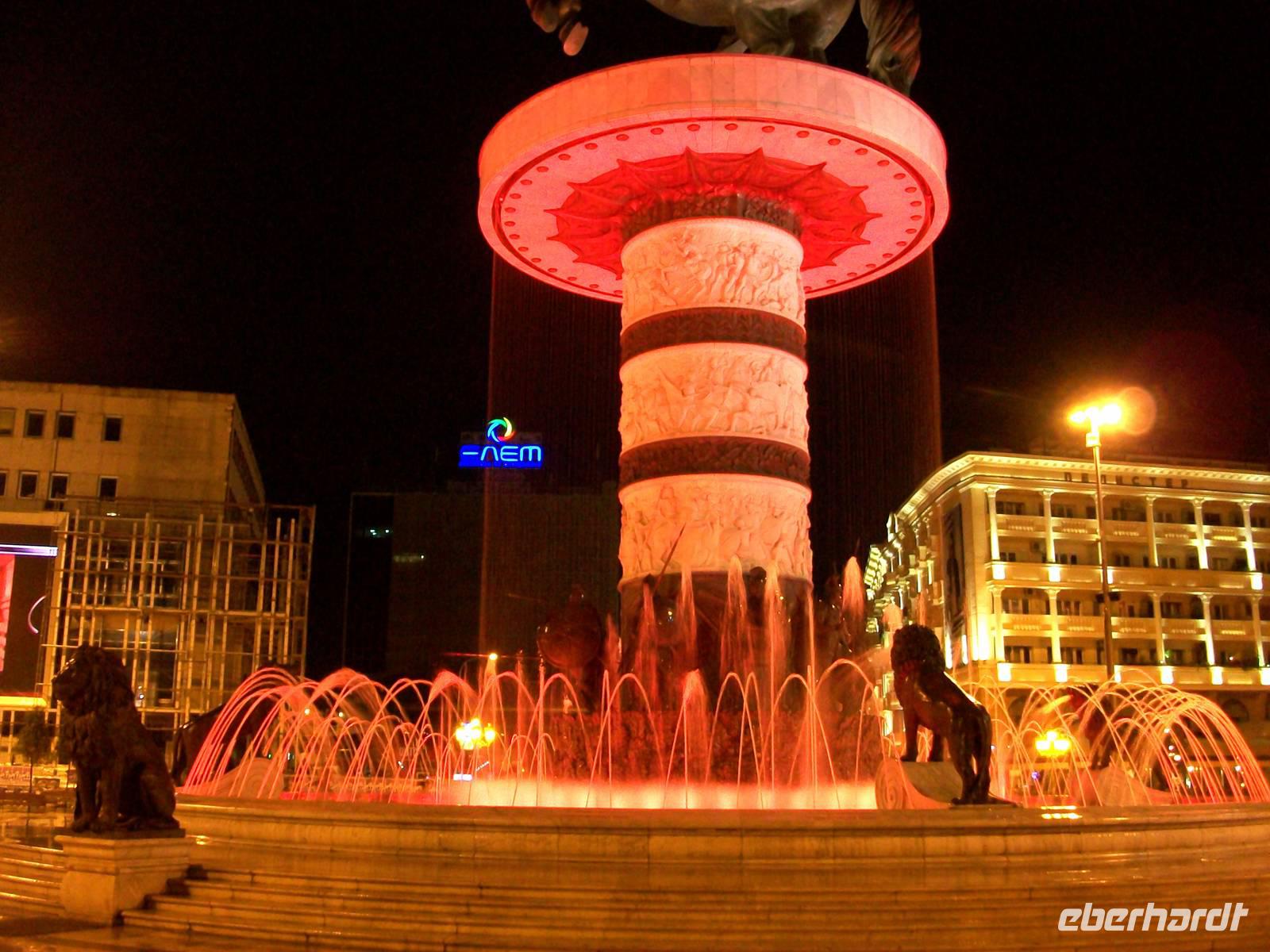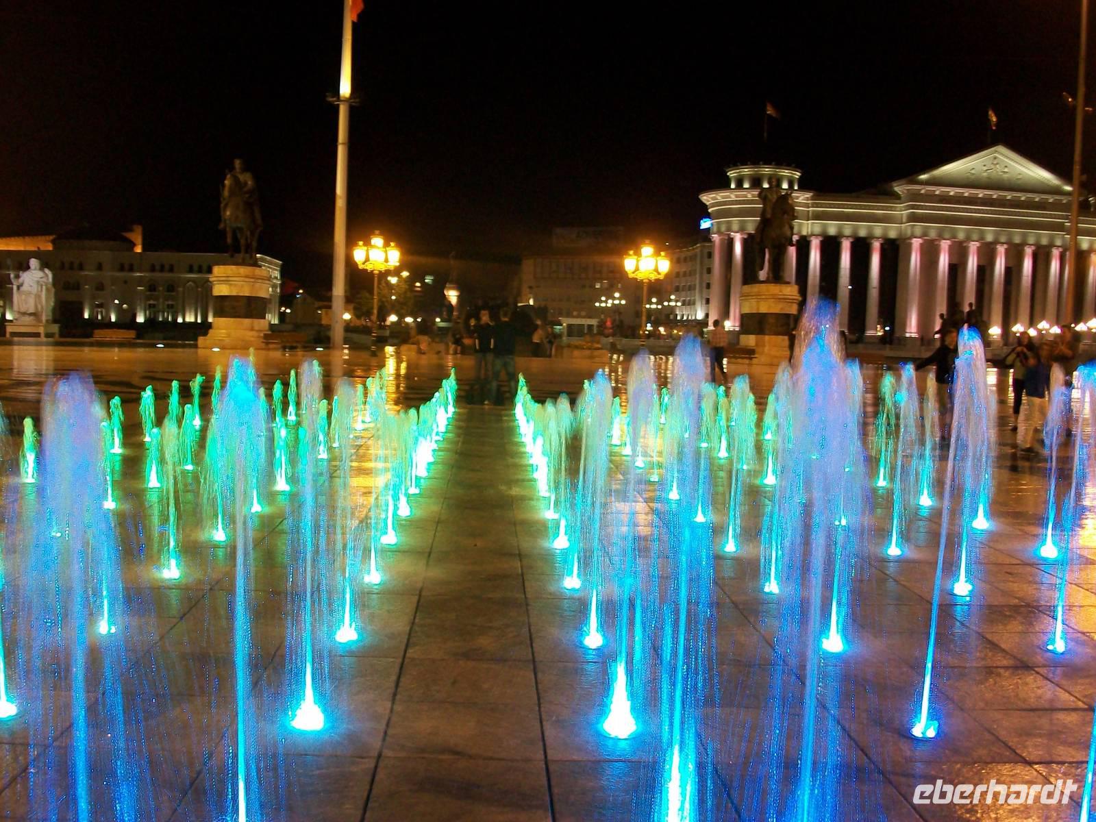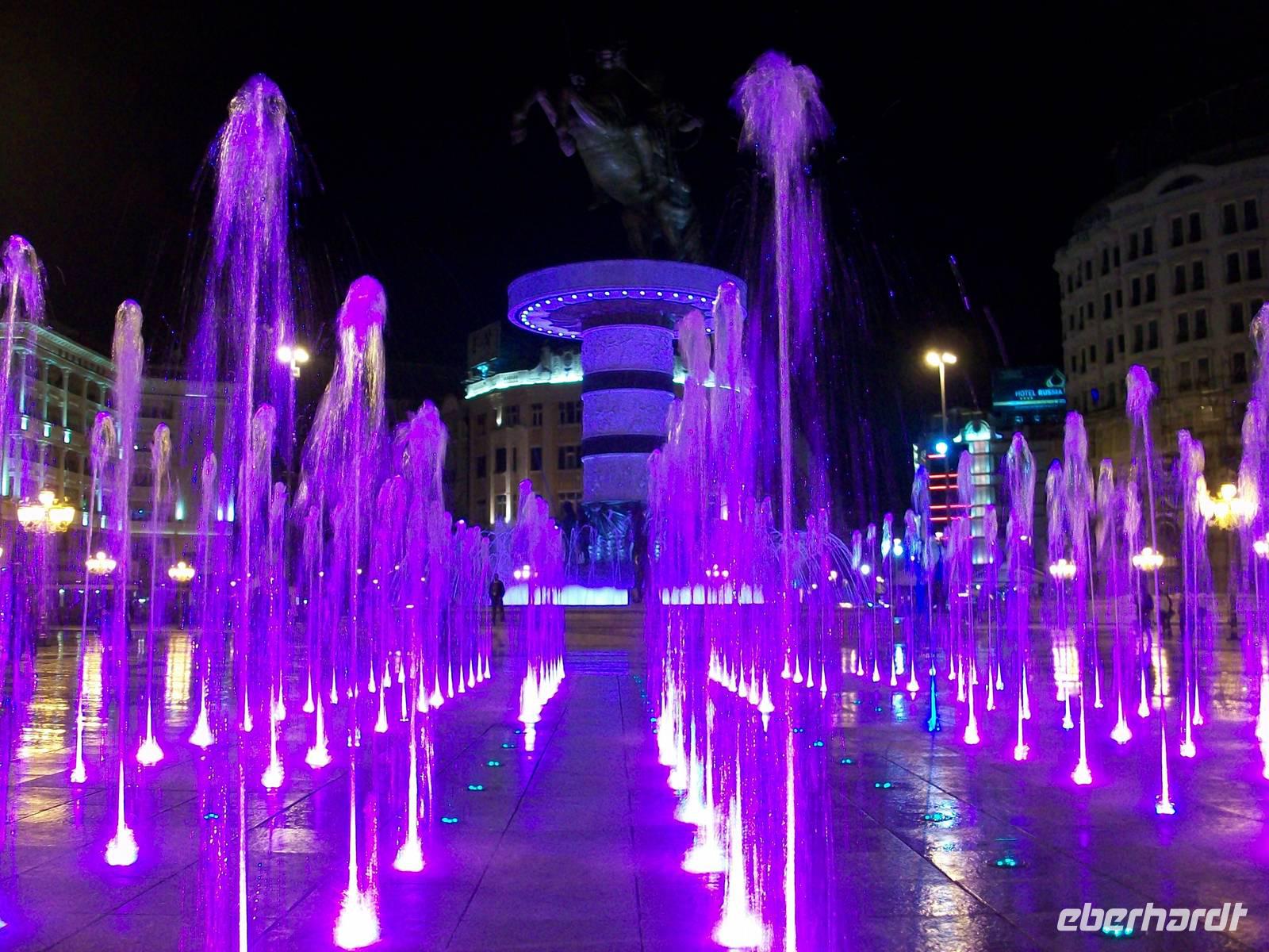 Wir besuchen noch eine ehemalige Karawanserei in der wir das frühere Leben und Treiben erahnen können, gelangen über den Basar um schließlich im modernen Skopje anzukommen. Spätestens hier scheiden sich nun die Geister, denn wir sind umgeben von einer monumentalen Architektur die mit viel Geld und Aufwand erst in den letzten Jahren entstand. Der Grundgedanke ist dabei einen neoantiken Stadtkern zu gestalten; mit den monumentalen Statuen unter anderem von Alexander dem Großen, seinem Vater Phillip und seiner Mutter Olimpia. Diese Denkmäler werden von einem Springbrunnen umgeben und machen auf den Betrachter schon einen etwas kitschigen Eindruck.