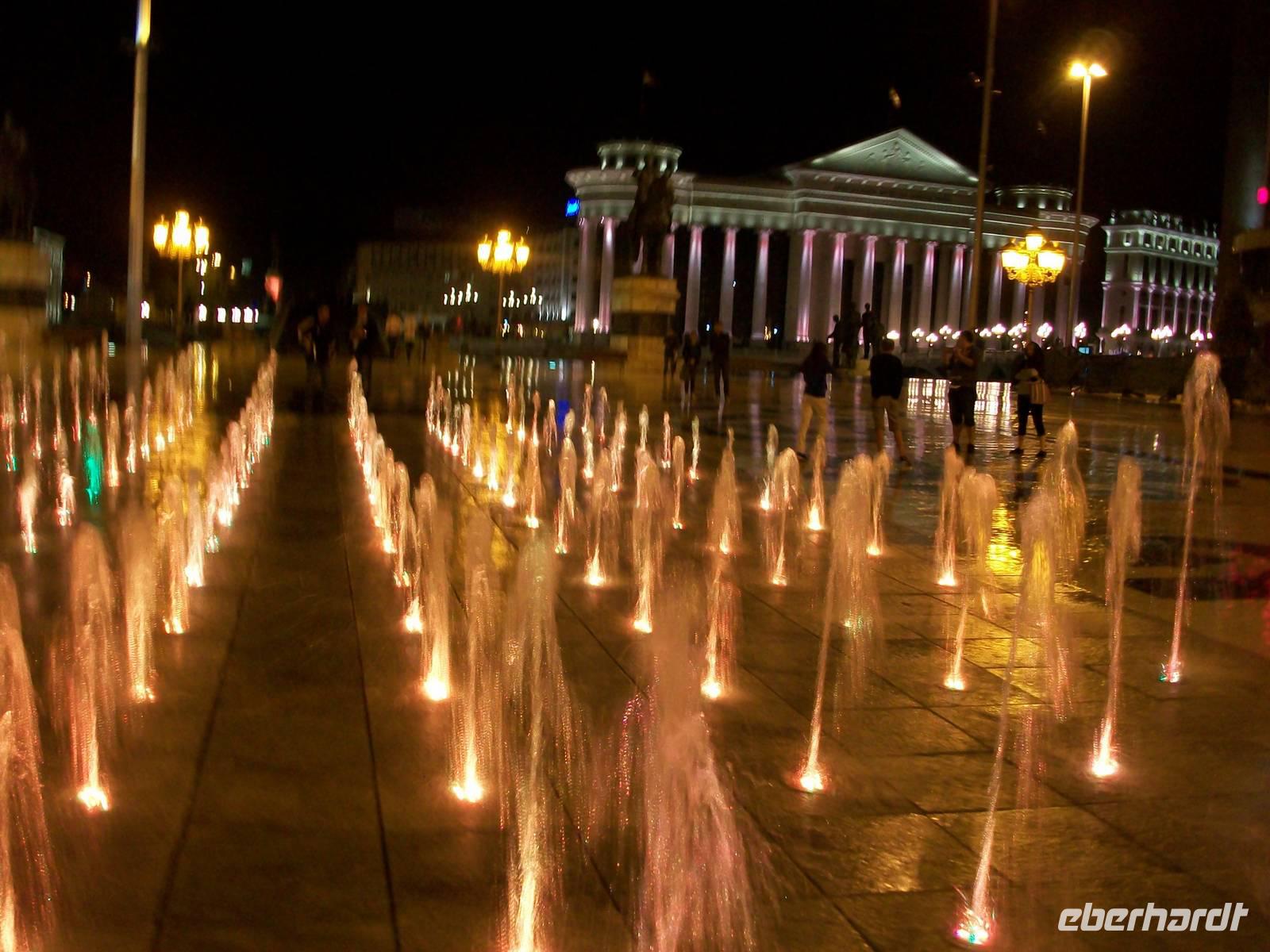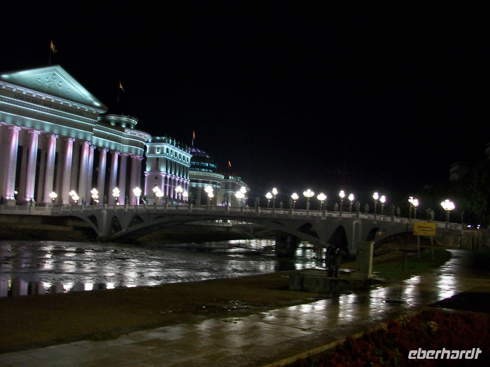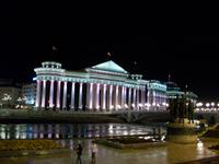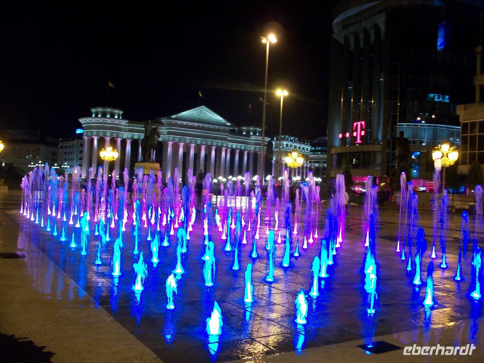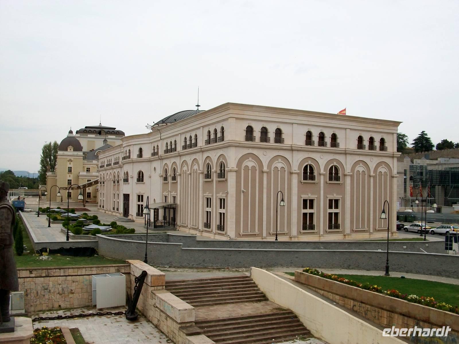 Wir besuchen noch eine ehemalige Karawanserei in der wir das frühere Leben und Treiben erahnen können, gelangen über den Basar um schließlich im modernen Skopje anzukommen. Spätestens hier scheiden sich nun die Geister, denn wir sind umgeben von einer monumentalen Architektur die mit viel Geld und Aufwand erst in den letzten Jahren entstand. Der Grundgedanke ist dabei einen neoantiken Stadtkern zu gestalten; mit den monumentalen Statuen unter anderem von Alexander dem Großen, seinem Vater Phillip und seiner Mutter Olimpia. Diese Denkmäler werden von einem Springbrunnen umgeben und machen auf den Betrachter schon einen etwas kitschigen Eindruck.