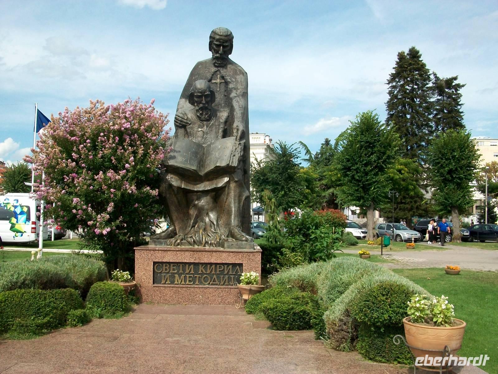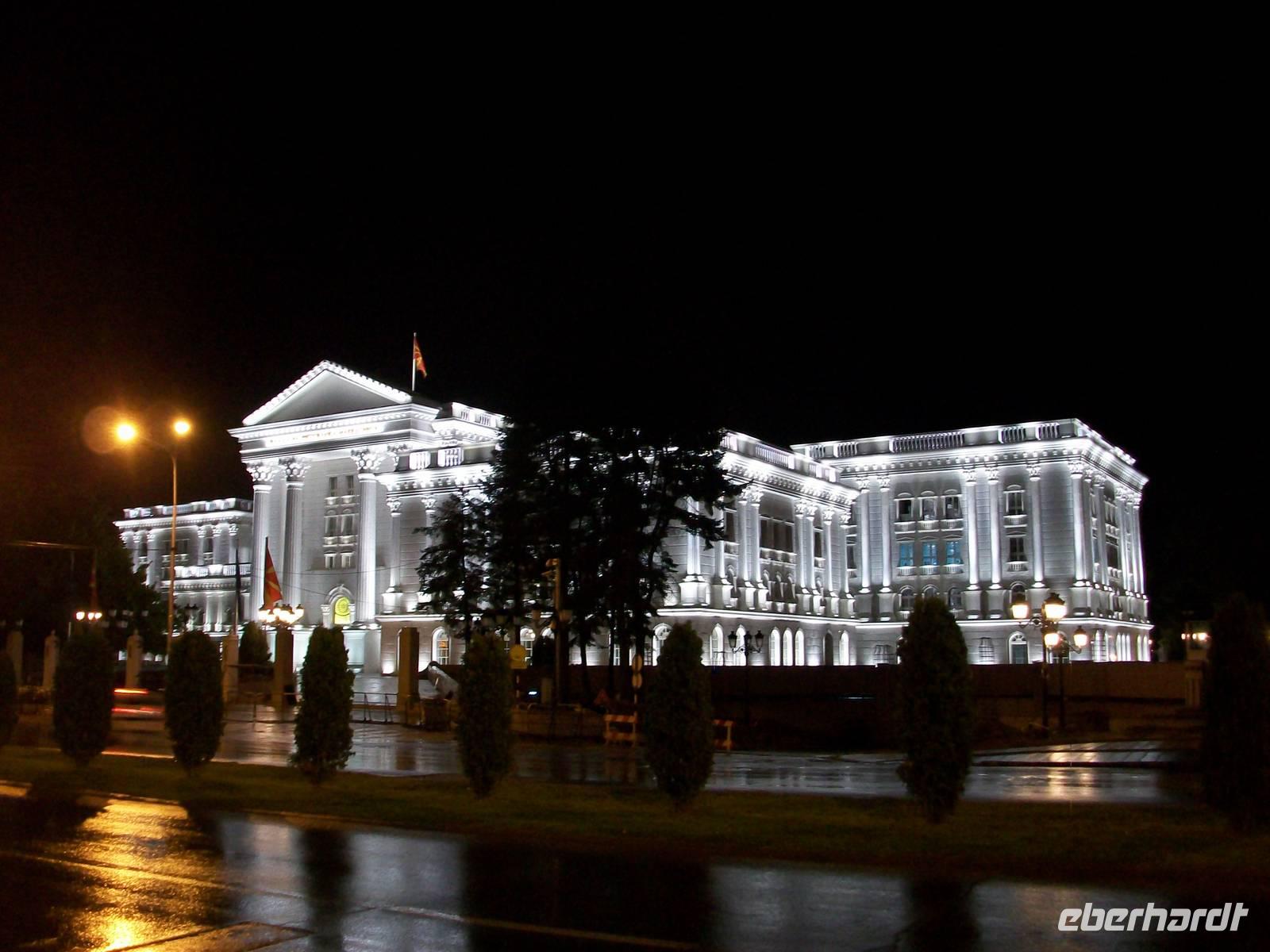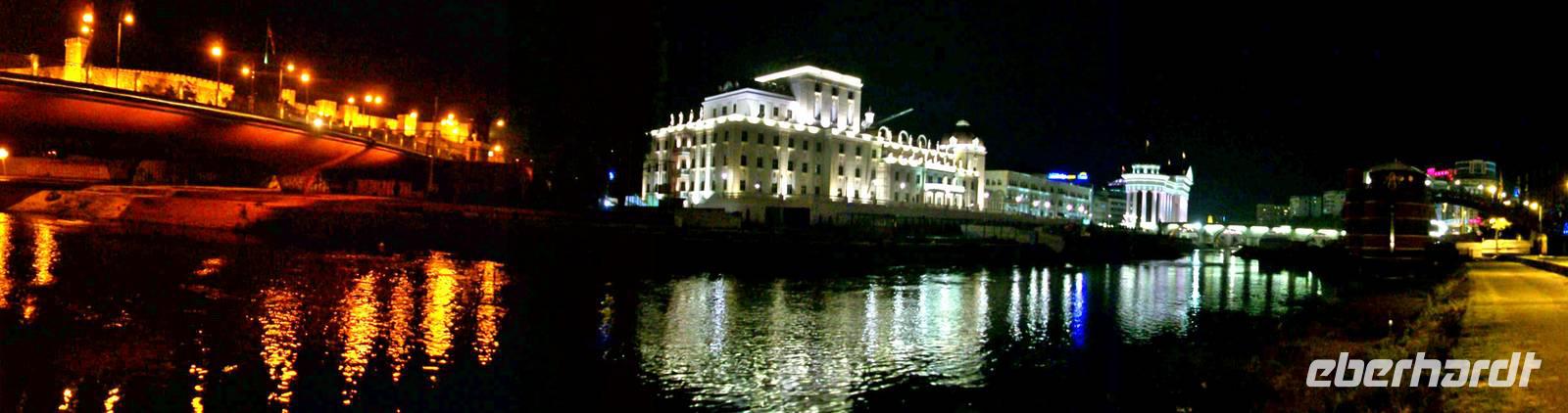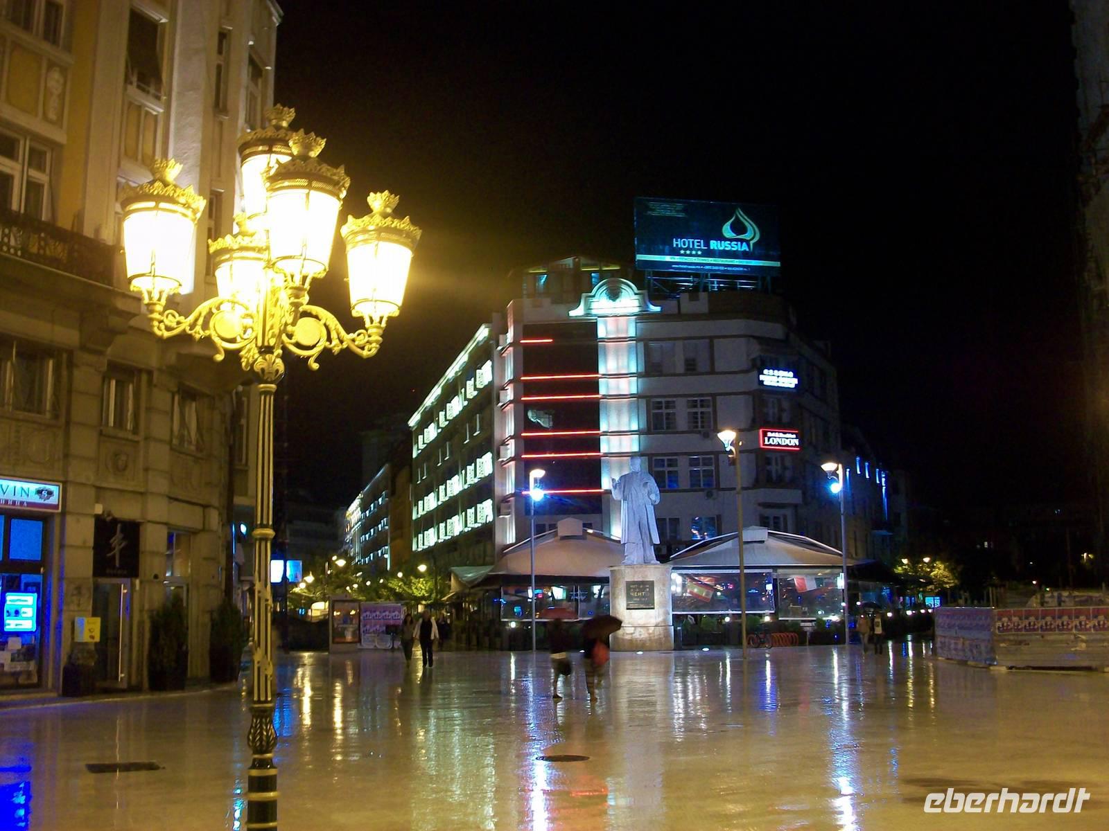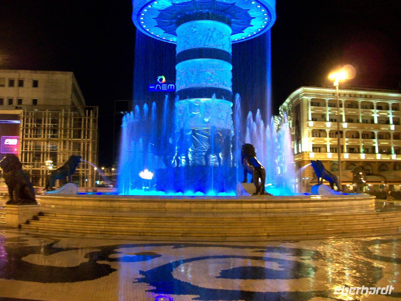 Wir besuchen noch eine ehemalige Karawanserei in der wir das frühere Leben und Treiben erahnen können, gelangen über den Basar um schließlich im modernen Skopje anzukommen. Spätestens hier scheiden sich nun die Geister, denn wir sind umgeben von einer monumentalen Architektur die mit viel Geld und Aufwand erst in den letzten Jahren entstand. Der Grundgedanke ist dabei einen neoantiken Stadtkern zu gestalten; mit den monumentalen Statuen unter anderem von Alexander dem Großen, seinem Vater Phillip und seiner Mutter Olimpia. Diese Denkmäler werden von einem Springbrunnen umgeben und machen auf den Betrachter schon einen etwas kitschigen Eindruck.