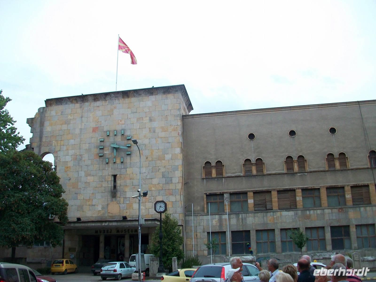 Über die alte Steinbrücke gelangen wir auf das andere Vardar- Ufer und sind bald zwischen den Plattenbauten unterwegs die erst nach dem großen Erdbeben in den 1960er Jahren entstanden. Die Führung endet an den Überresten des Alten Bahnhofs; er beherbergt heute ein Museum und die Uhr zeigt immer noch die Zeit der Katastrophe an, sie blieb zu diesem Zeitpunkt für alle Zeiten wie eingefroren stehen.