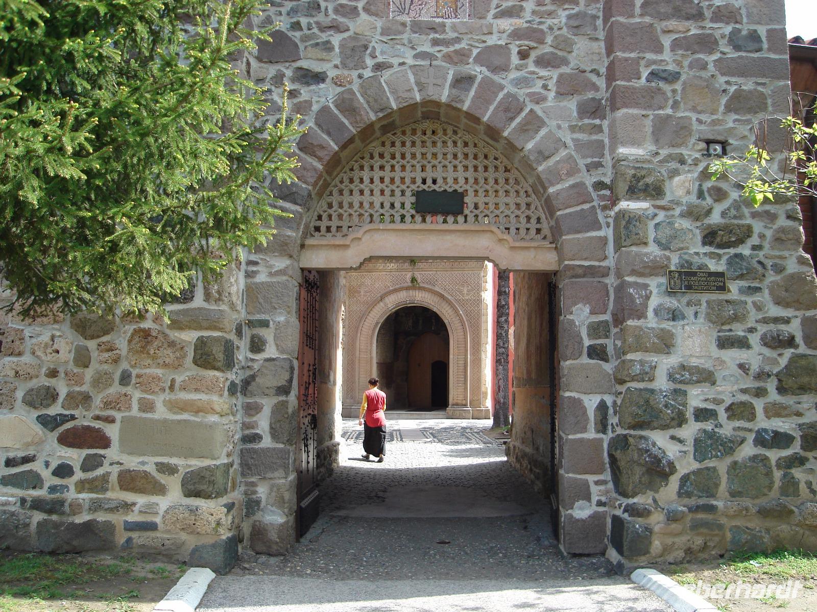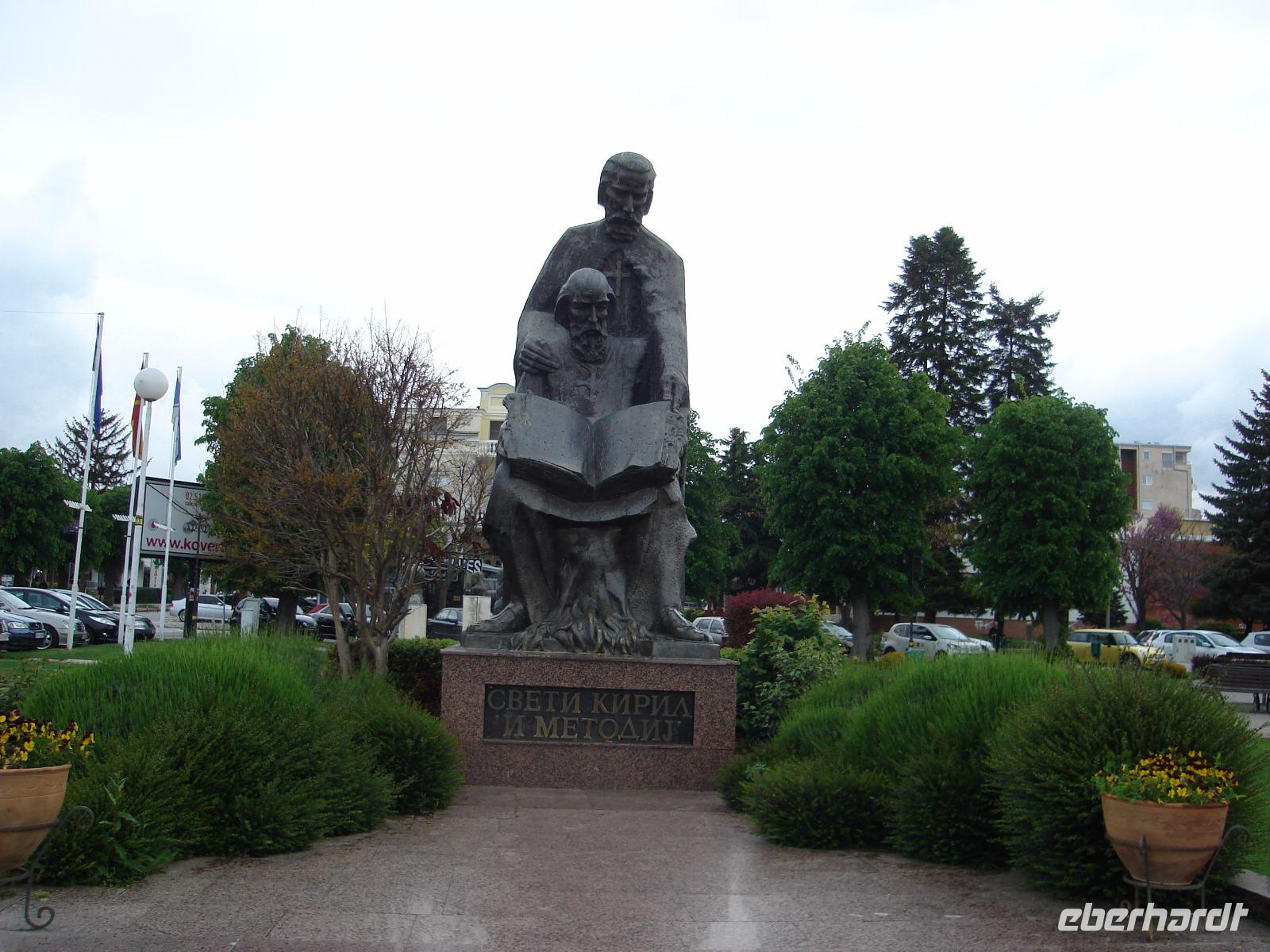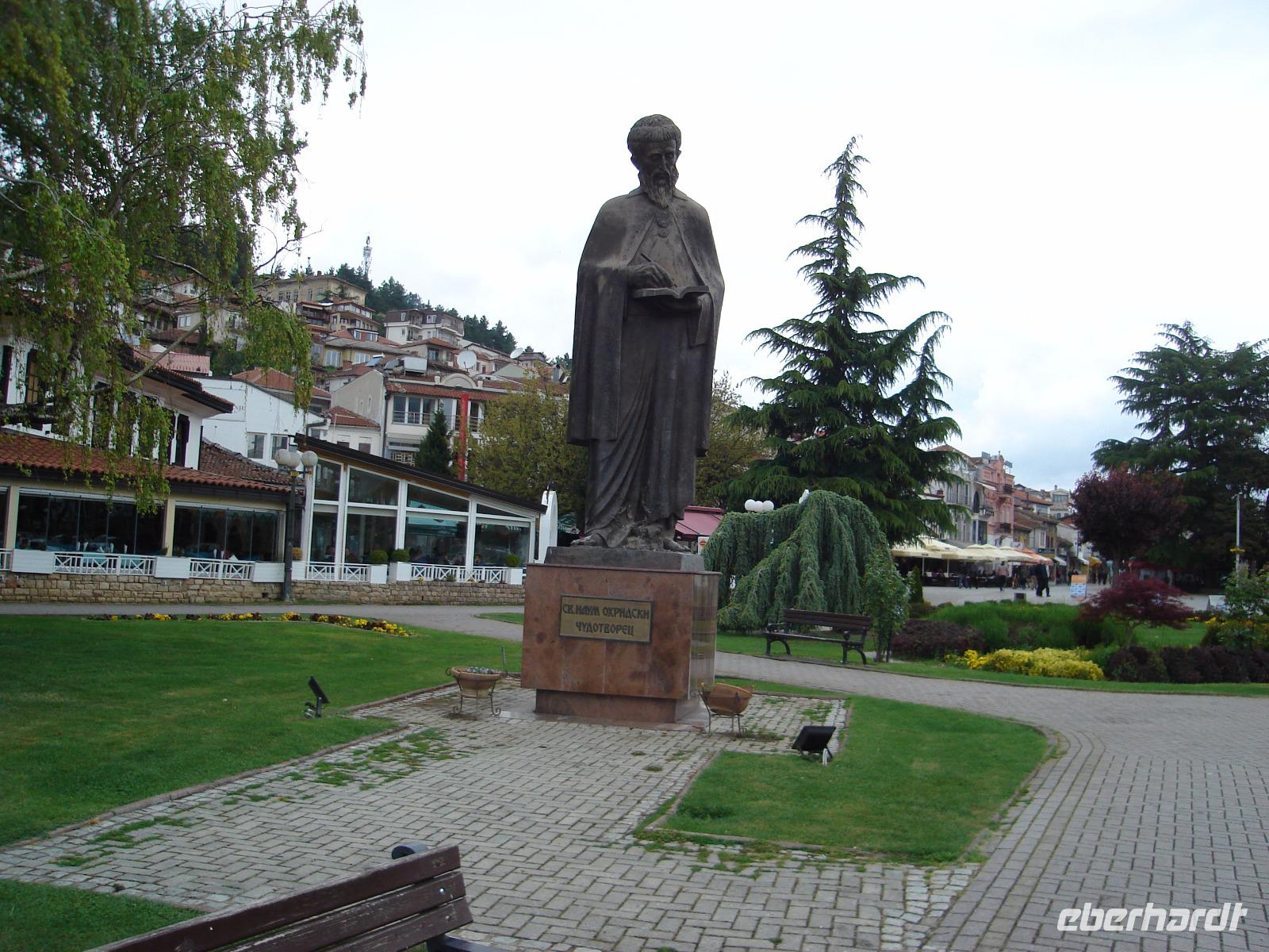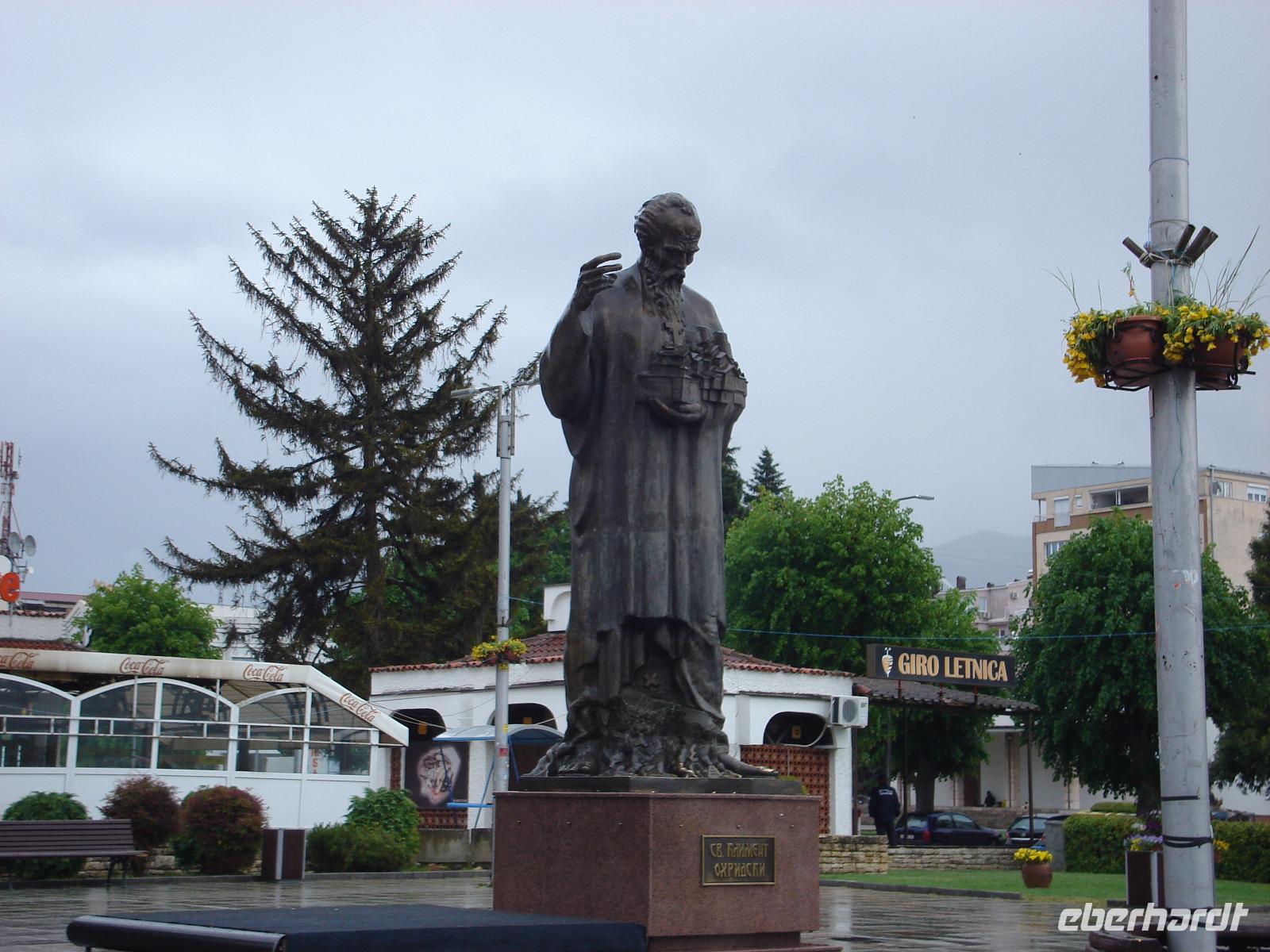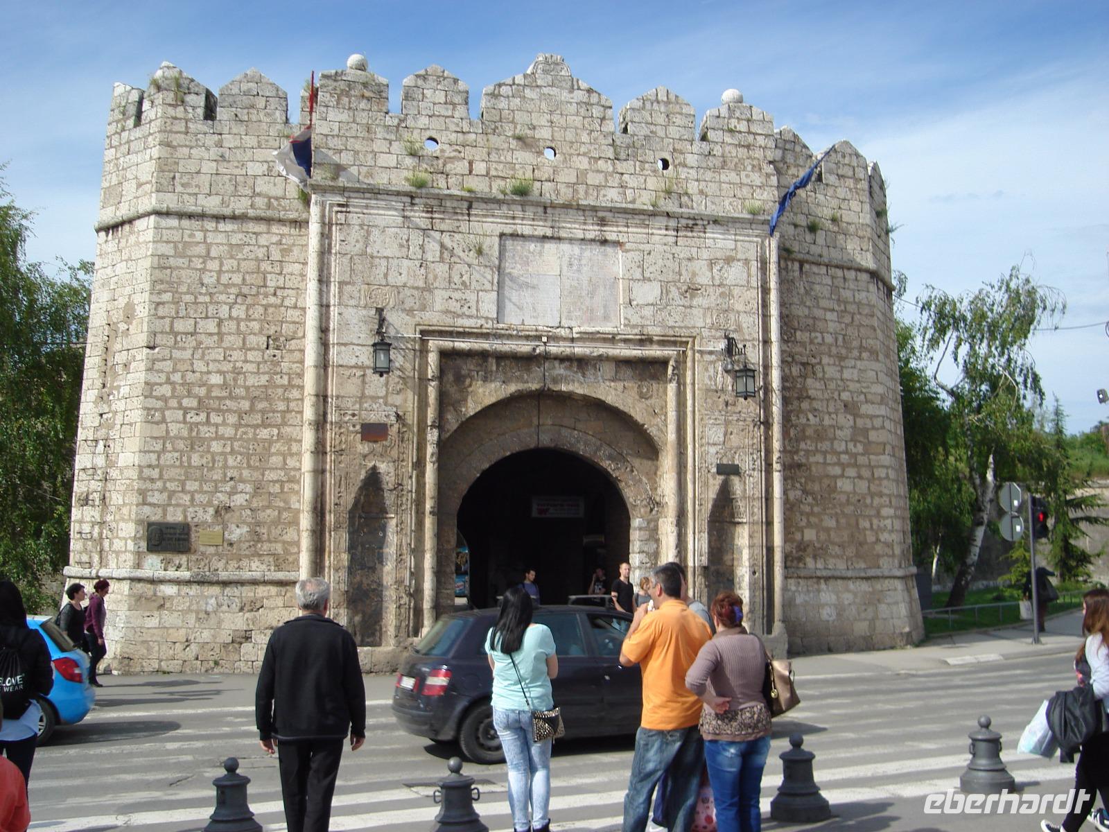 Zunächst führt uns Michael durch die Altstadt, zeigt Kirchen und Moscheen, so die Aldža-Moschee, auch eine ehemalige Karawansarei. Wir sehen die Festung Kale, wandern hinunter durch die Gassen der Altstadt, über orientalische Basare. Unten, im neuen Teil der Stadt, erwartet uns ein völlig anderes Bild: monumentale Denkmäler und Springbrunnen, auch riesige Brücken dominieren das Stadtbild: Alexander der Große, Philipp II., auch Kaiser Justinian, der bei uns besonders durch seine Gesetze große Bekanntheit erlangt hat, sind hier überlebensgroß zu sehen. Wir besuchen das Museum für Mutter Teresa, sehen das wiedererbaute Theater und den Triumpfbogen „Porta Makedonija", der an die Unabhängigkeit des Landes erinnern soll. In der Ferne erkennen wir den Uhrturm des alten Bahnhofs. Die Uhr zeigt noch immer die Zeit des großen Erdbebens am 26. Juli 1963 um 5.17 Uhr.