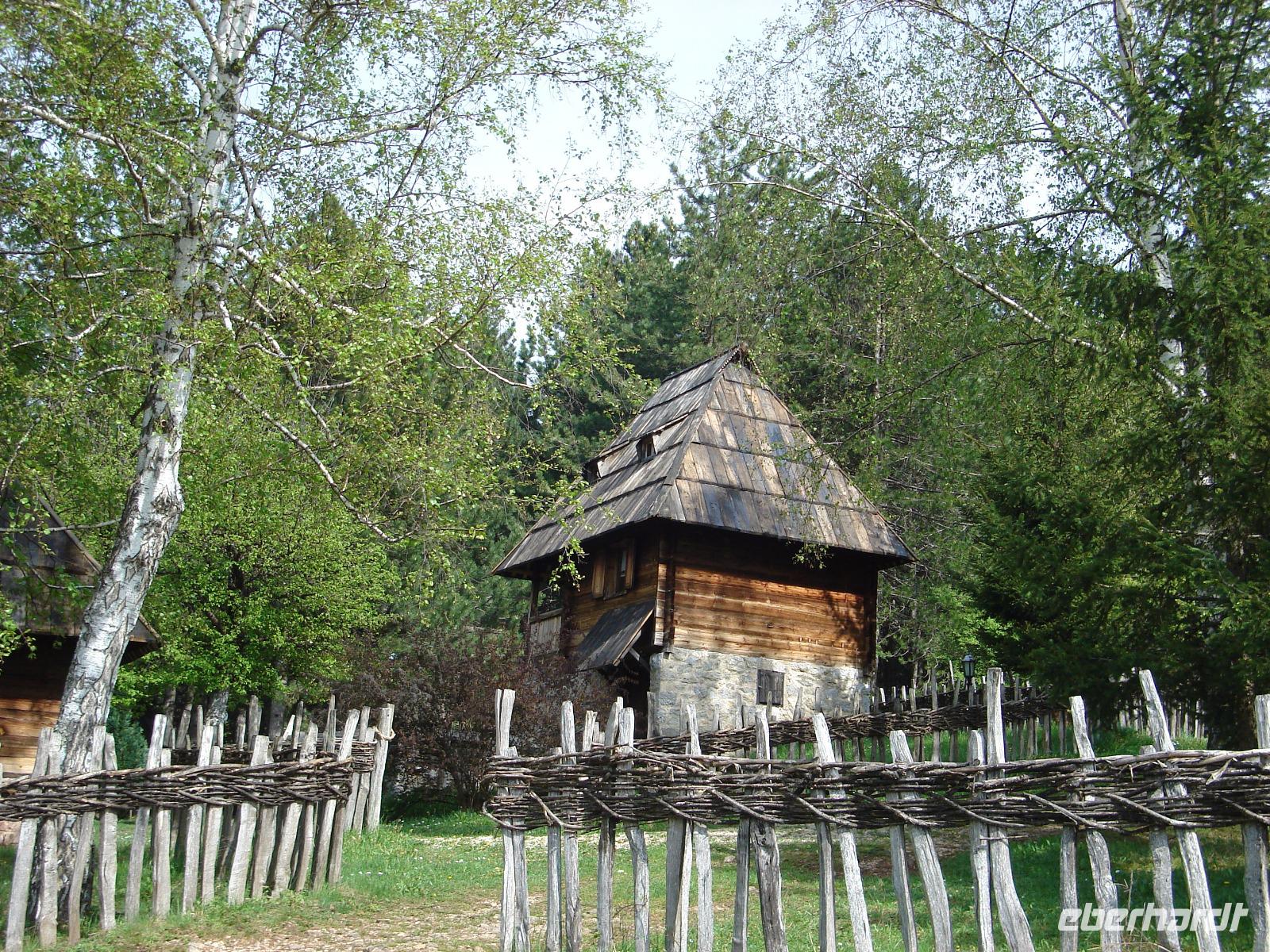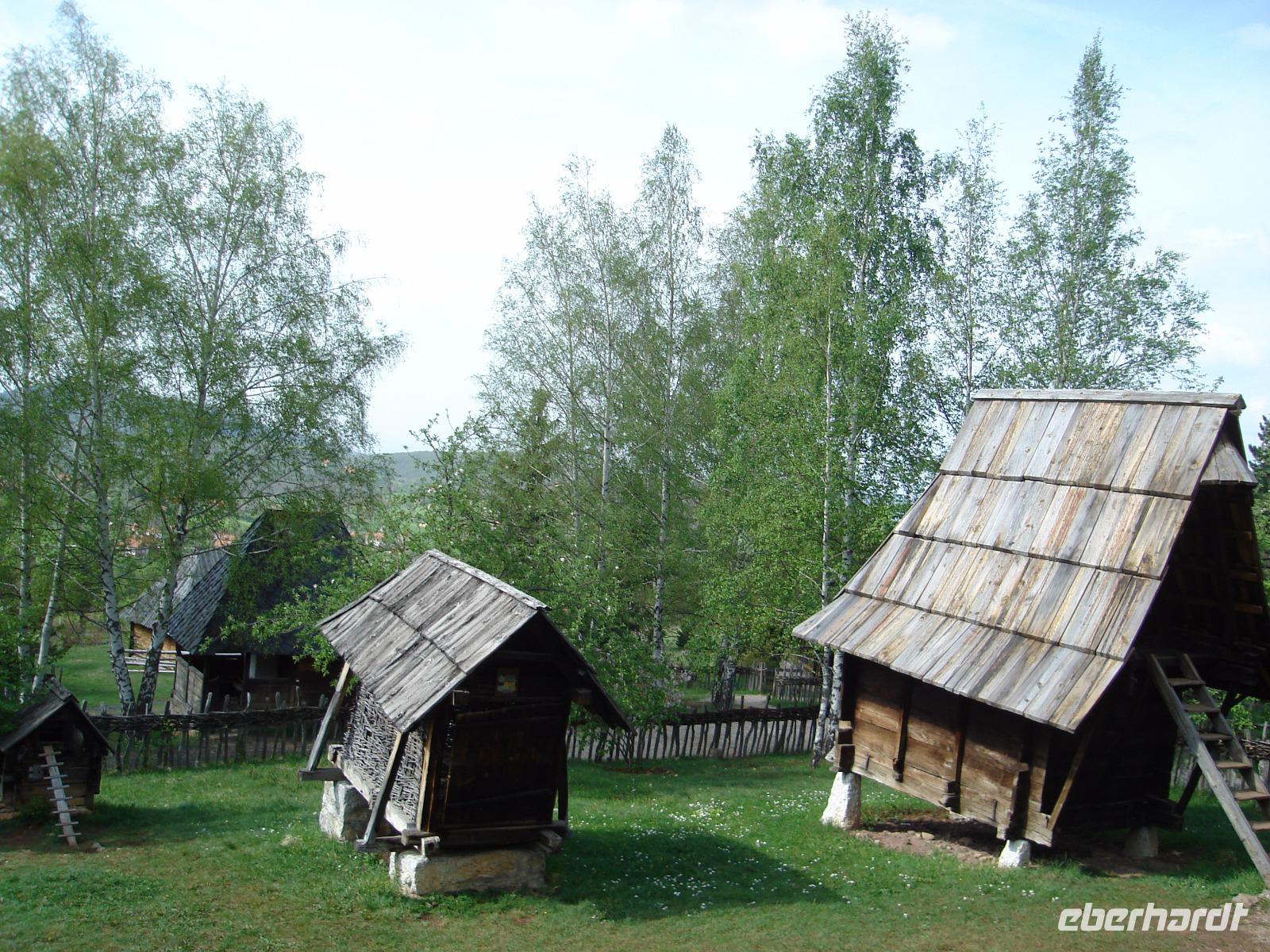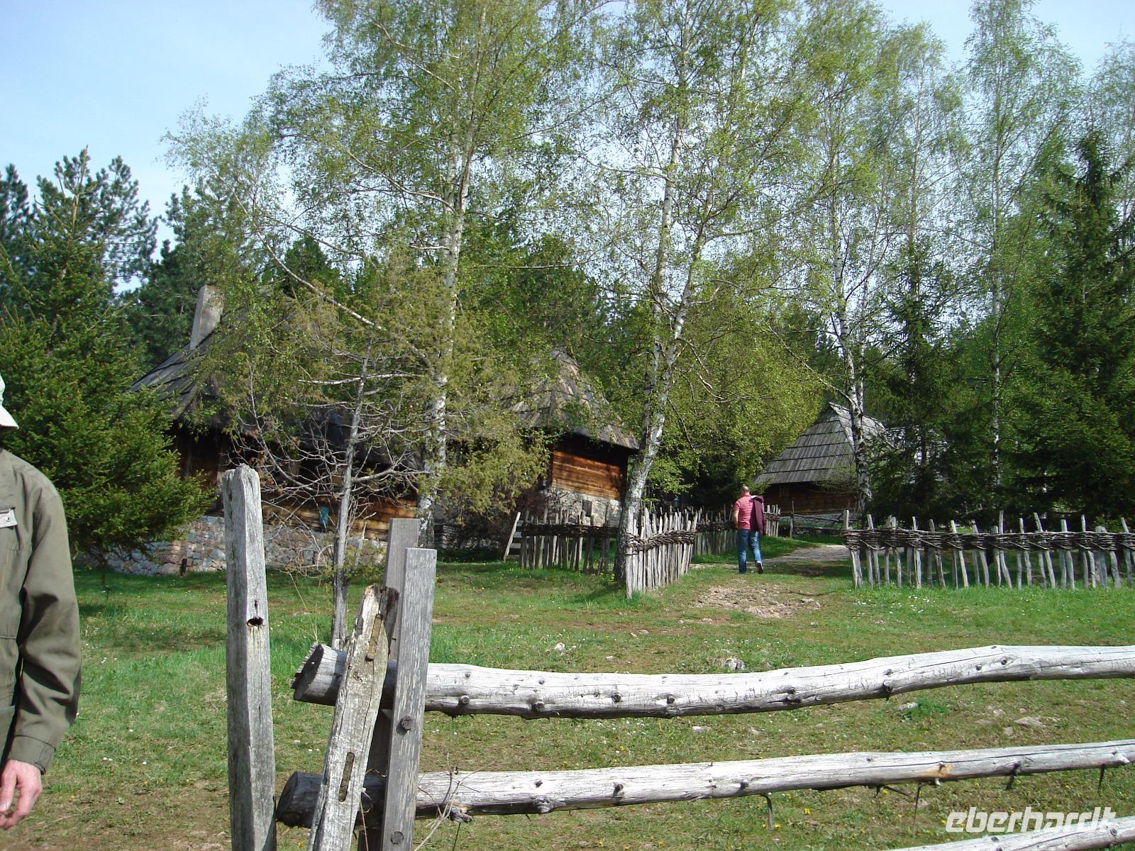 Nächster Programmpunkt ist das Museumsdorf Sirogojno im Zlatiborgebirge. Hier sind die wichtigsten Gebäude einer früheren bäuerlichen Siedlung aufgestellt: Wohnhäuser, ein Backofen, eine Schmiede, Ställe und mehr. Und hier haben wir heute in entsprechender Kulisse unser Mittagessen mit typisch serbischen Spezialitäten.