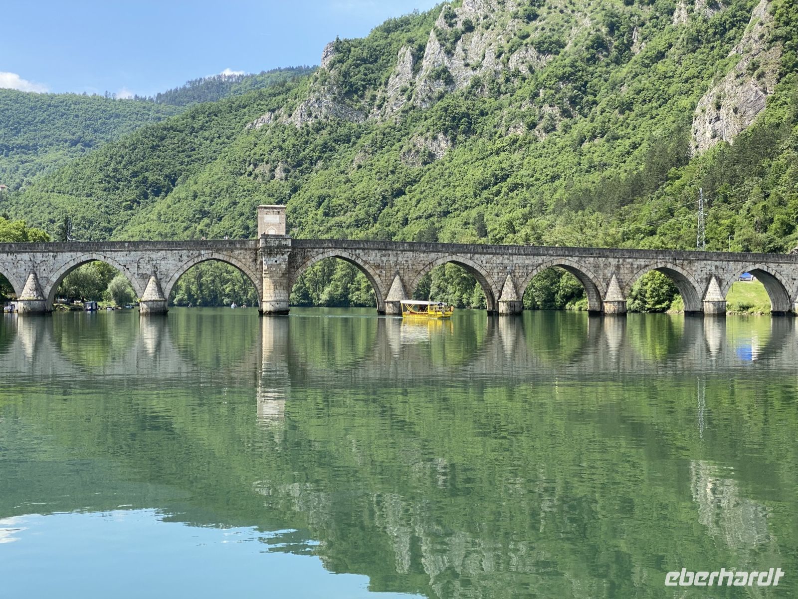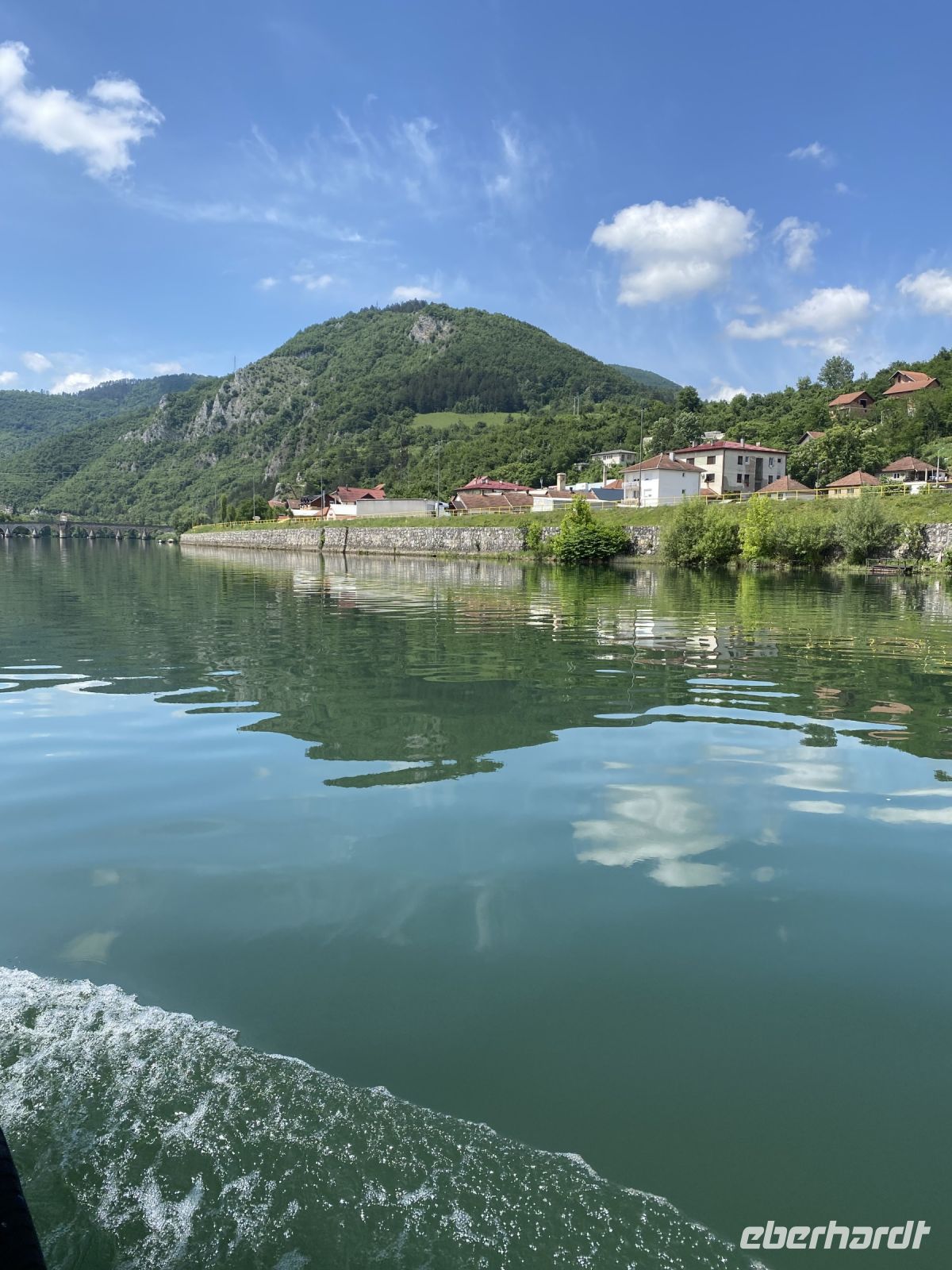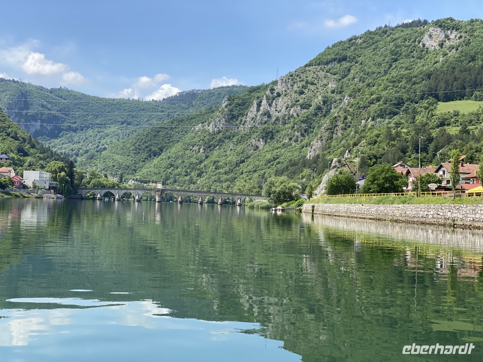 Durch eine Wald- und Karstlandschaft führt uns der Weg nach Visegrad. Die Grenze zwischen Serbien und Bosnien-Herzegowina überwinden wir schnell und sind 11:00 Uhr in der Stadt. Die Stadt liegt in der Republika Srpska und so können wir weiterhin auch mit serbischen Dinars bezahlen. Wir schauen uns die berühmte Bücke über den Fluss Drina an und erinnern uns dabei an den Roman von Ivo Andric "Die Brücke über die Drina" .Danach besteigen wir ein Boot und vertrauen uns für eine Stunde dem Fluss an, bekommen etwas zu Essen und zu Trinken. Nach ca. 1 Stunde verlassen wir den Fluss und bummeln ein wenig durch die kleine Stadt, trinken einen Kaffee oder essen ein leckeres Eis.