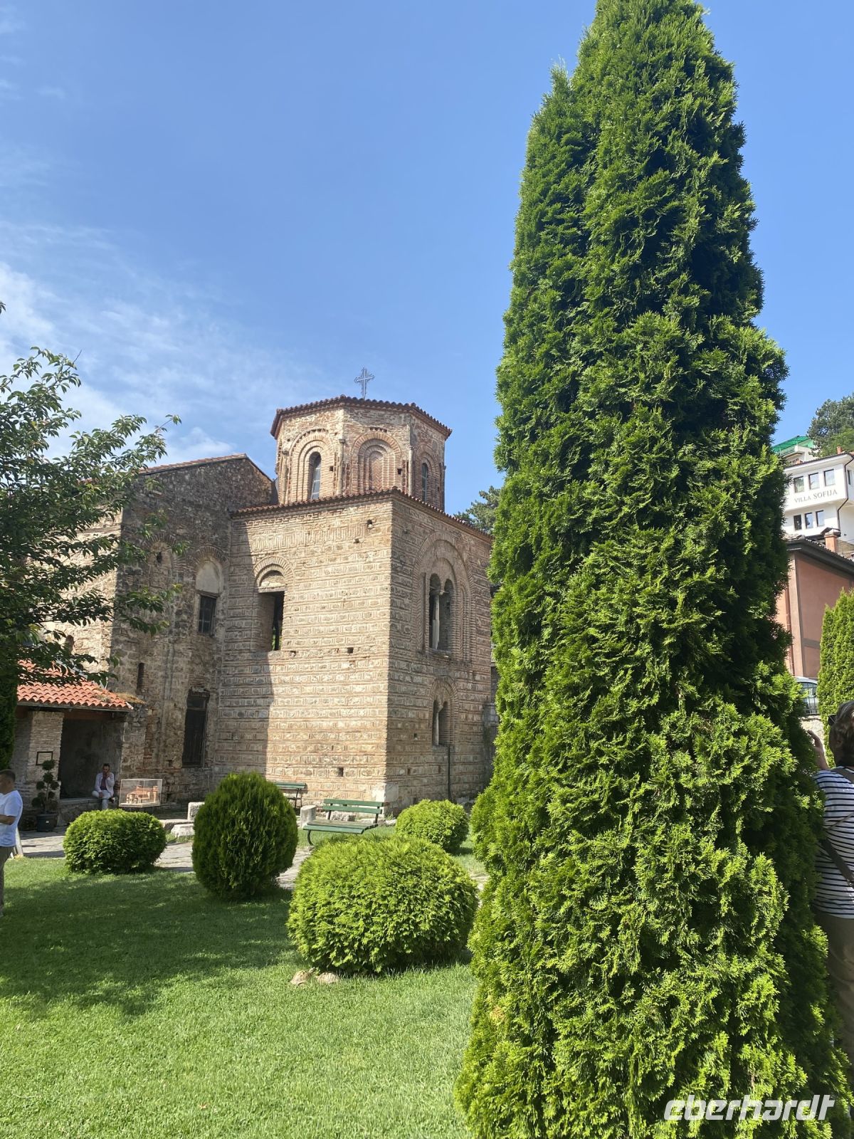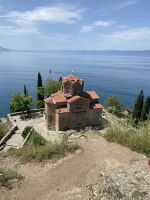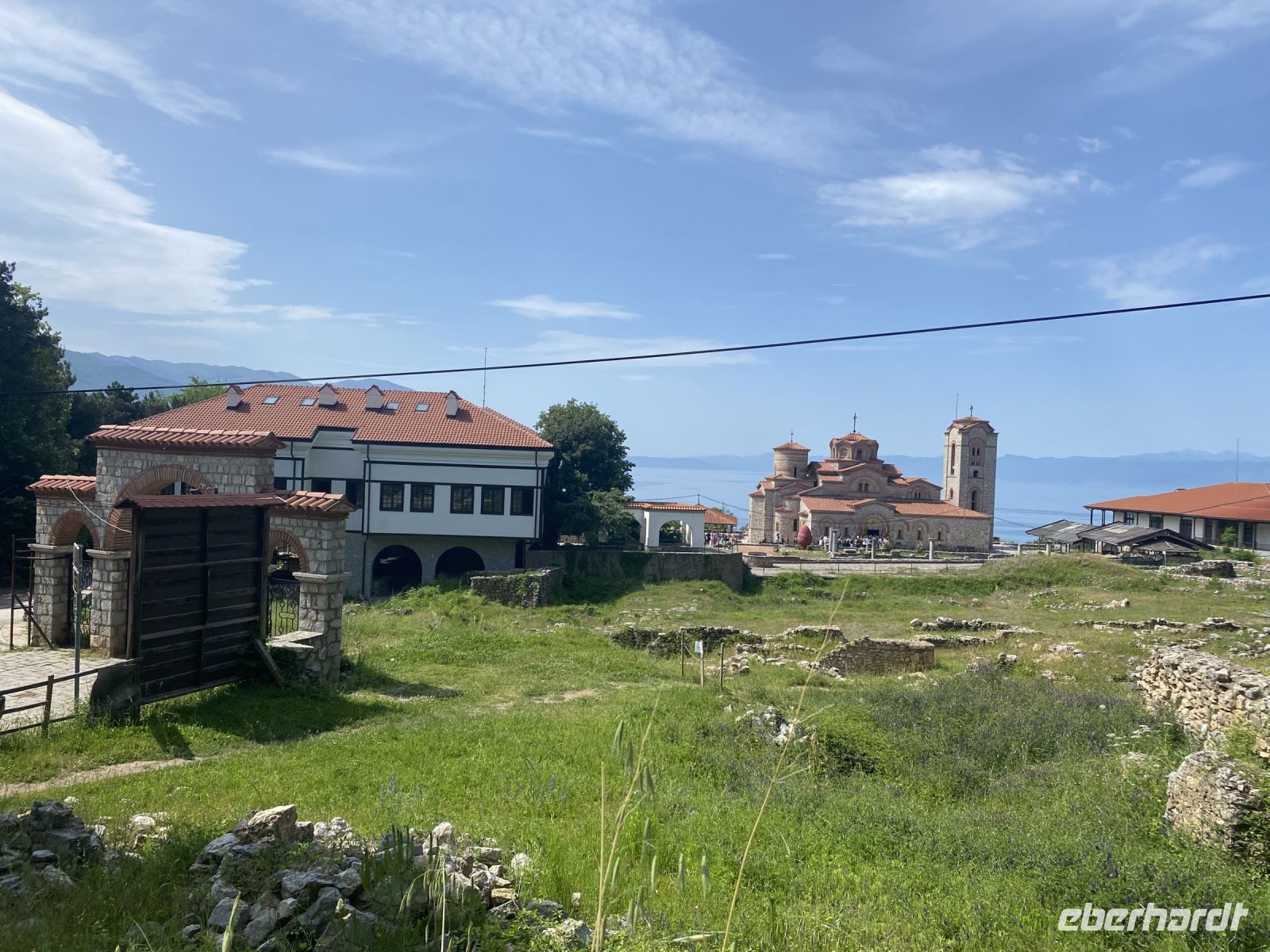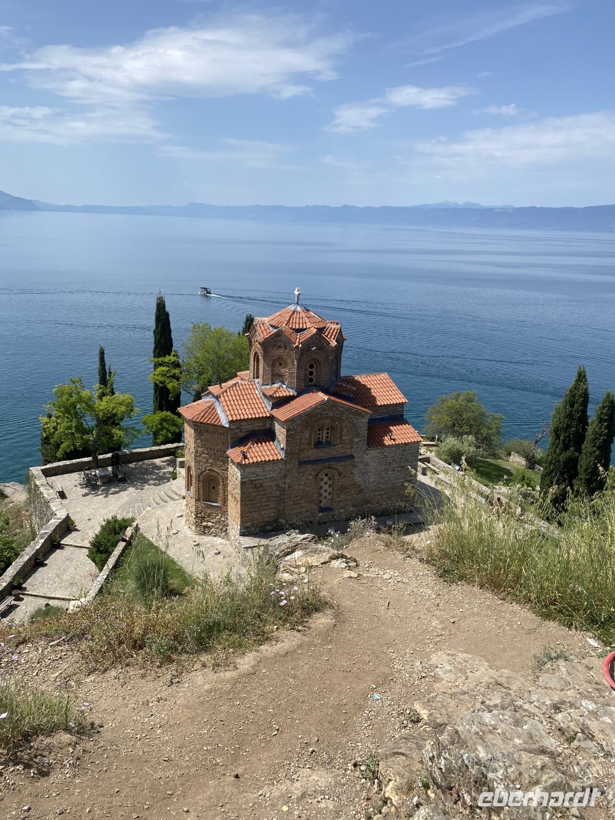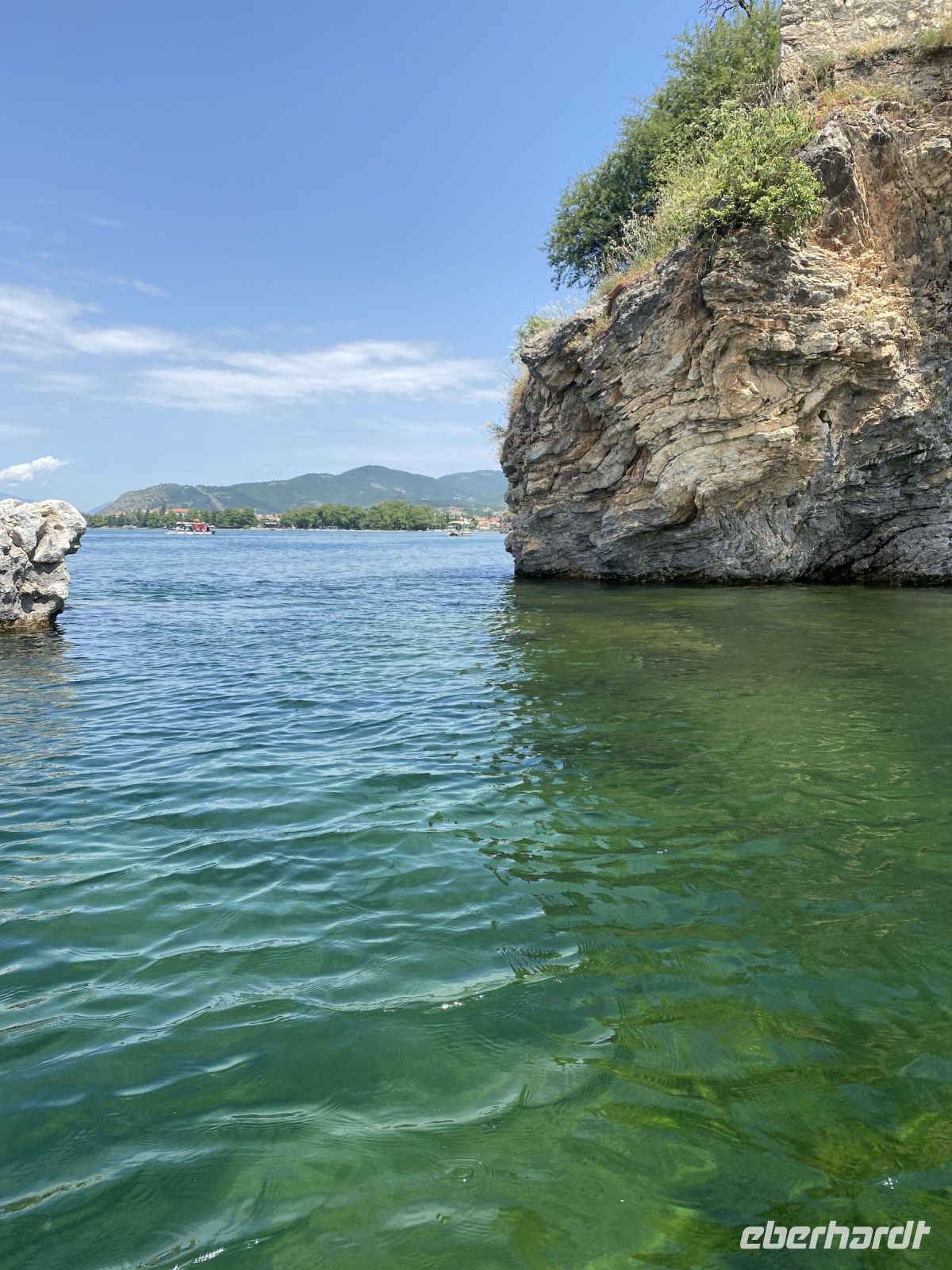 Ganz oben angelangt, genießen wir den wunderschönen Rundblick über den See, die Stadt und zur Klementkirche. Durch ein Wäldchen kommen wir zur kleinen, aber sehr fotogenen Kirche Johannes von Kaneo. Mit dem See im Hintergrund bietet sie ein wirkliches Postkartenmotiv. Da alle schon etwas erschöpft wirken, spendiert Eberhardt Travel die Rückfahrt zur Stadt mit dem Boot und so bietet sich nochmals ein anderer Anblick von Kirche und See. Die offizielle Führung ist damit beendet und jeder kann nun den Nachmittag nach eigenen Wünschen verbringen.
