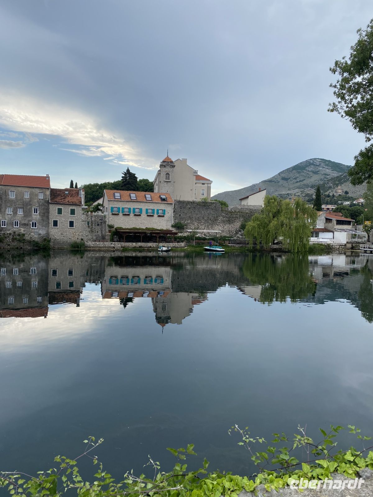 Der letzte Abschnitt dieses Reisetages bringt uns noch nach Trebinje, einer kleinen Stadt nahe der Grenze zu Montenegro. Es regnet etwas, aber wir lassen uns nicht davon abhalten, nach dem Einchecken im Hotel "Bellevue" noch einen kleinen Stadtspaziergang entlang des Flusses Trebisnjica zu unternehmen. Klar und ruhig fließt das Wasser des mit 93,8 km längsten Karstflusses durch die Stadt und gelangt unterirdisch zur Neretva sowie über Karstquellen ins Mittelmeer.