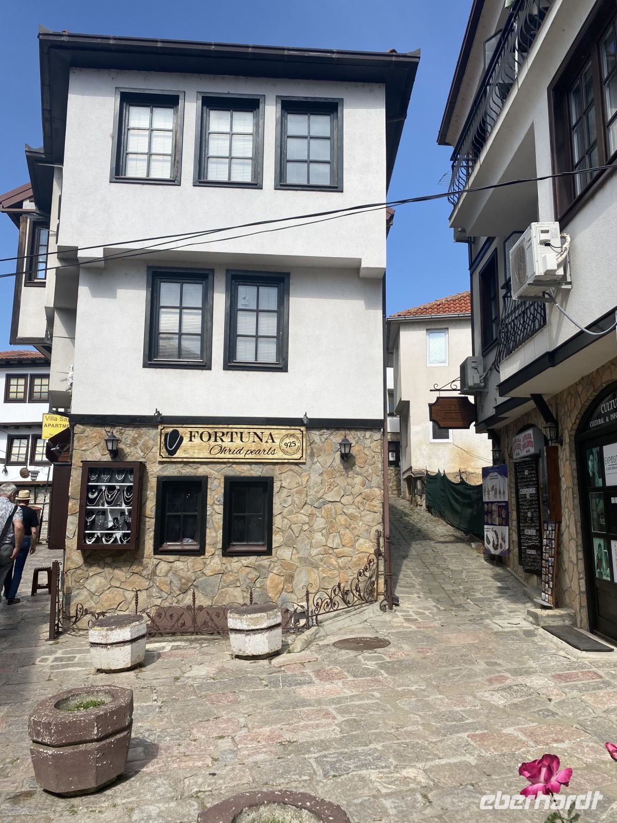 Wir gehen in die Altstadt, malerisch am Ohridsee gelegen. Ohrid wird auch Stadt des Lichts genannt und strahlend hell ist der Tag wirklich. Der See liegt glatt und spiegelklar vor uns. Er ist fast 300 m tief und hat eine hohe Wasserqualität. In ihm leben die berühmten, sehr wohlschmeckenden Ohridforellen, aus den Schuppen einer kleinen Fischart werden die Ohridperlen angefertigt.
